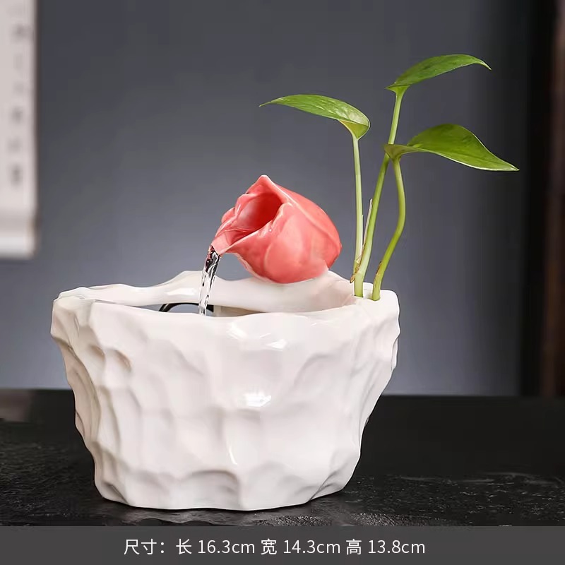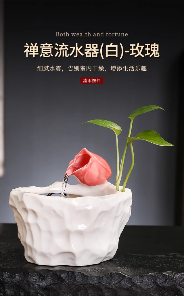 • 피치 핑크 장미 흐르는 물 + 흰색 탱크 [물 펌프 + 유색 돌 + 녹색 식물 보내기]