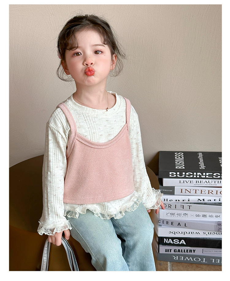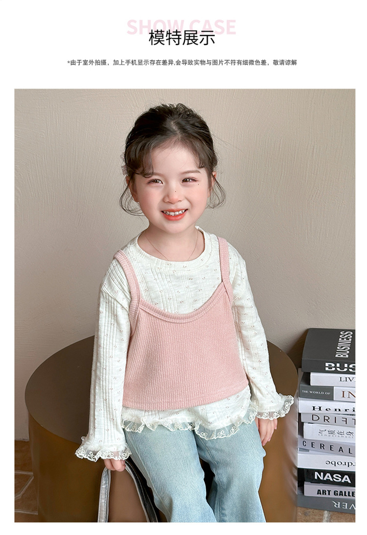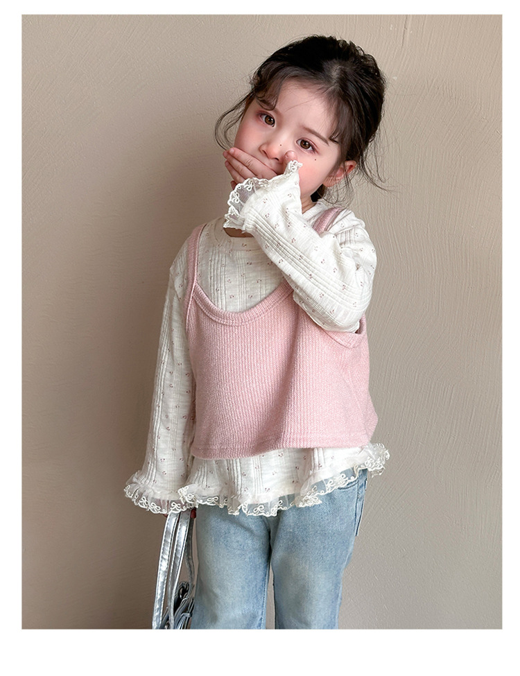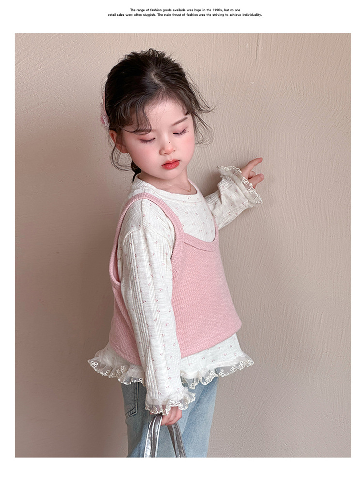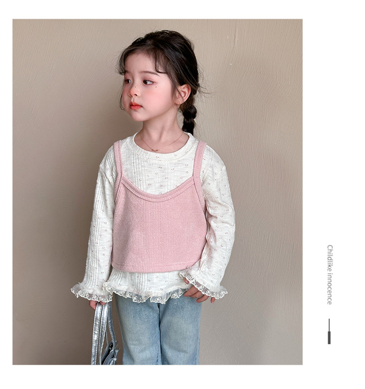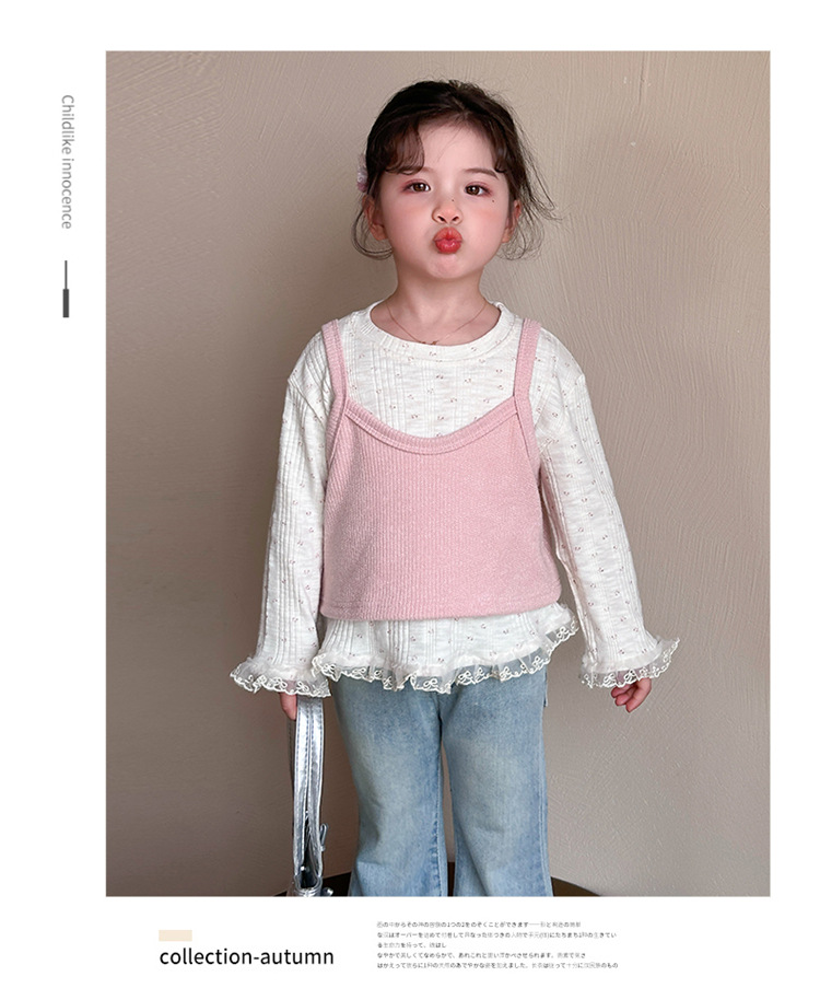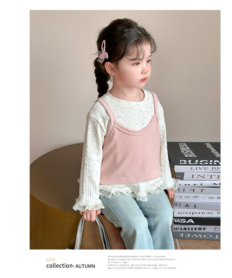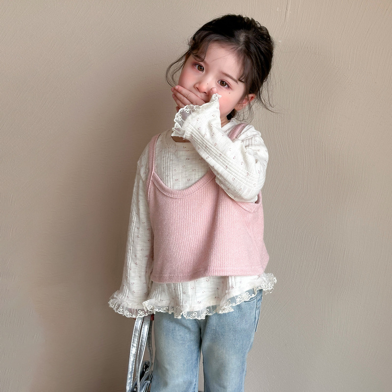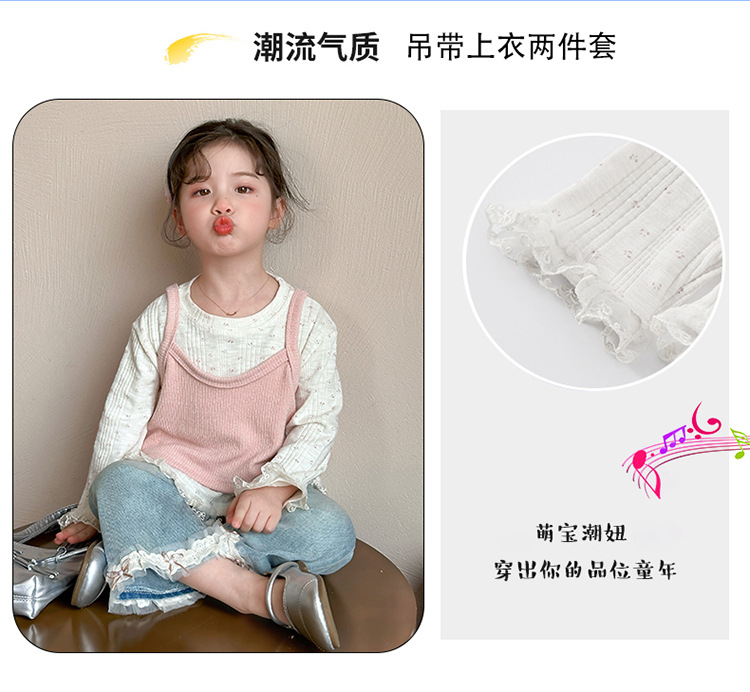 소녀 핑크 꽃 레이스 슬링 탑 세트 2025 년 봄과 가을 새로운 소녀 세련된 투피스 세트스토어 가기