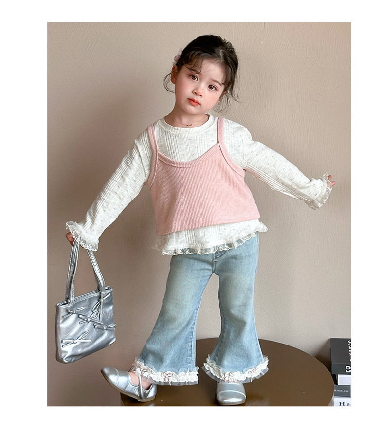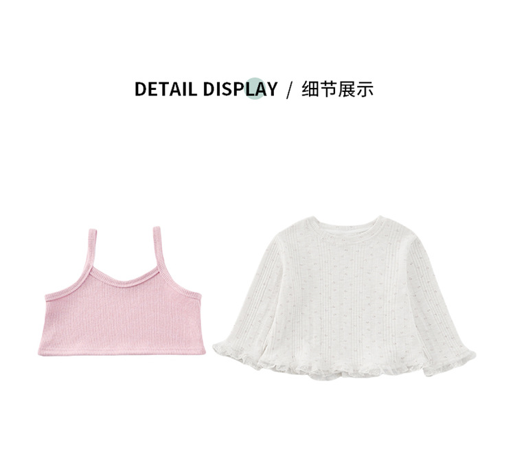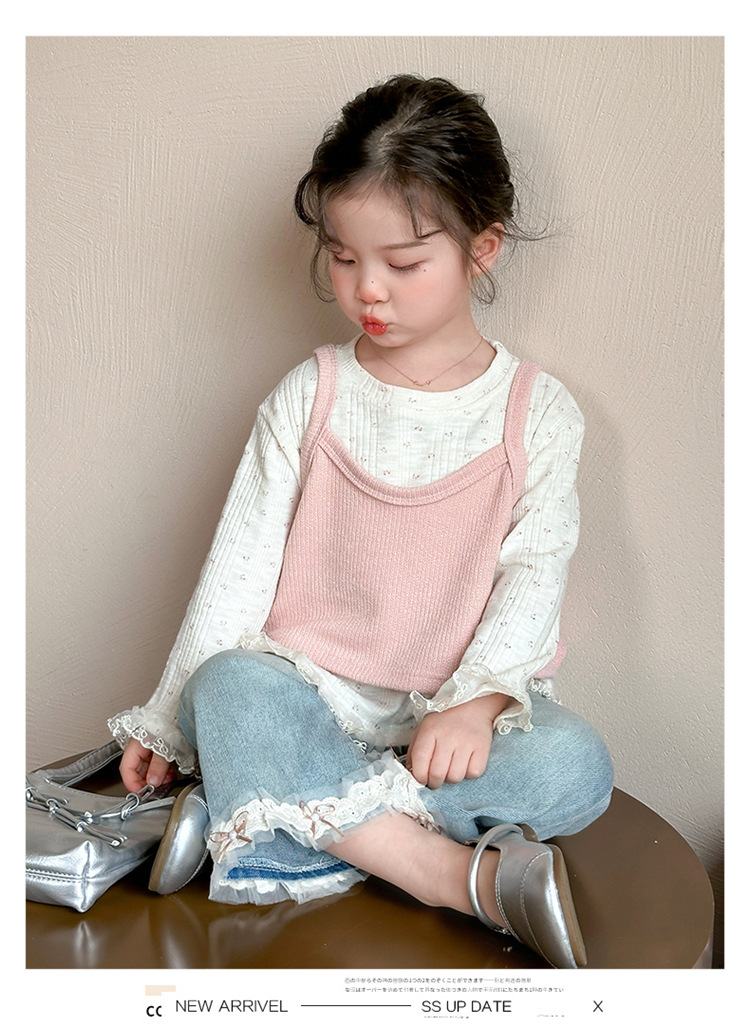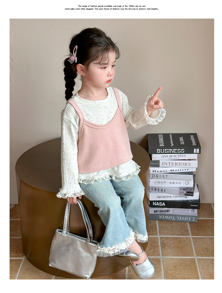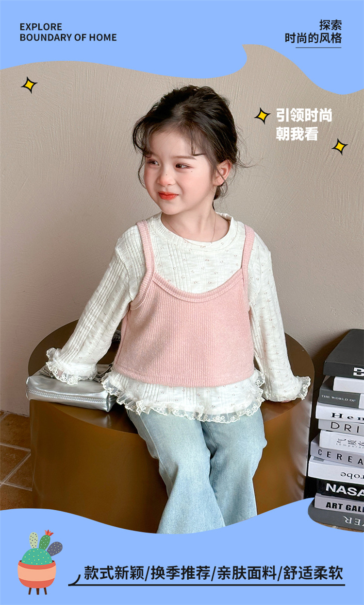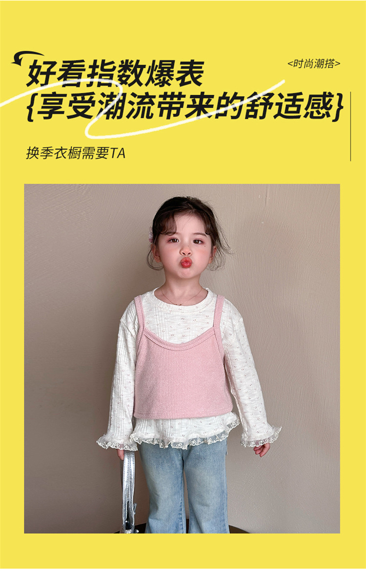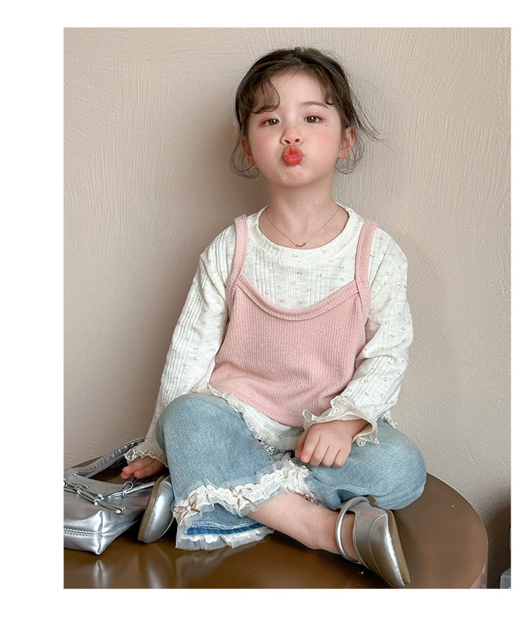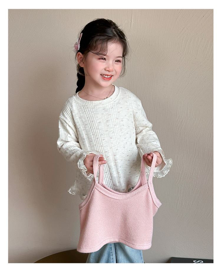 소녀 핑크 꽃 레이스 슬링 탑 세트 2025 년 봄과 가을 새로운 소녀 세련된 투피스 세트스토어 가기