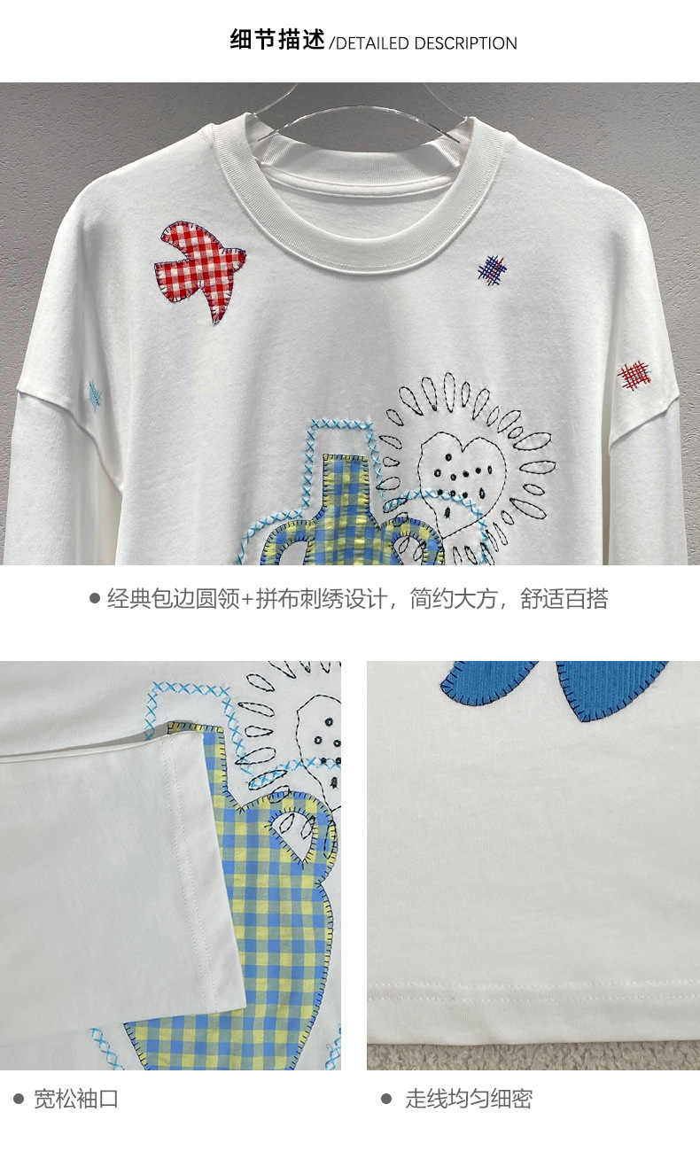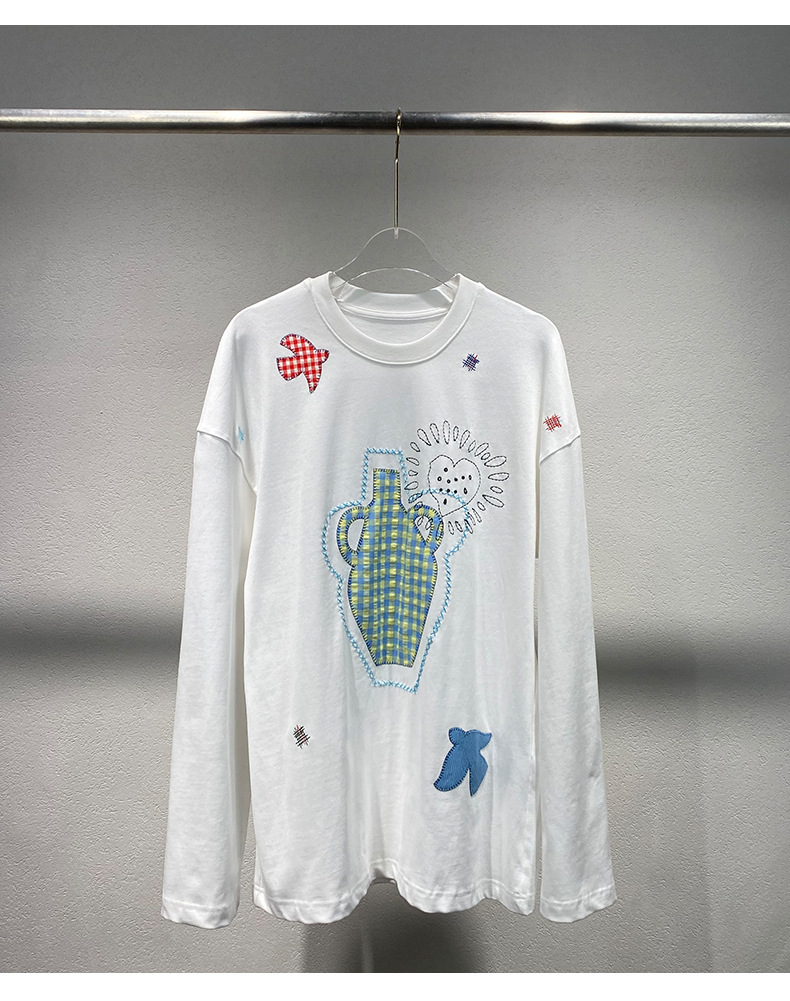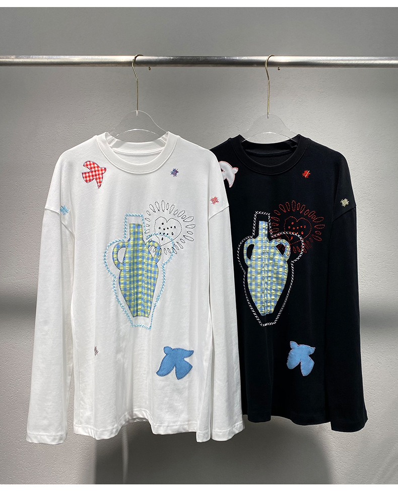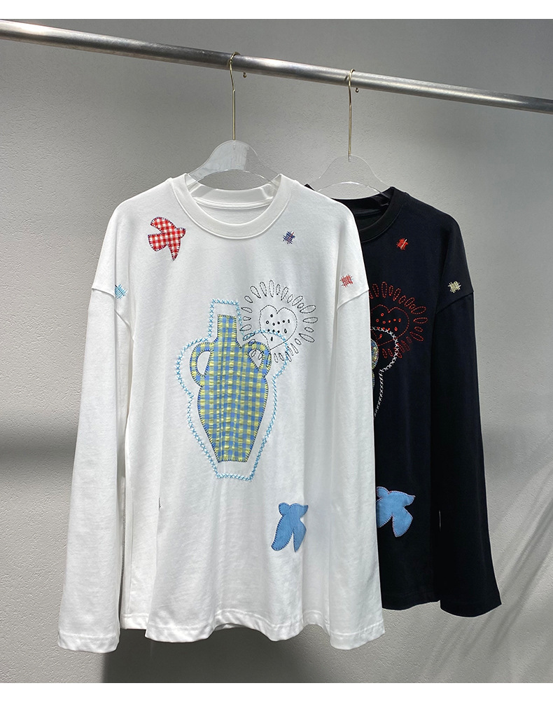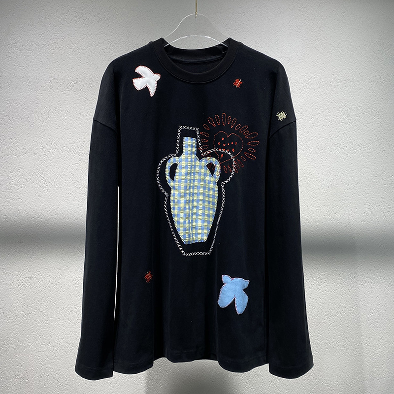 스팟 2025 봄 여름 새로운 틈새 패치워크 자수 블랙 긴팔 티셔츠 루즈 슬리밍 여성용 다용도 탑