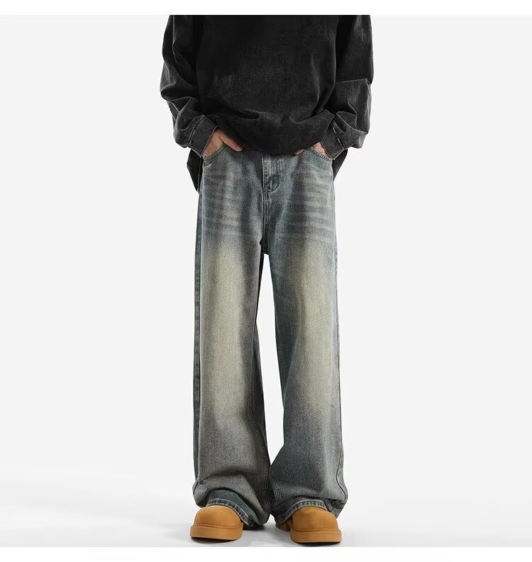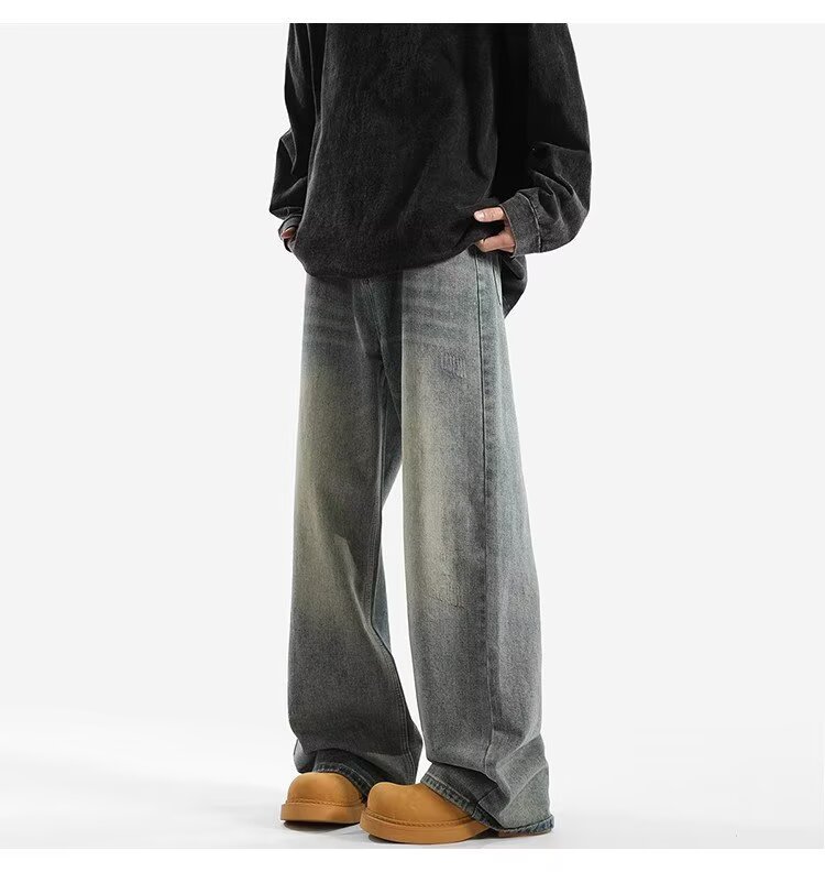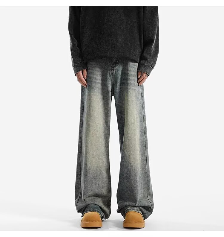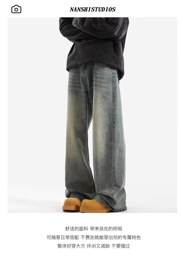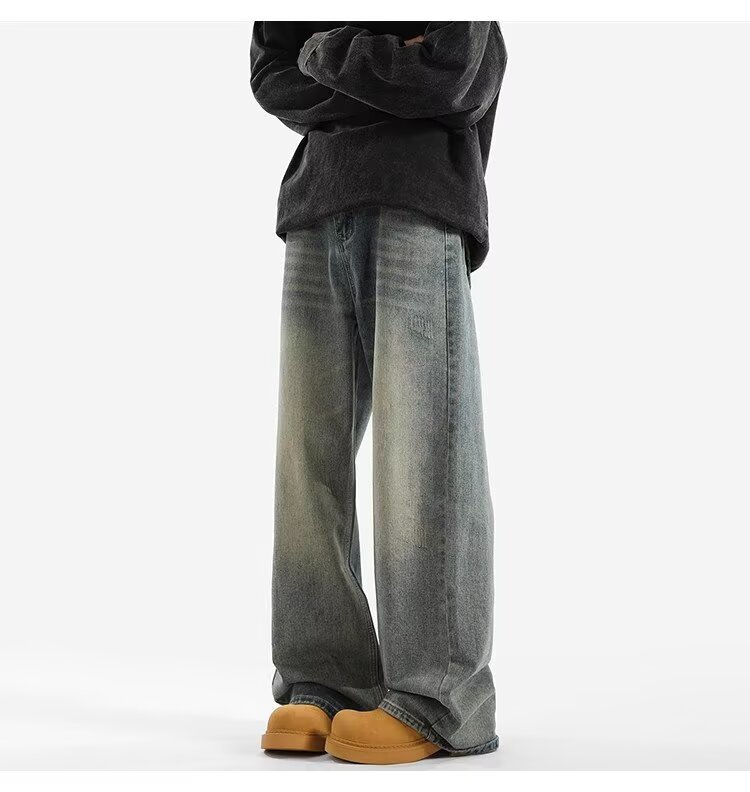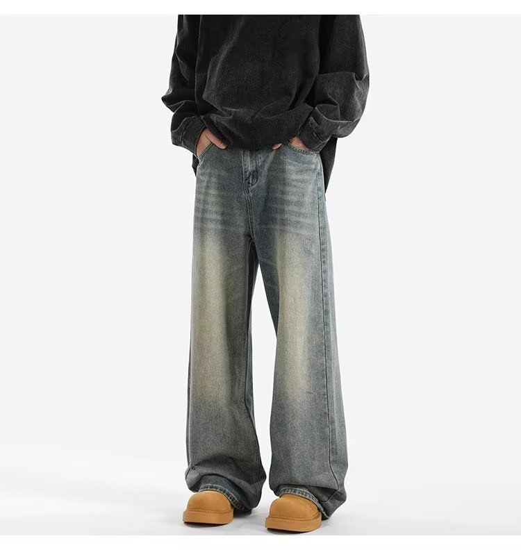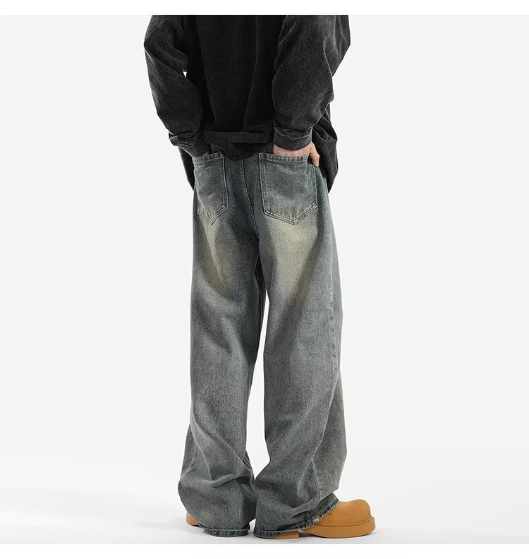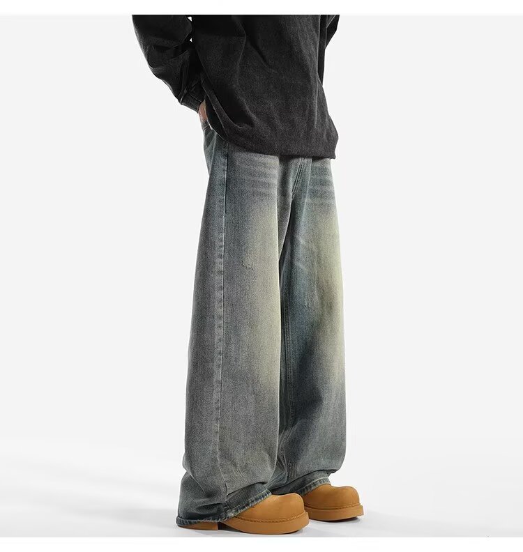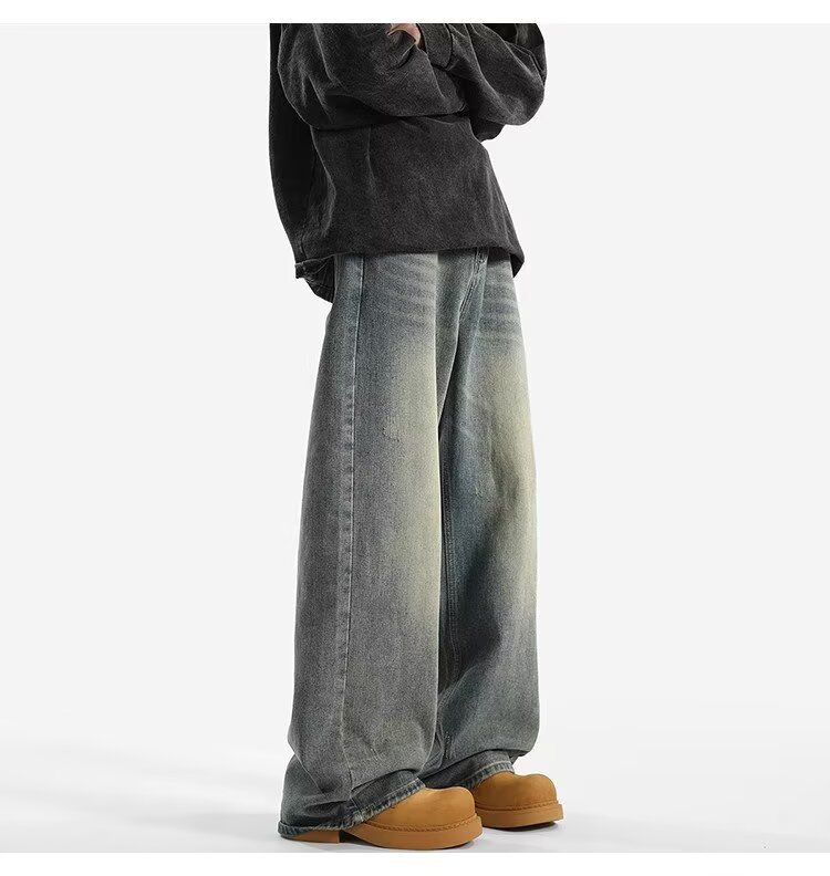 봄과 가을 씻은 미국 스타일 레트로 청바지 트렌디 남성 봄 트렌디 브랜드 무거운 무게 와이드 레그 바지 느슨한 스트레이트 레그 바지스토어 가기