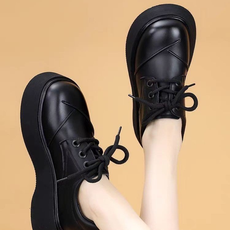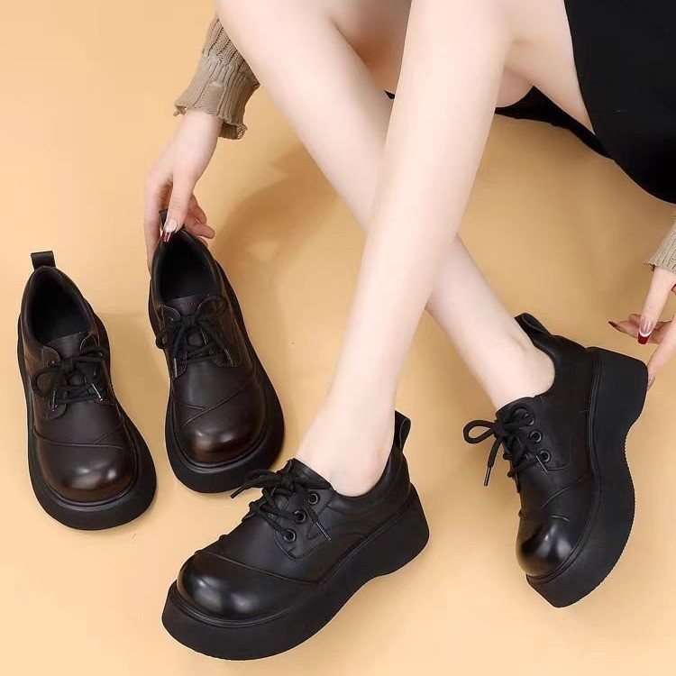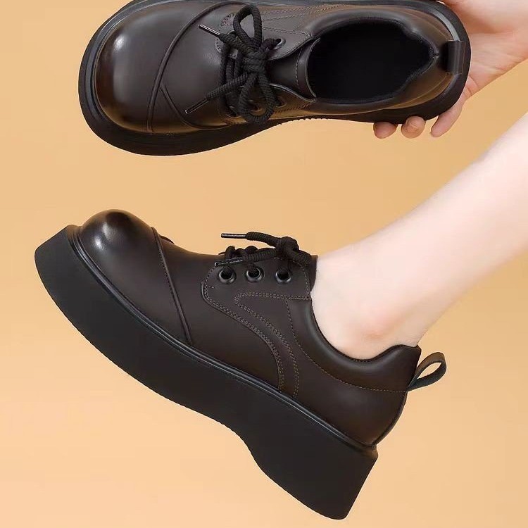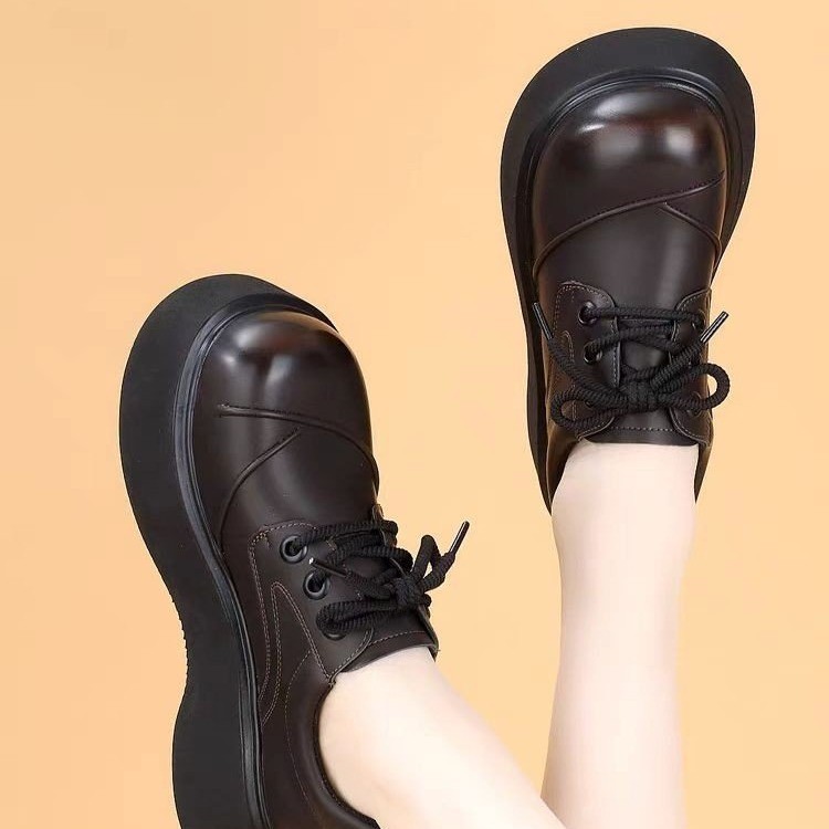 진짜 부드러운 가죽 두꺼운 둥근 발가락 레이스 업 가죽 신발 여성의 2025 년 봄과 가을 새로운 싱글 레이어 신발 올 매치 머핀 영국 로퍼스토어 가기
