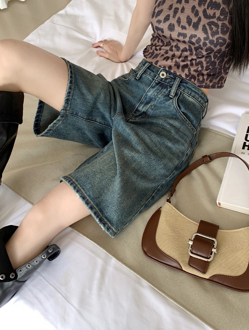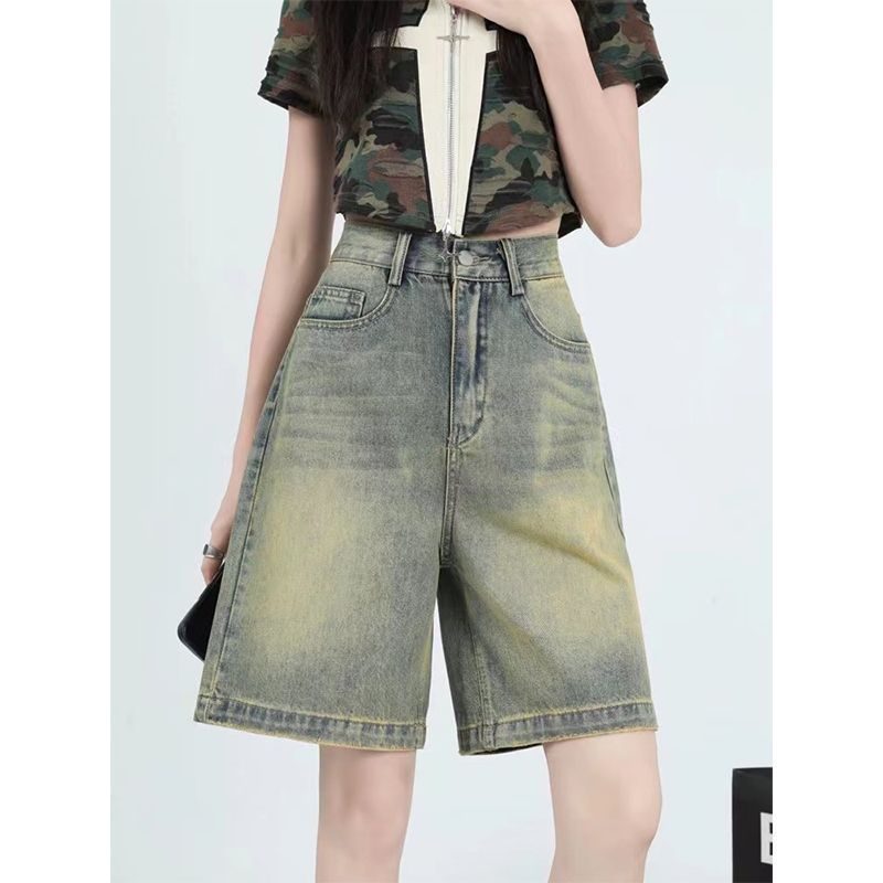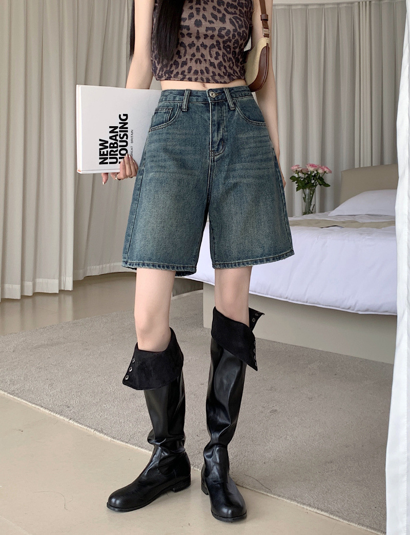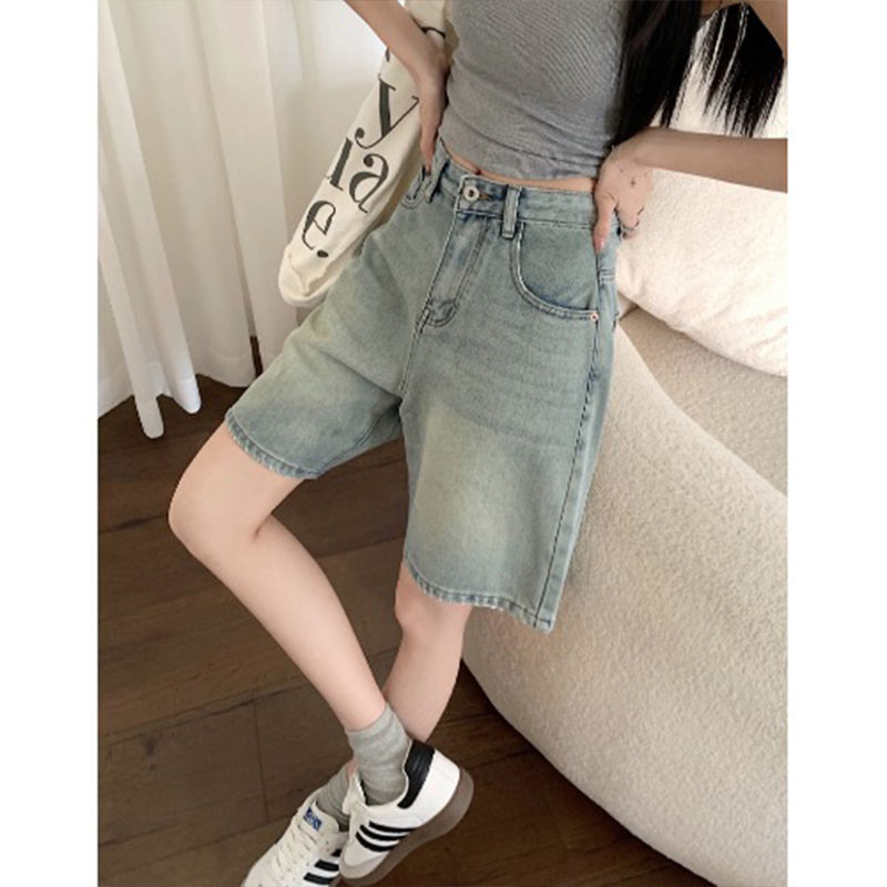 빈티지 세탁 스트레이트 데님 반바지 여성의 높은 허리 슬리밍 느슨한 여름 얇은 플러스 사이즈 통통녀 넓은 다리 바지스토어 가기