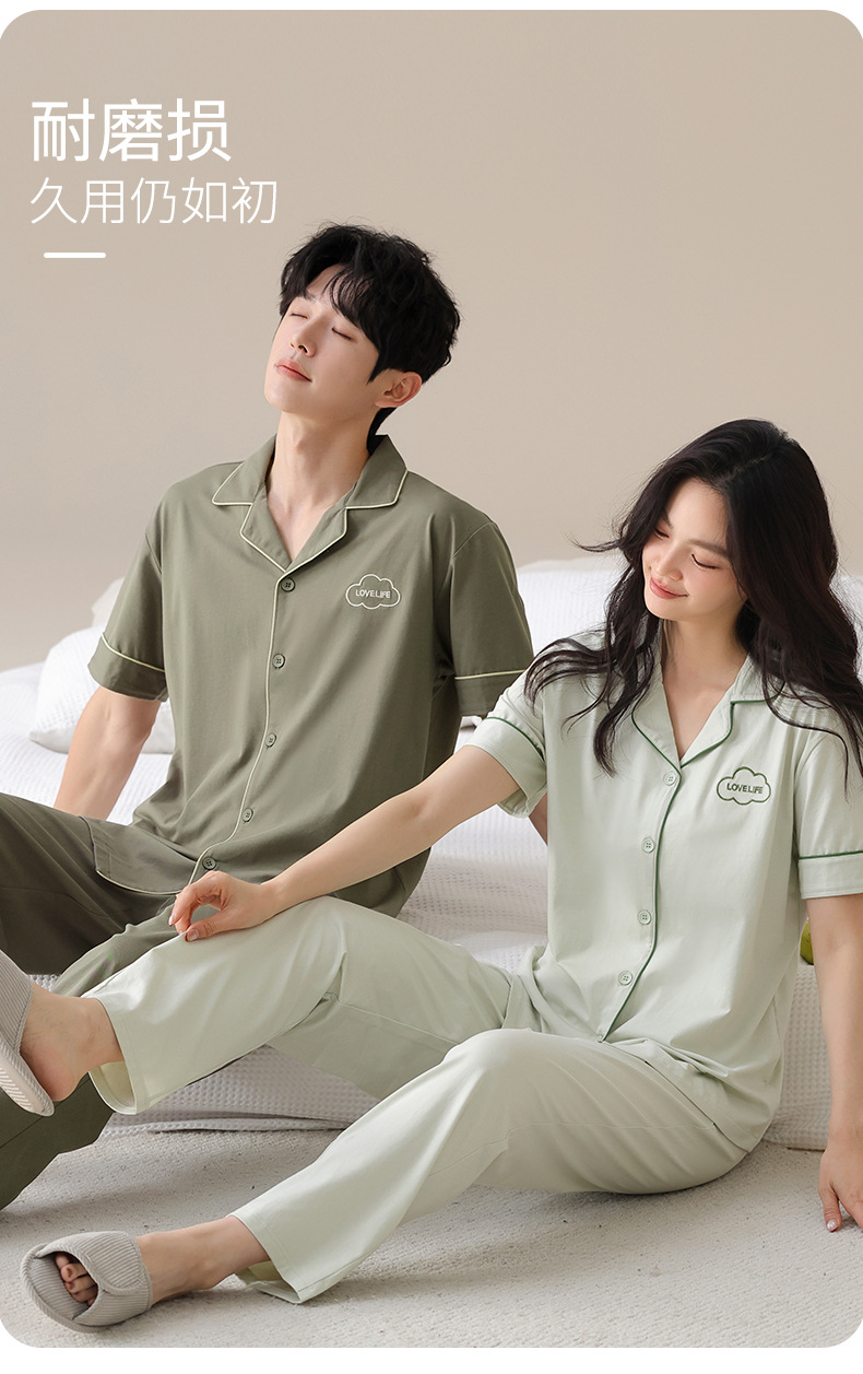 잠옷 커플의 봄과 여름 순면 반팔 바지 남자 카디건 얇은 여름 여성의 멋진 홈 의류 세트
