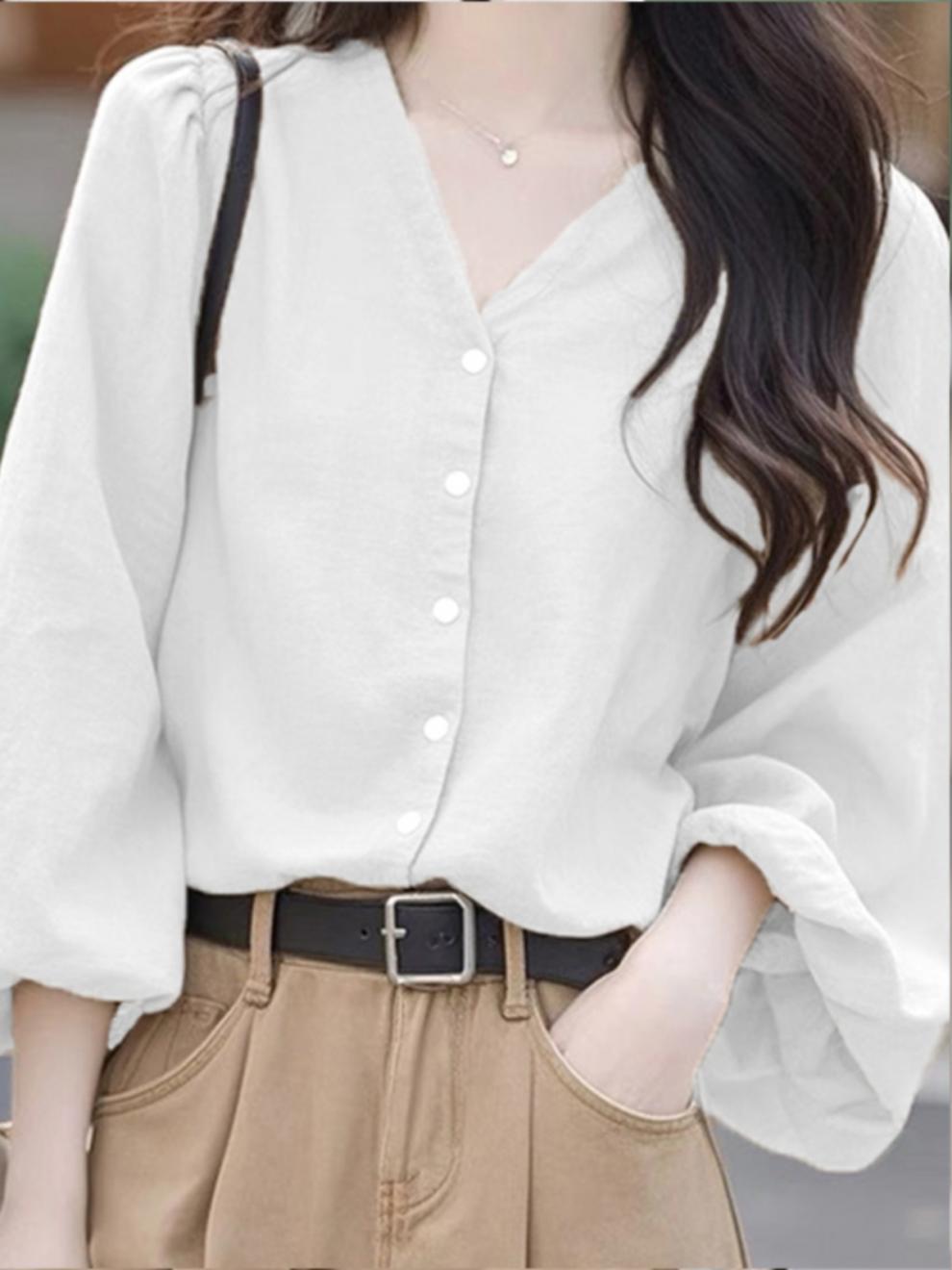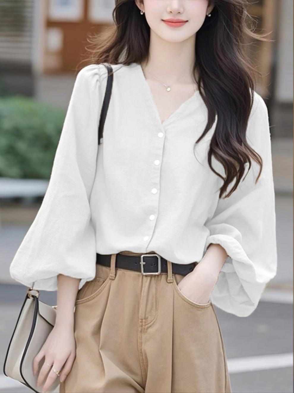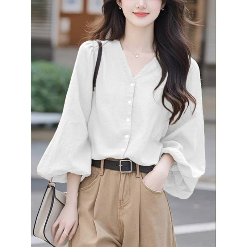 화이트 V 넥 랜턴 슬리브 최고 여성의 2024 년 새로운 이른 가을 서양식 하이 엔드 착용 프렌치 세련된 셔츠스토어 가기