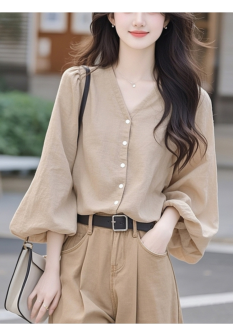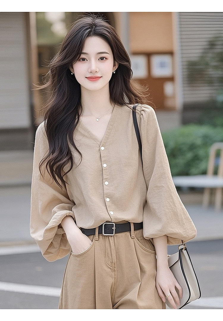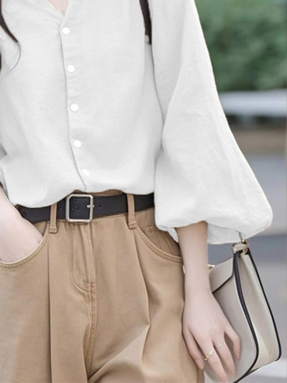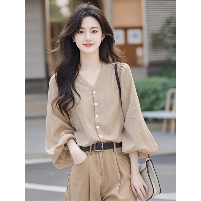 화이트 V 넥 랜턴 슬리브 최고 여성의 2024 년 새로운 이른 가을 서양식 하이 엔드 착용 프렌치 세련된 셔츠스토어 가기