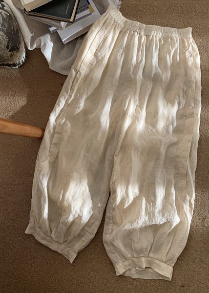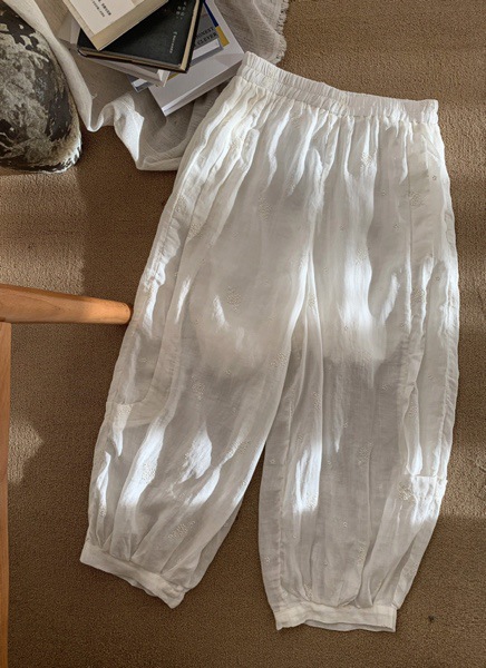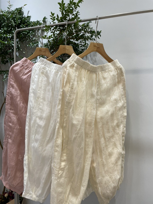 예술적 기질 순수한 색 자수 탄성 허리 넓은 다리 바지 여성의 2025 봄 새로운 느슨한 하렘 바지스토어 가기