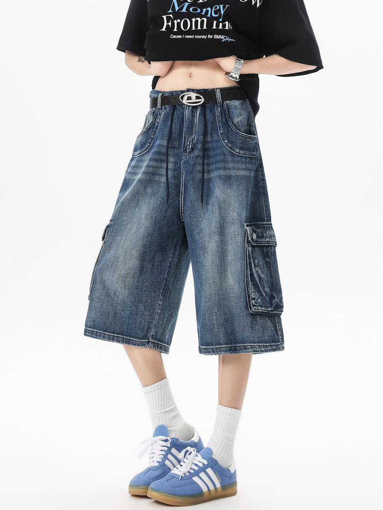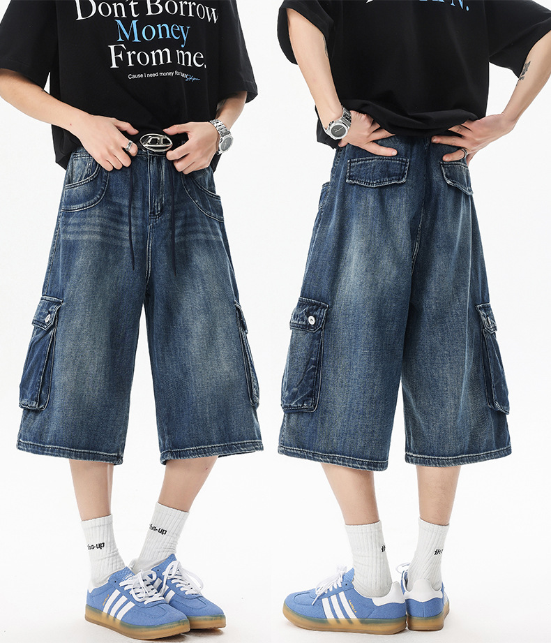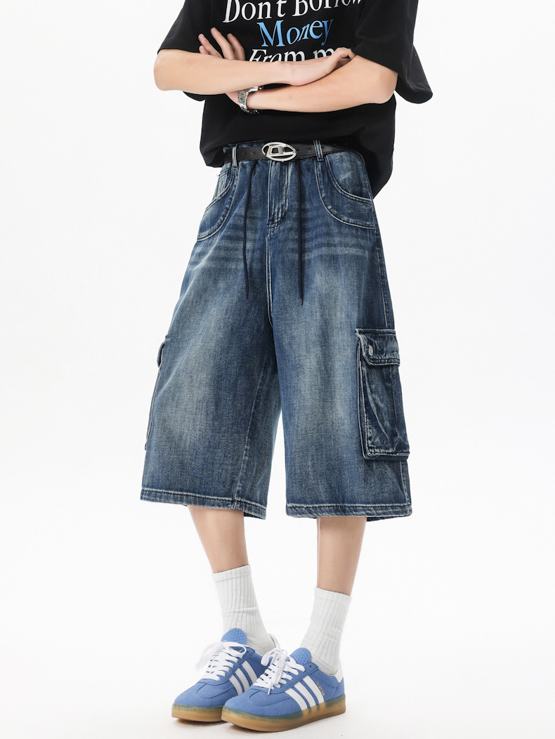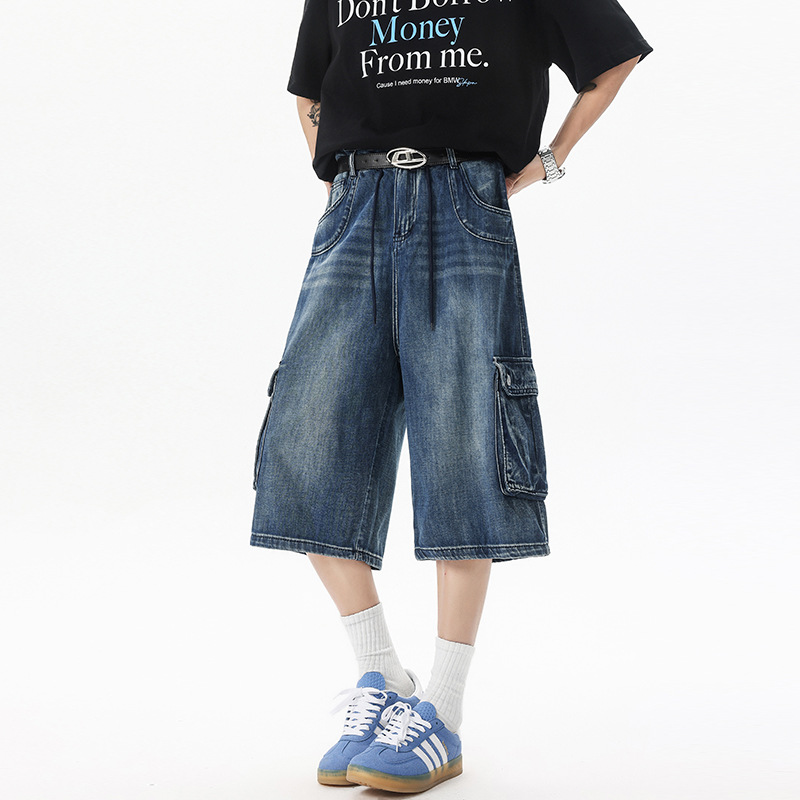 아메리칸 스타일 레트로 씻은 고양이, 넓은 다리 데님 반바지 남자 새 여름 느슨한 5 점 중간 바지 카프리 바지