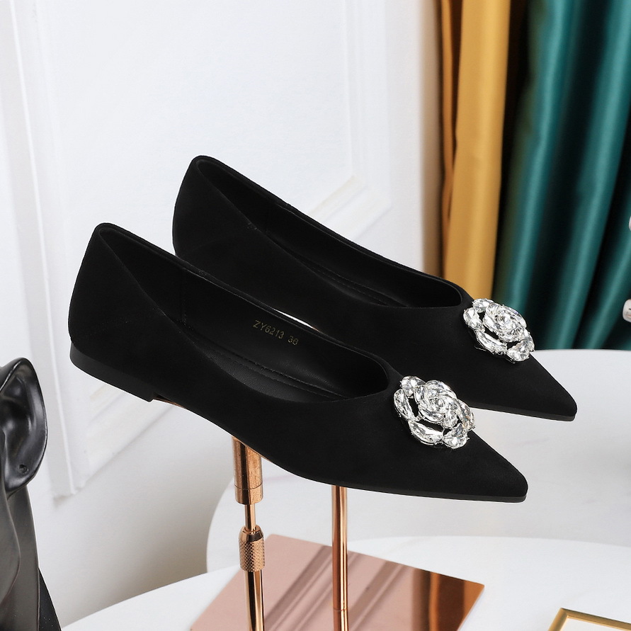 6213-K102 한국 스타일 꽃 플랫 힐 신발 뾰족한 발가락 입 라인스톤 여성 신발 우아한 스웨이드 플랫스토어 가기