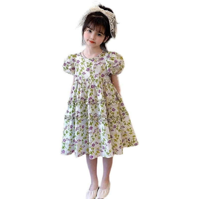 소녀의 원피스 꽃 크루 넥 짧은 소매 원피스 공주 원피스 25 여름 새로운 대외 무역 아동복 3-8 년