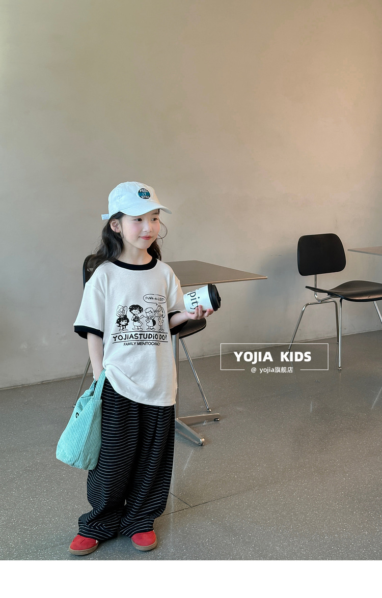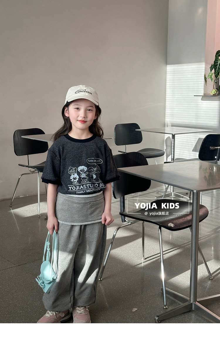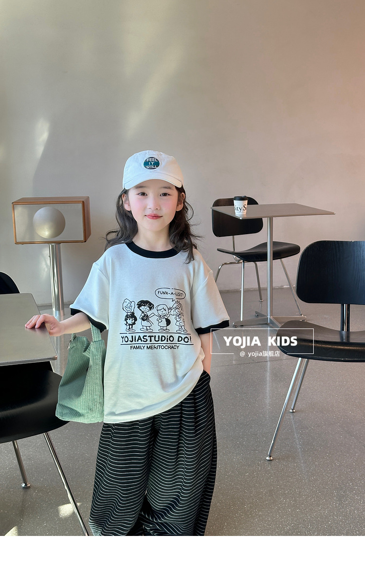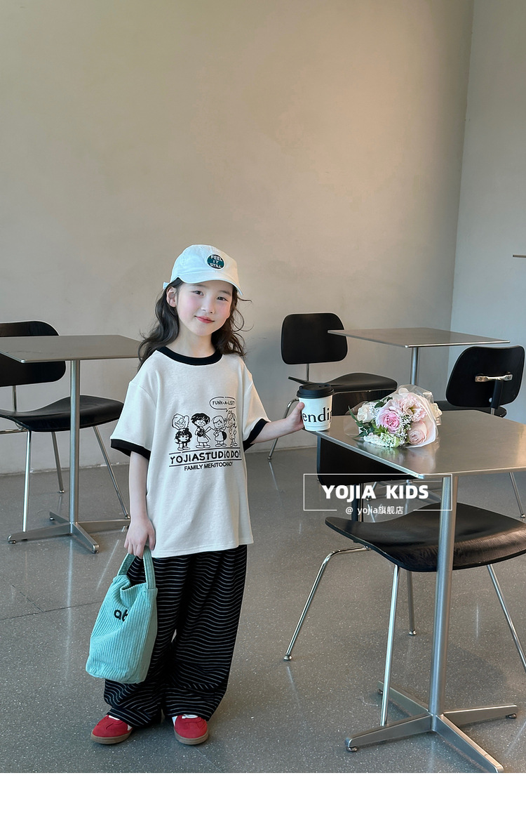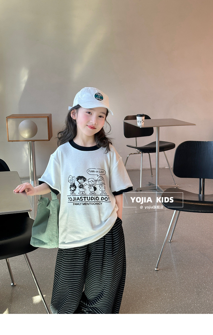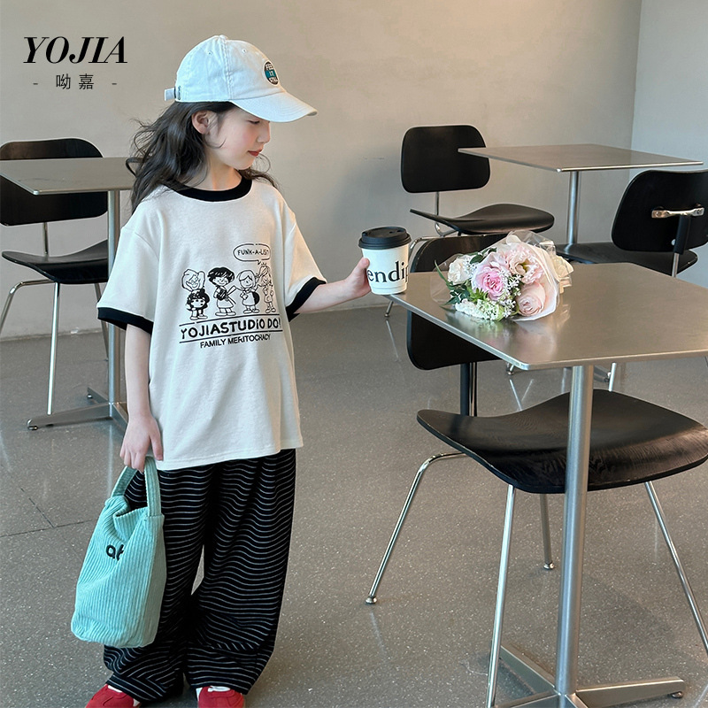 YOJIA 소녀 반팔 봄과 여름 2025 새로운 도착 한국 스타일 서양식 작은 소녀 크루 넥 티셔츠 어린이 티셔츠 여름 원피스스토어 가기