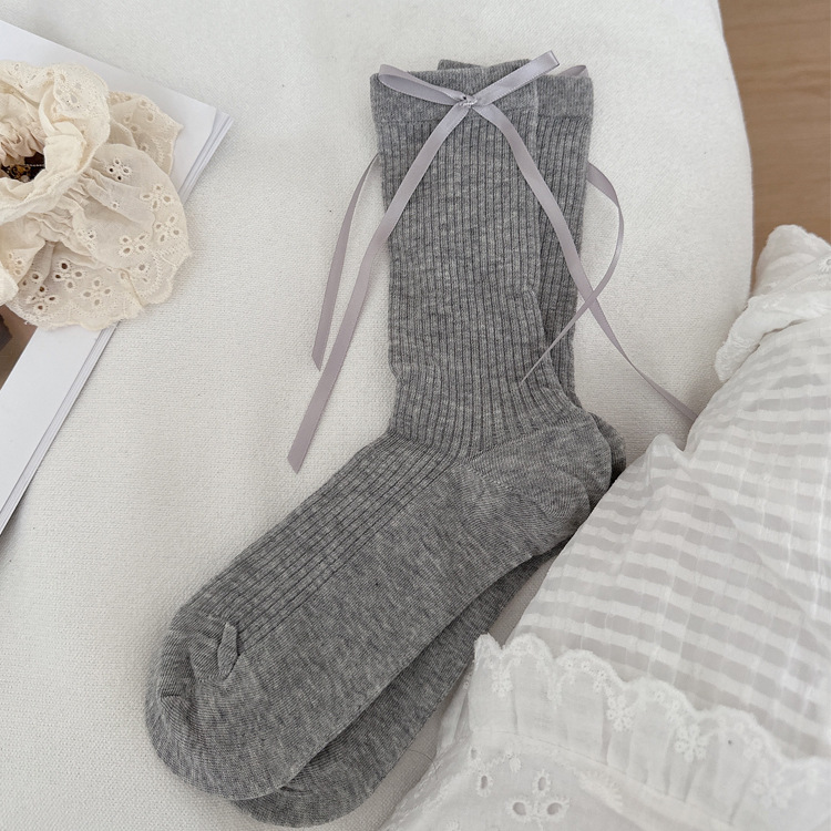 양말 여성 여름 얇은 한국 스타일 리본 활 메쉬 통기성 미드 양말 화이트 그레이 코튼 양말 미우 스타일 여성용 양말
