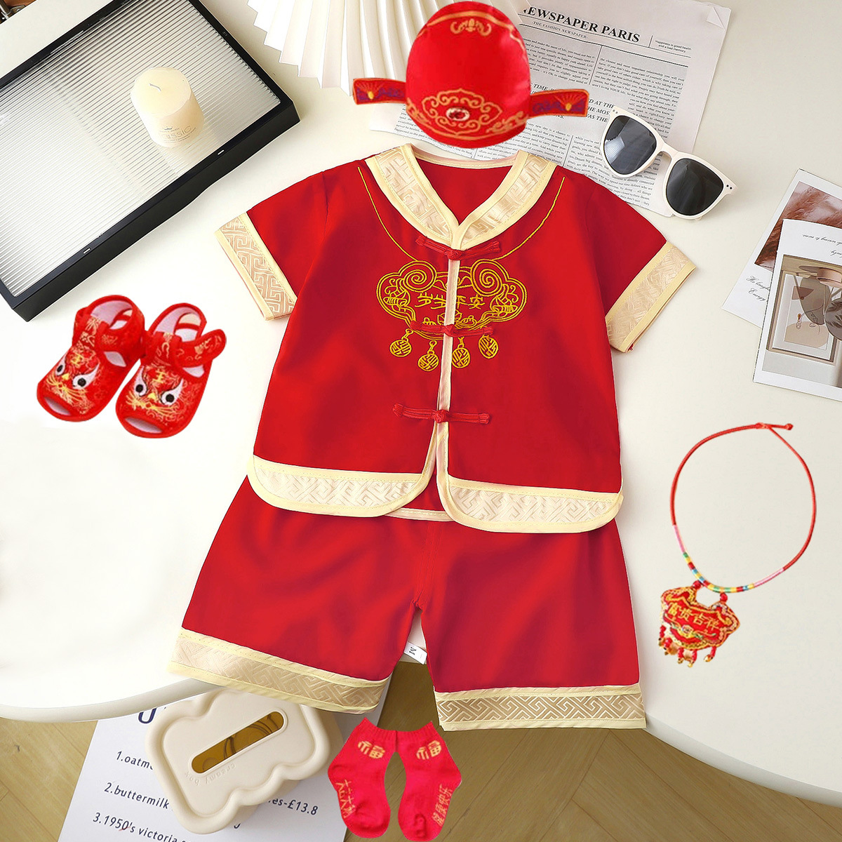 • 빨간색 자수 상서로운 자물쇠 반팔 슈트 + 신발
