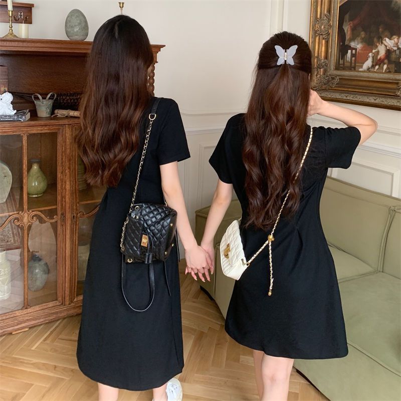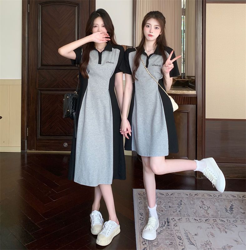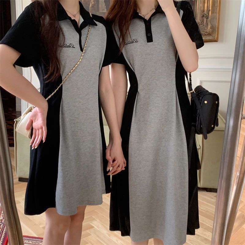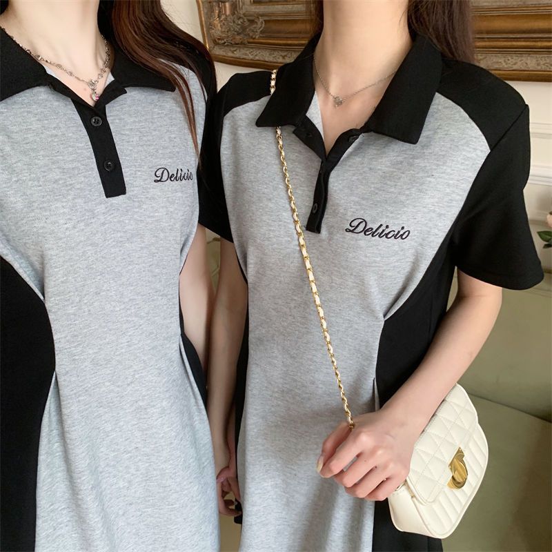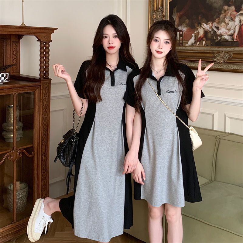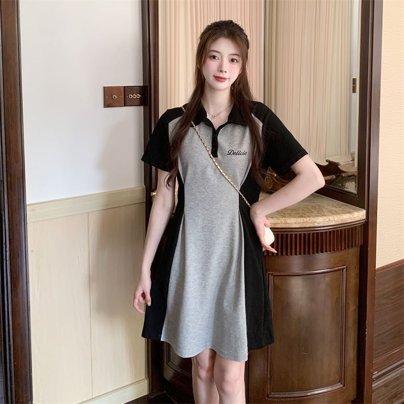 여름 플러스 사이즈 컬러 매칭 폴로 칼라 통통녀 반팔 티셔츠 원피스 여성용 허리 슬리밍 핫 걸 A 라인 스커트스토어 가기
