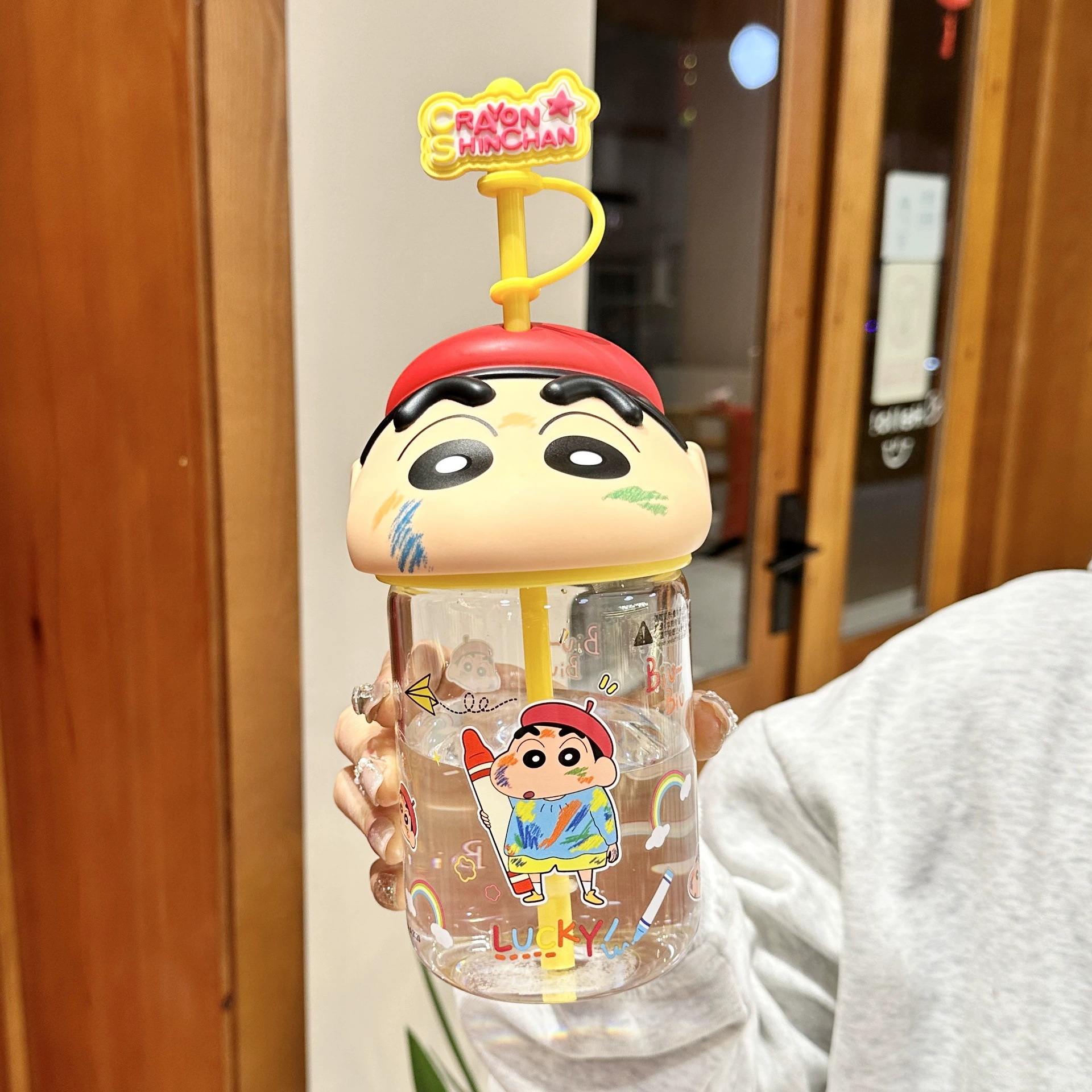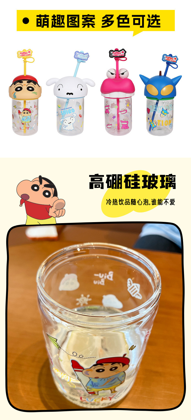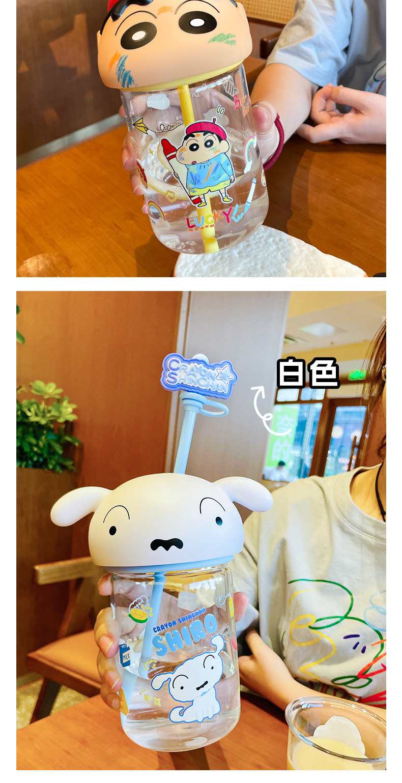 정품 크레용 작은 새로운 유리 워터 컵 2025 새로운 남성과 여성의 높은 색상 가치 귀여운 가정용 밀짚 컵 고온 저항