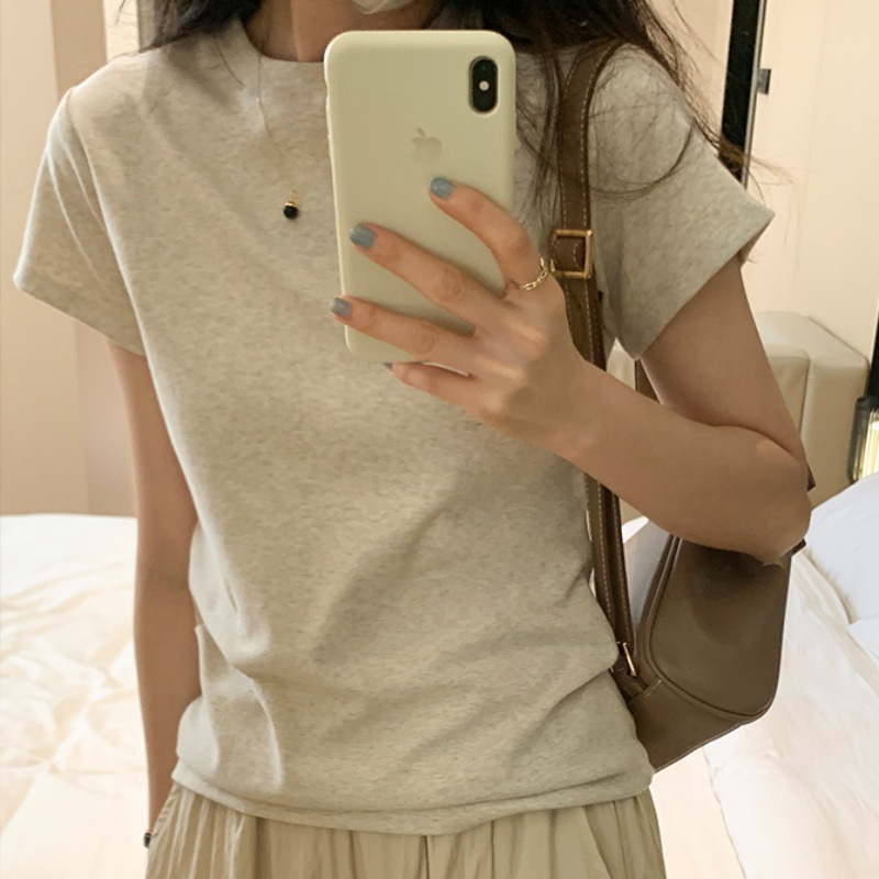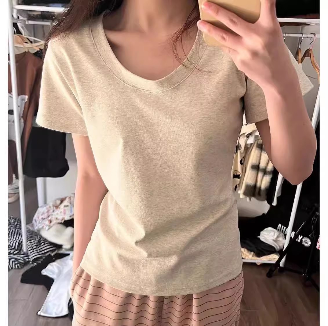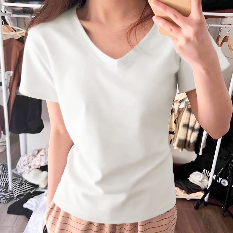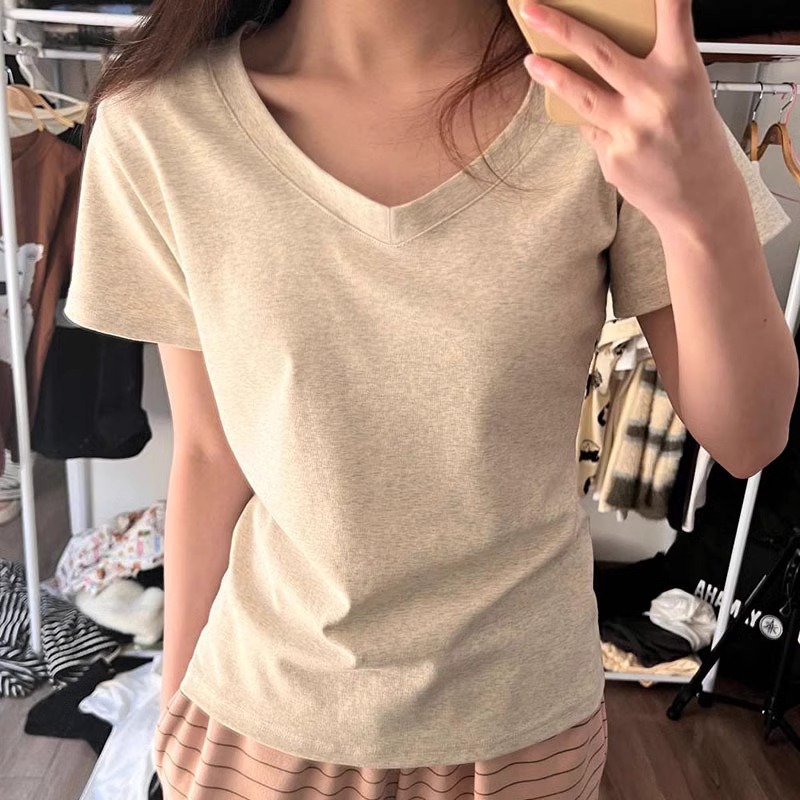 통근 어깨 반팔 V 넥 티셔츠 여성용 여름 얇은 퓨어 코튼 슬림 핏 슬림 핏 올 매치 그레이 스트레치 탑스토어 가기