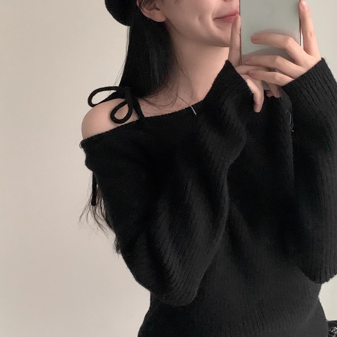 여성용 레드 레이스업 니트 가을 사선넥 오프숄더 리본 니치 슬림핏 우아한 상의 통근룩스토어 가기