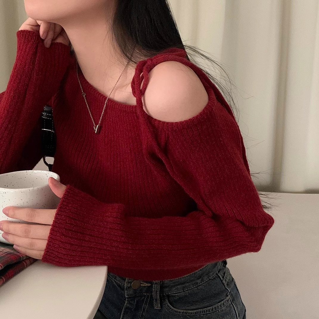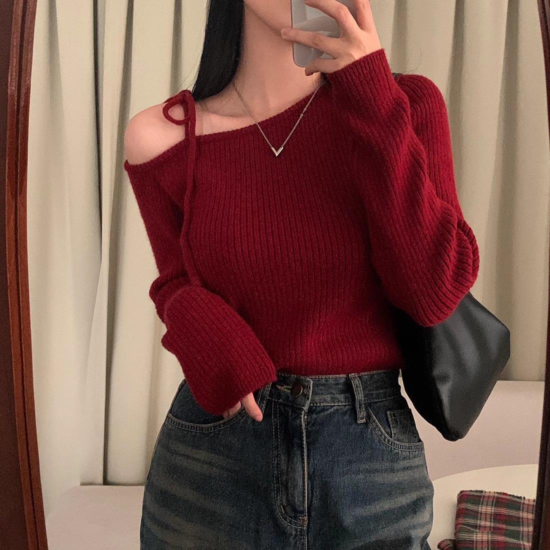 여성용 레드 레이스업 니트 가을 사선넥 오프숄더 리본 니치 슬림핏 우아한 상의 통근룩