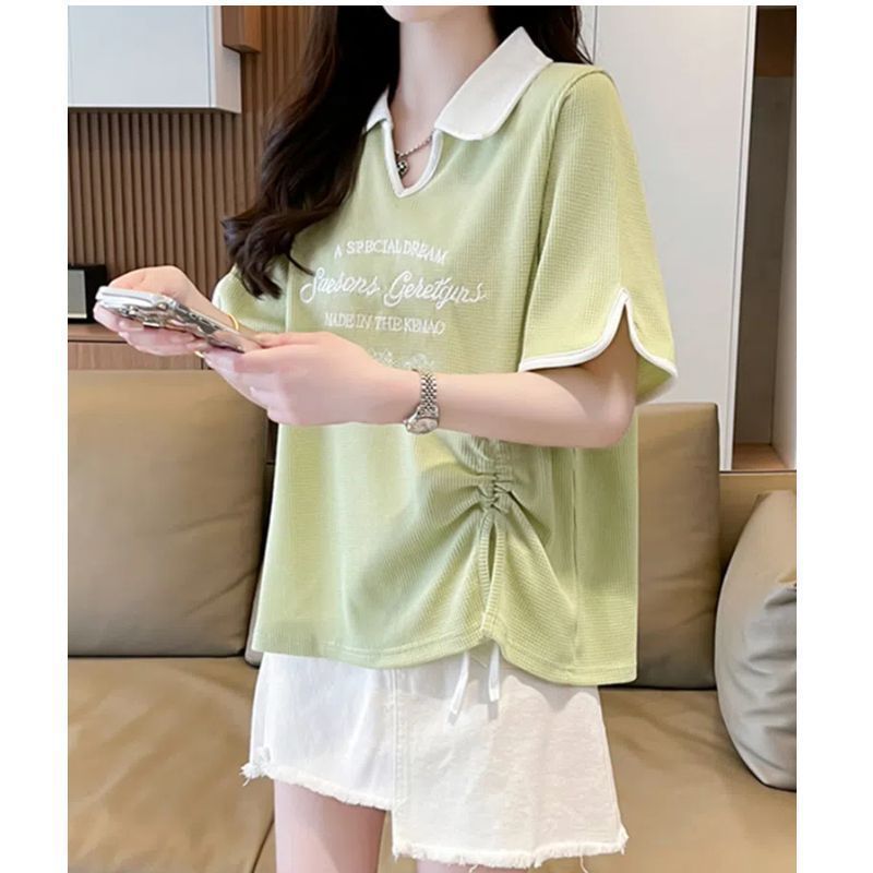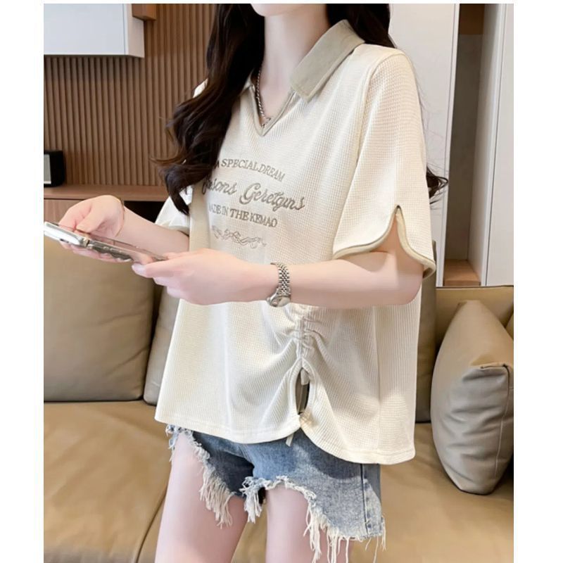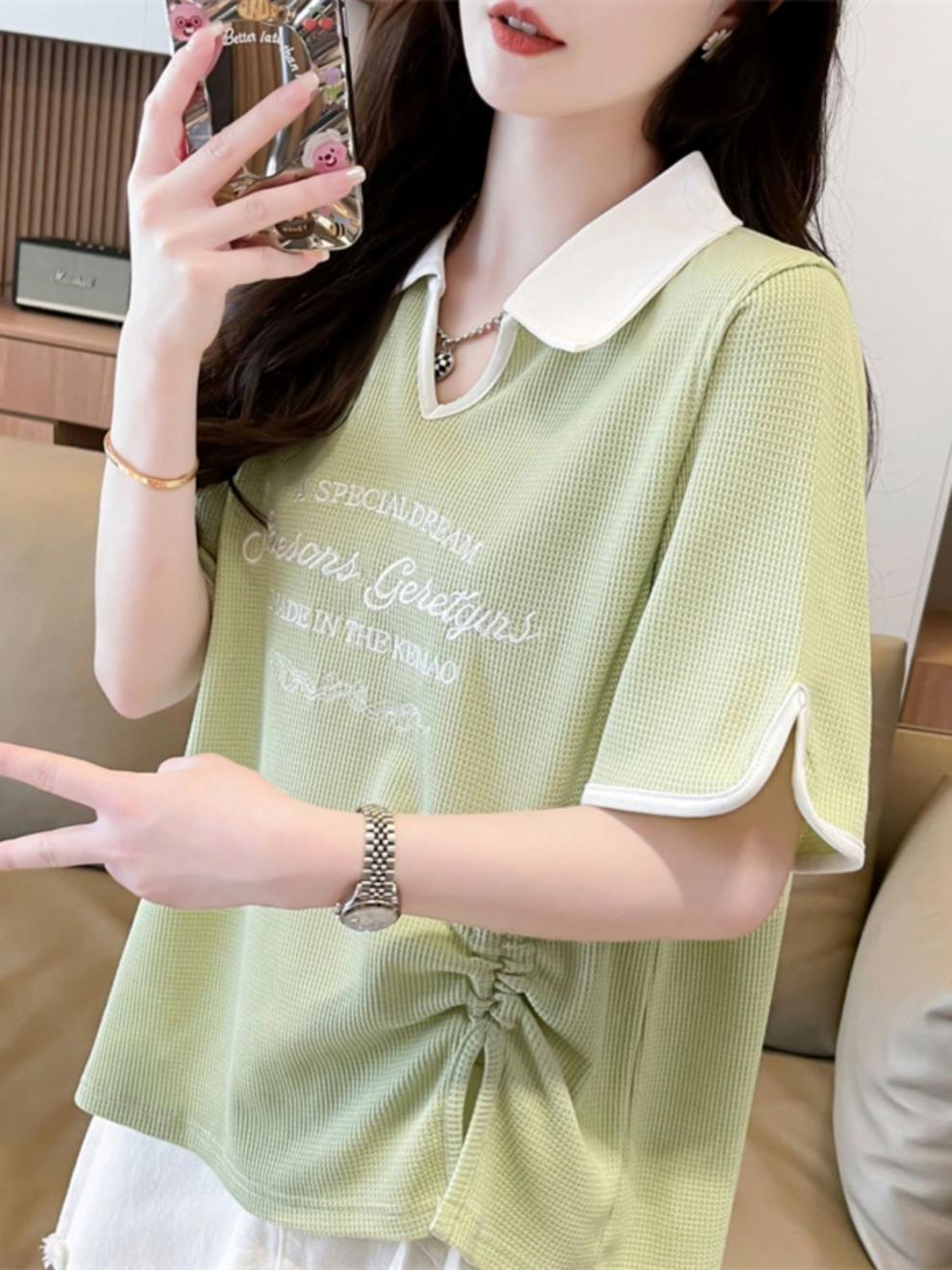 플러스 사이즈 와플 주름 칼라 반팔 여성 2025 년 여름 새로운 느슨한 슬리밍 디자인 탑스토어 가기