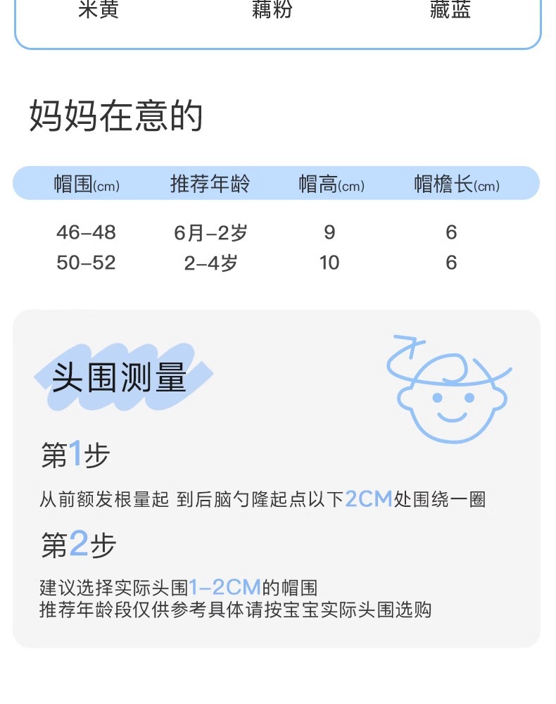 • 모자 둘레 46-48cm 권장 연령: 6개월-2세