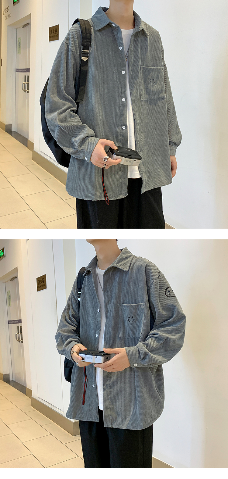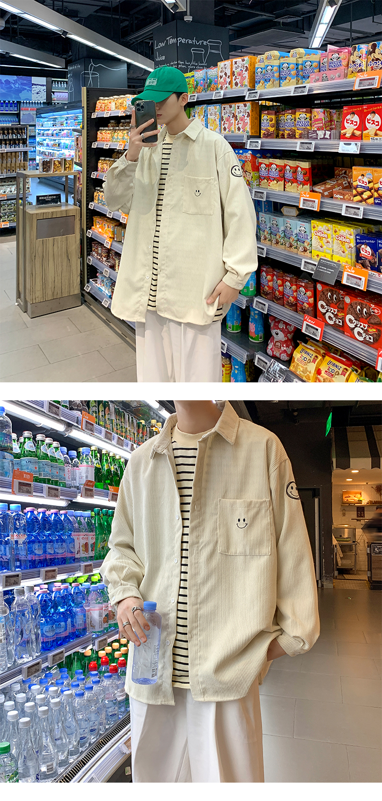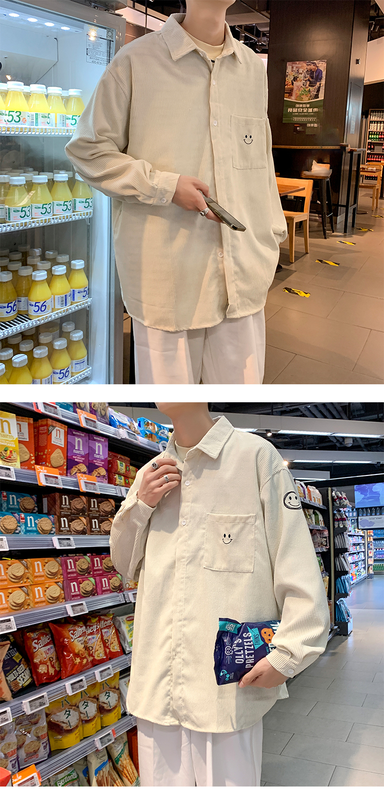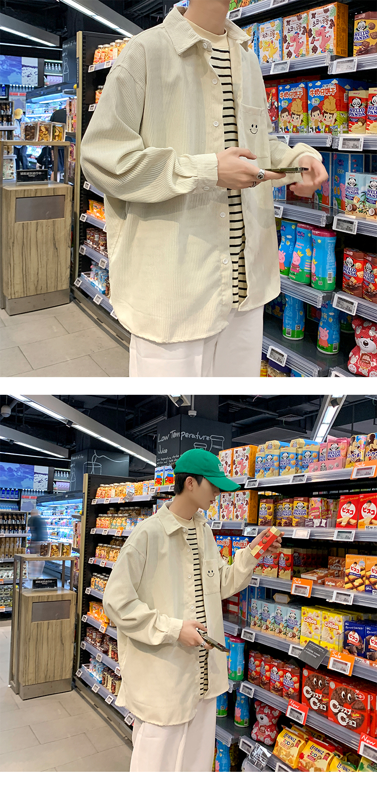 봄과 가을 스마일리 프린트 긴팔 셔츠 남성 홍콩 스타일 Ins 일본 스타일 루즈 셔츠 한국 스타일 트렌디 얇은 재킷스토어 가기