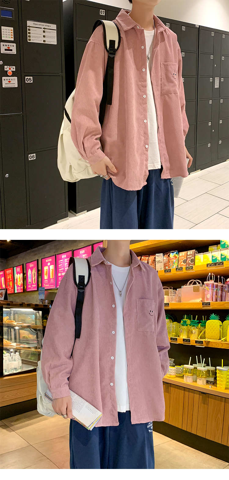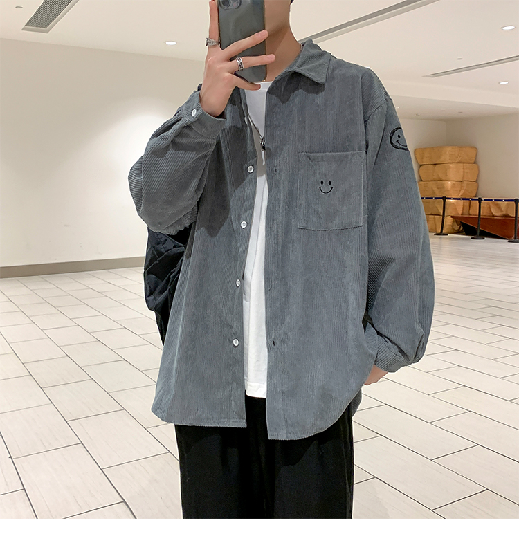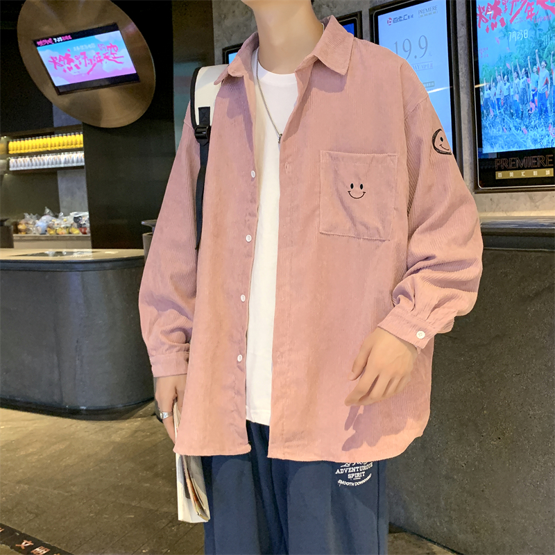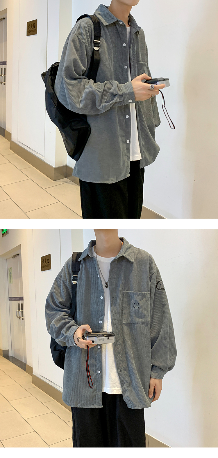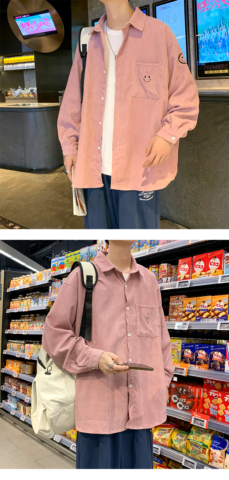 봄과 가을 스마일리 프린트 긴팔 셔츠 남성 홍콩 스타일 Ins 일본 스타일 루즈 셔츠 한국 스타일 트렌디 얇은 재킷스토어 가기