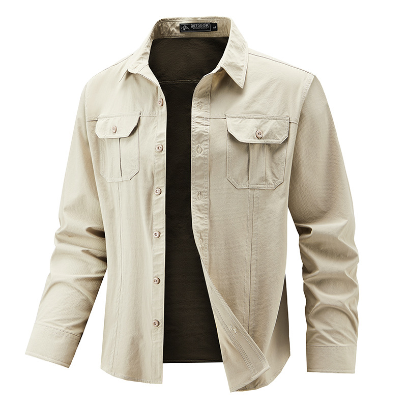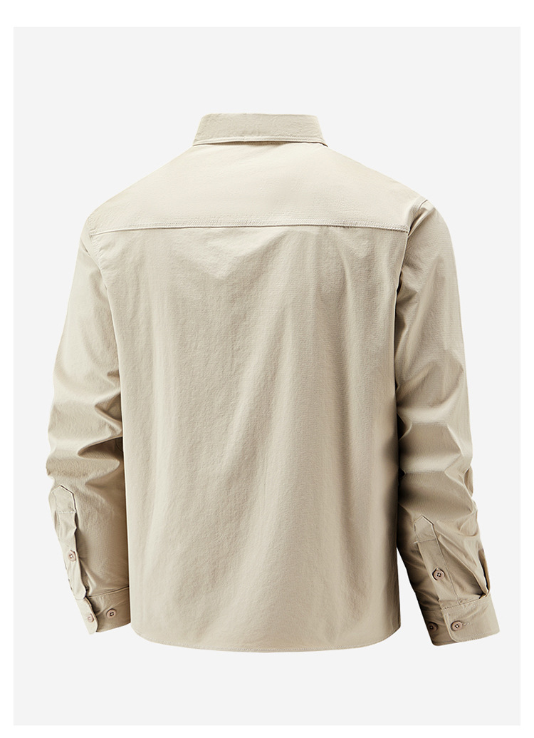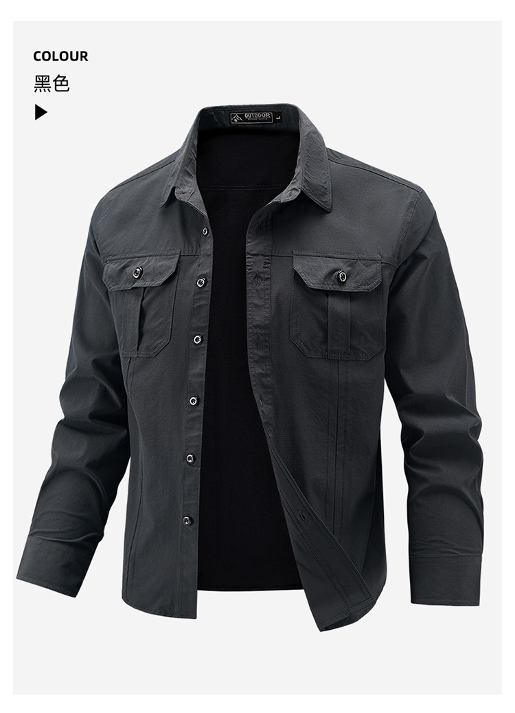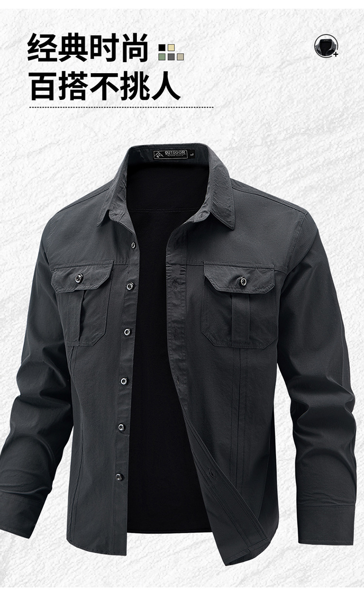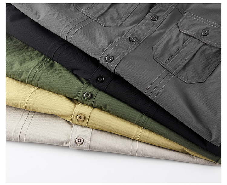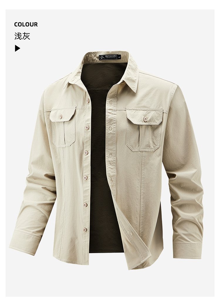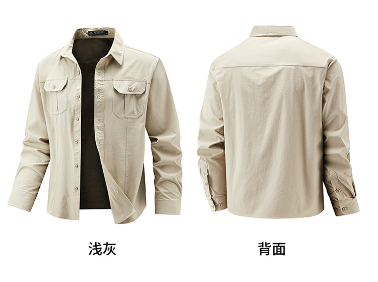 2025 봄, 가을 새로운 긴팔 셔츠 남성 캐주얼 멀티 포켓 고탄성 편안한 대형 솔리드 컬러 워크 셔츠 남성용