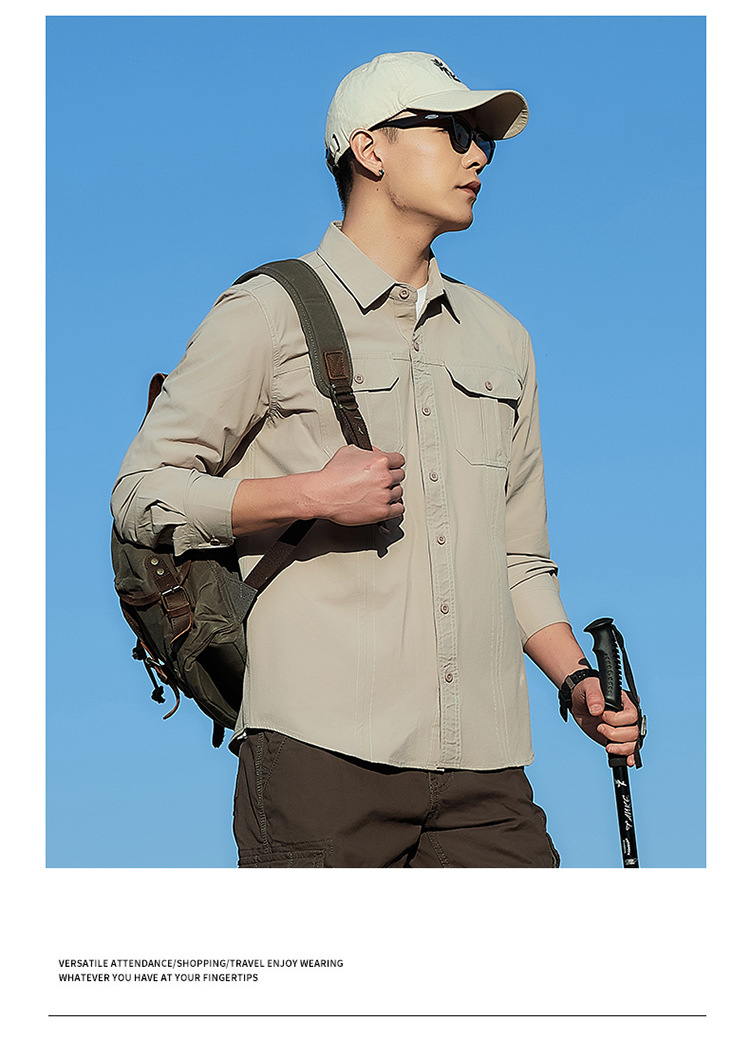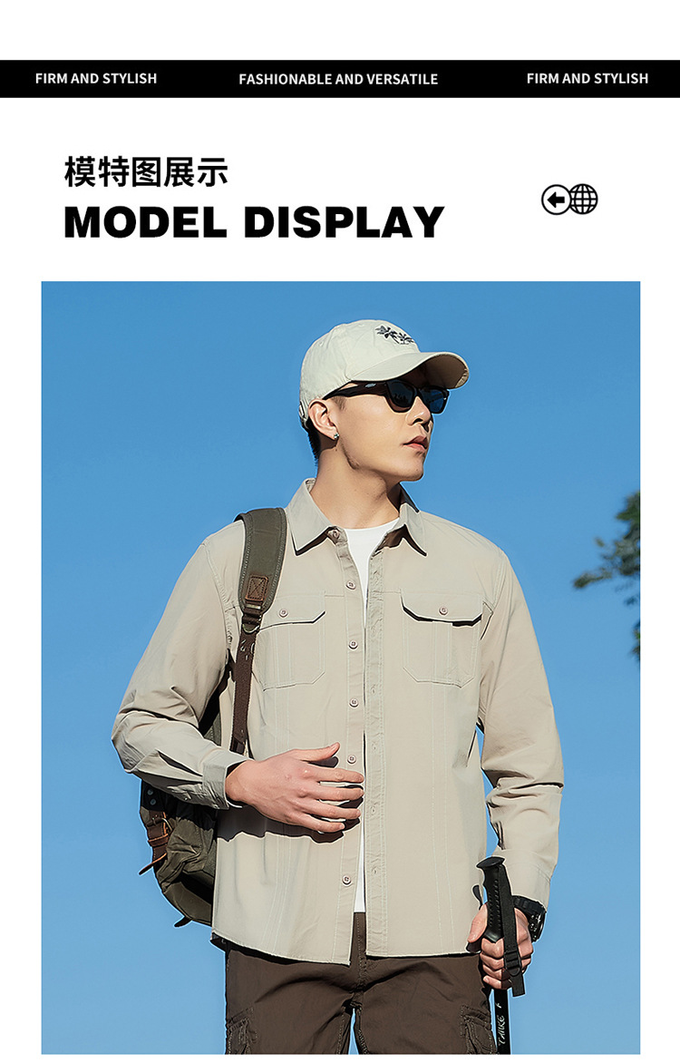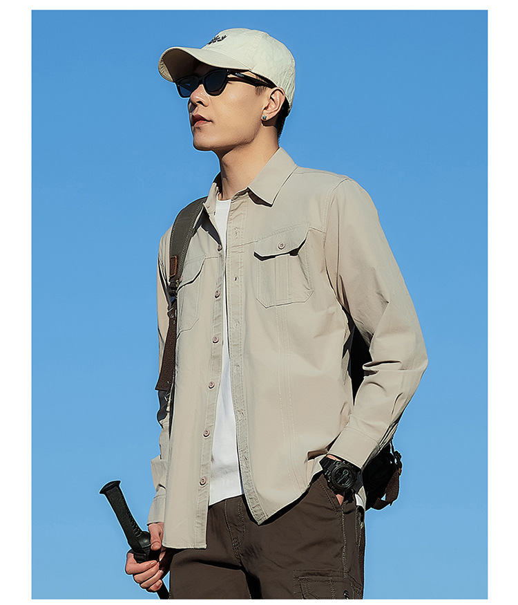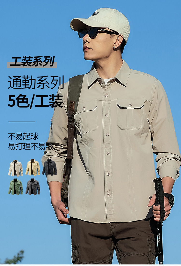 2025 봄, 가을 새로운 긴팔 셔츠 남성 캐주얼 멀티 포켓 고탄성 편안한 대형 솔리드 컬러 워크 셔츠 남성용스토어 가기