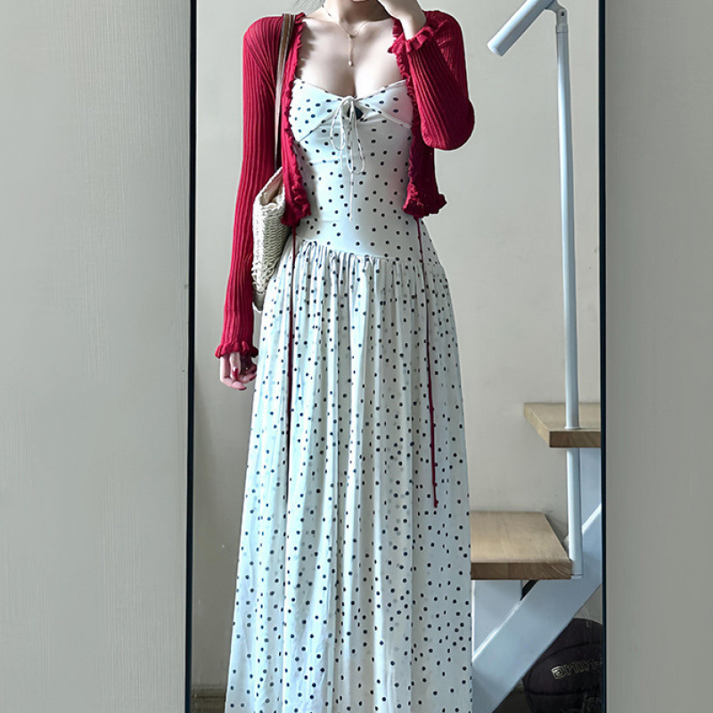 프랑스 스타일 우아한 웨이브 도트 슬립 스커트 세트 여성의 이른 가을 긴 소매 니트 카디건 순수한 섹시한 뜨거운 소녀 슬림 핏 긴 스커트