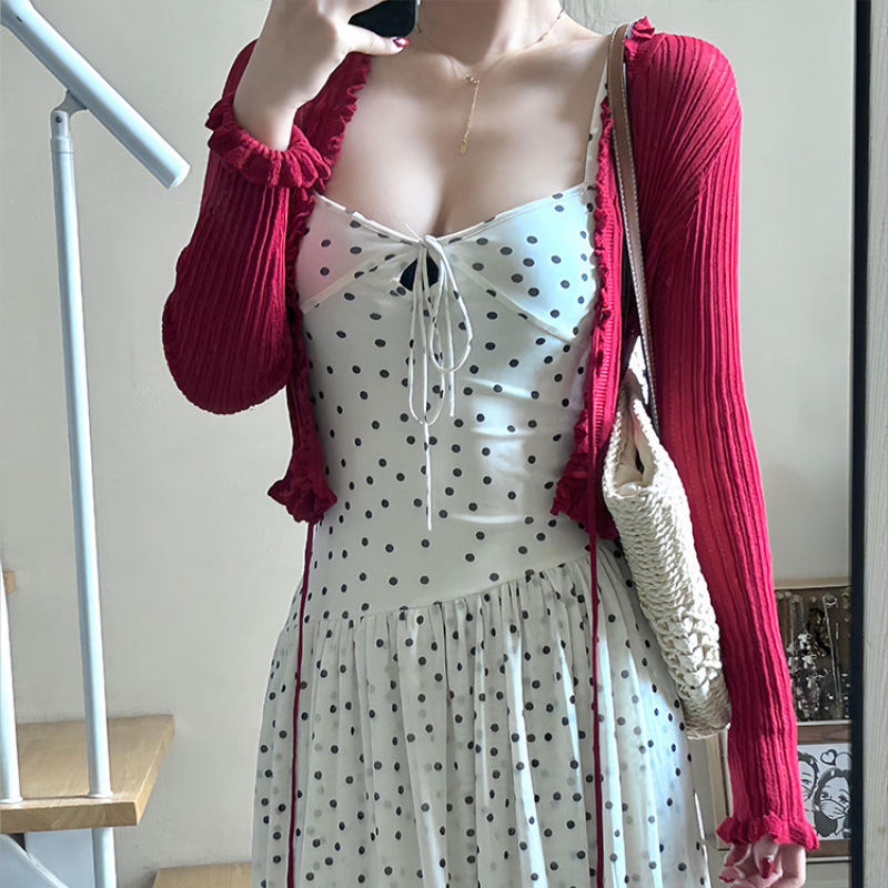 • 레드 가디건 + 도트무늬 원피스 투피스 세트