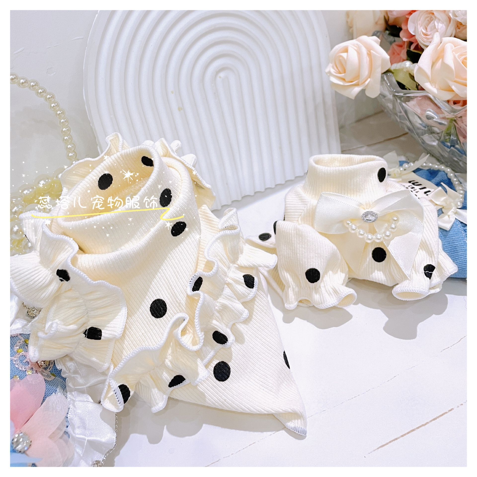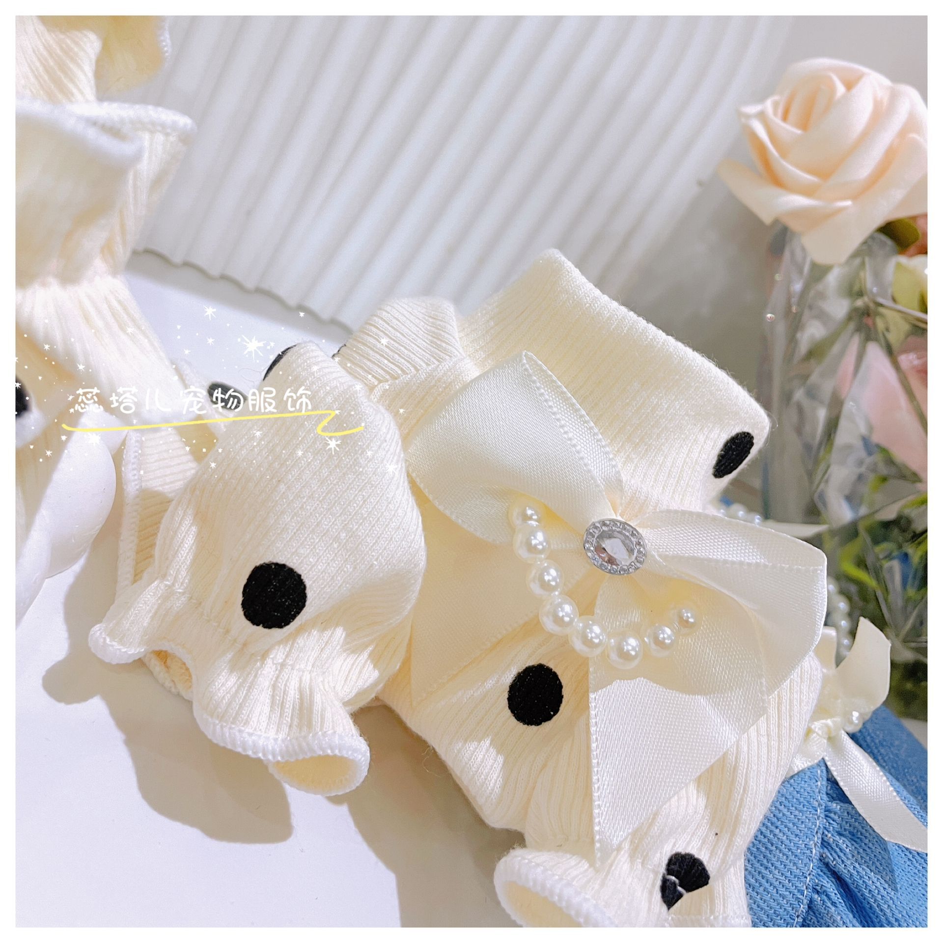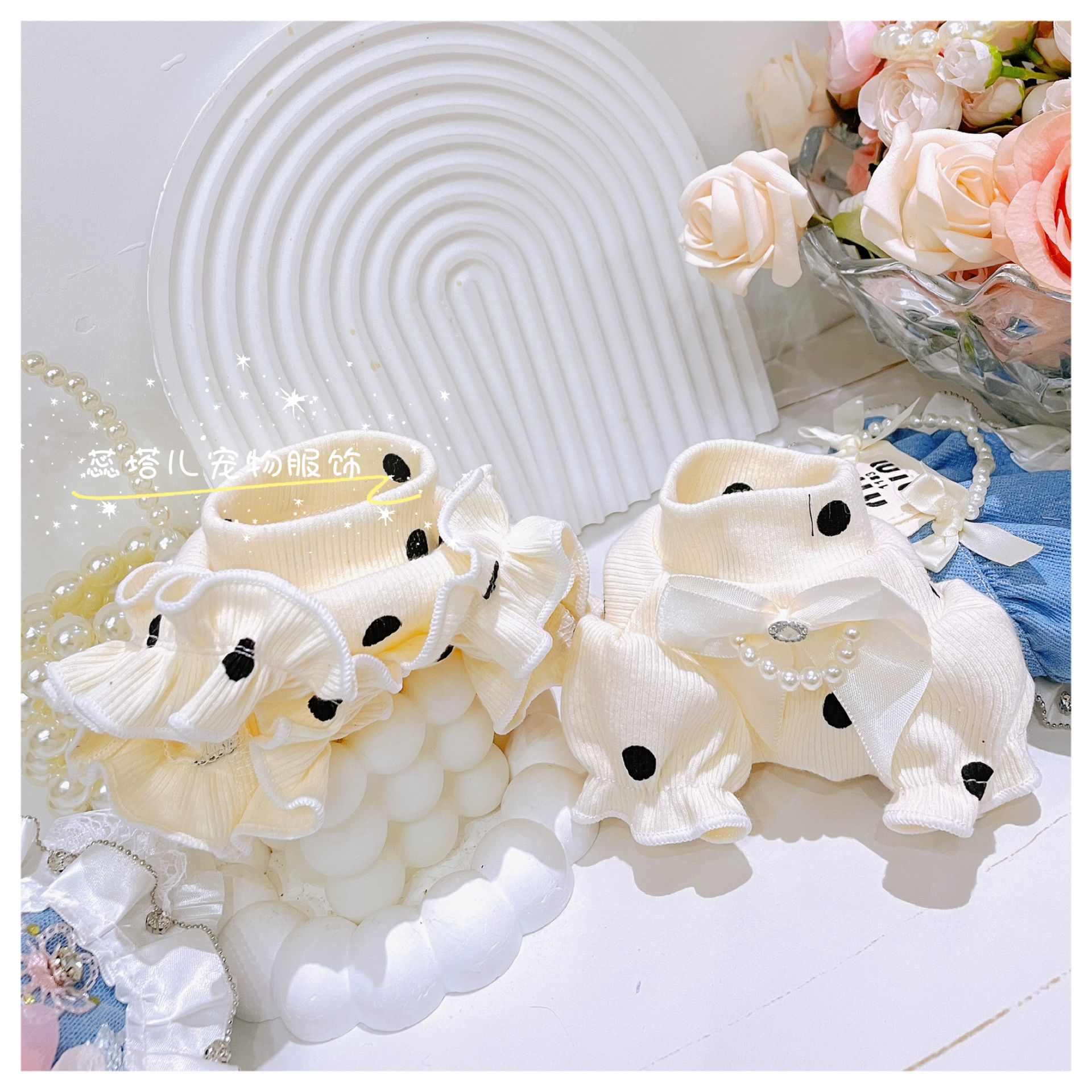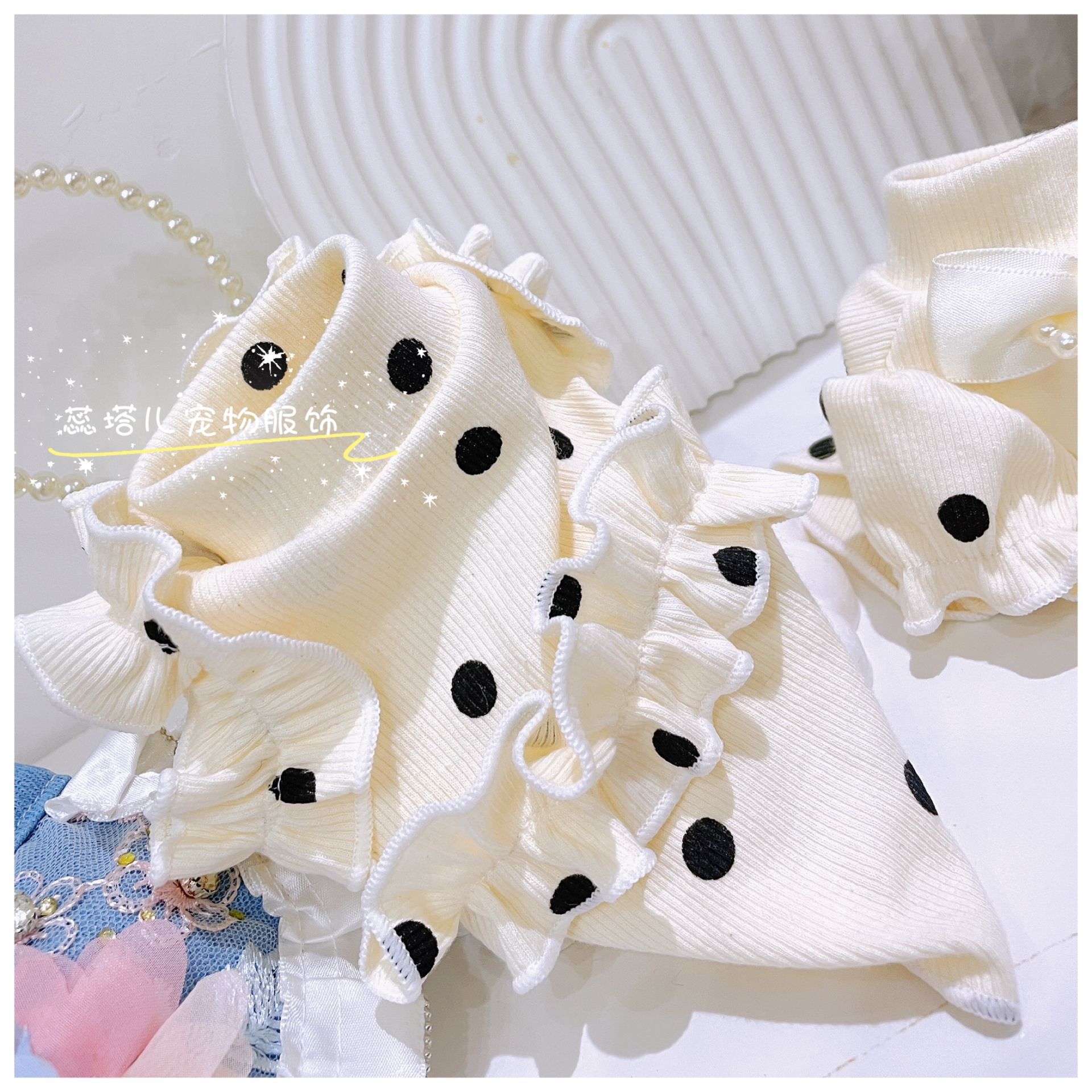 개베이스 셔츠 크림 달콤한 니트 높은 탄성 웨이브 도트 버블 슬리브 아기 면 작은 몸 애완 동물 옷스토어 가기