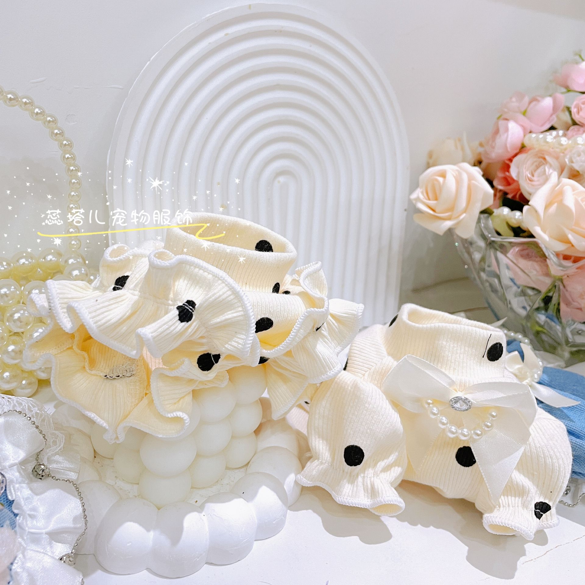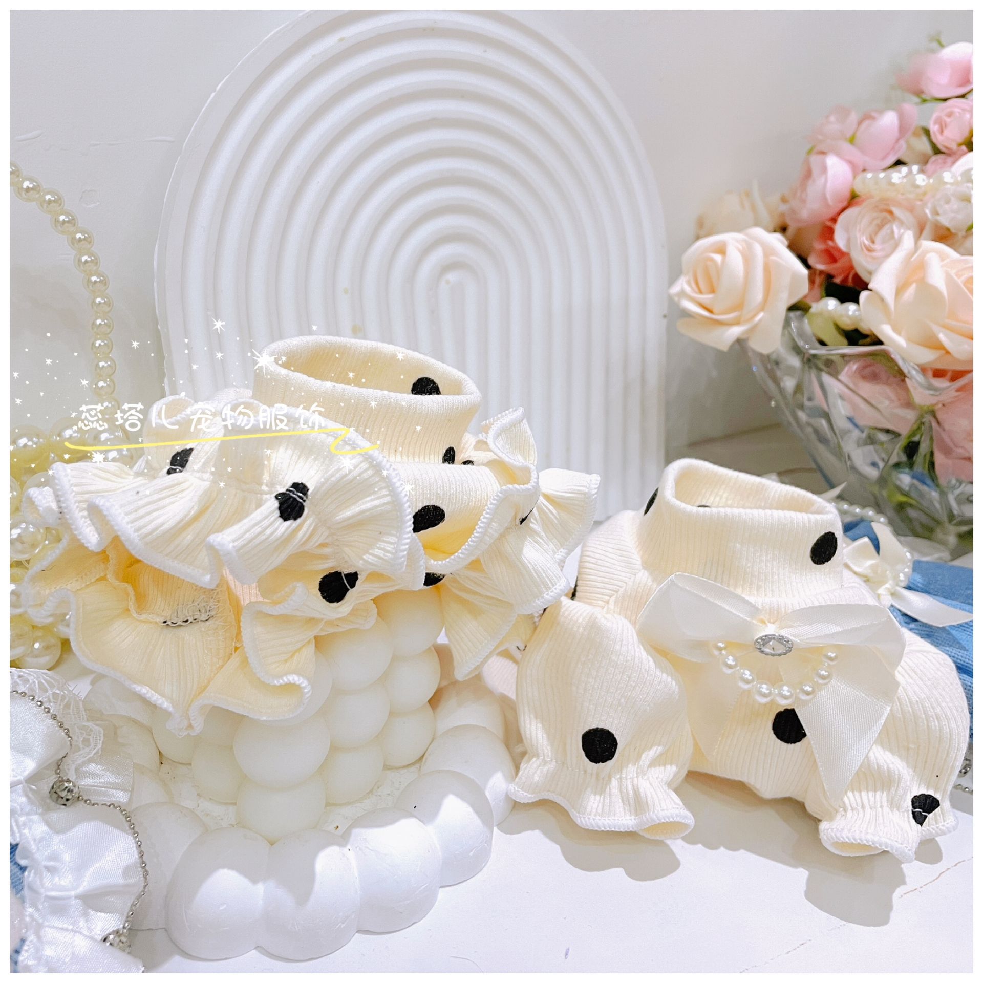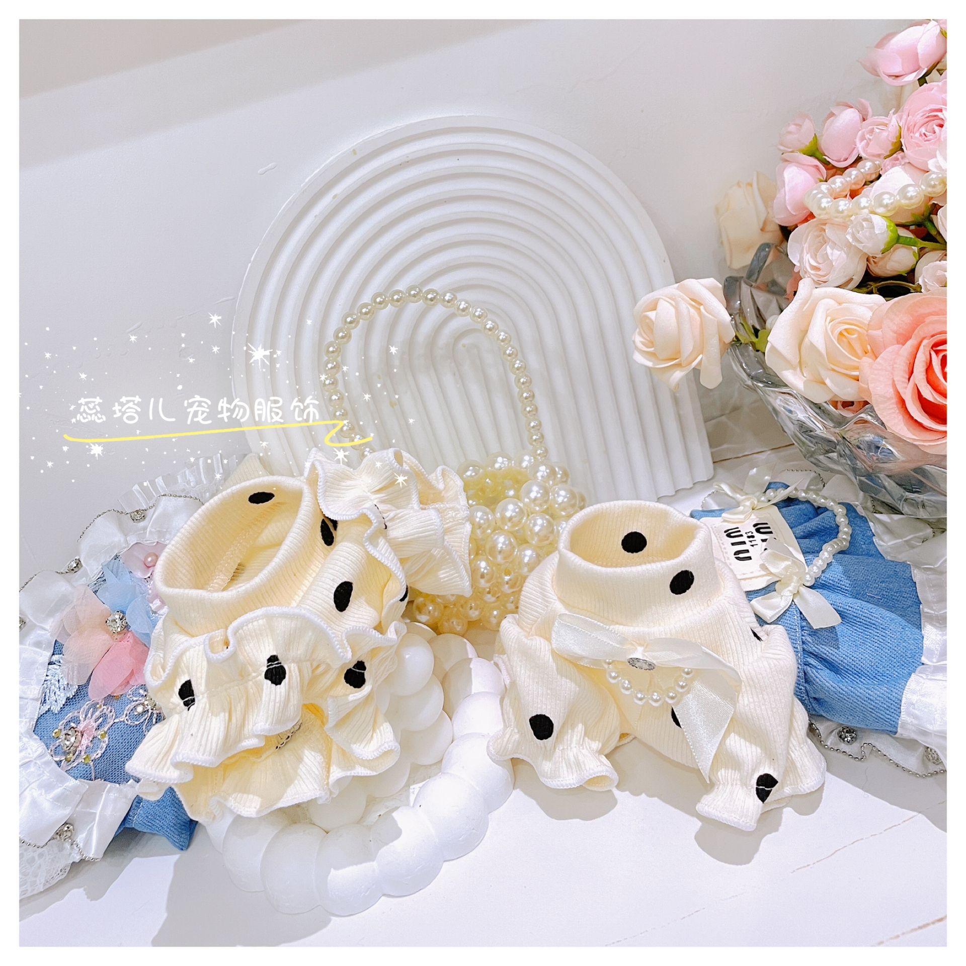 개베이스 셔츠 크림 달콤한 니트 높은 탄성 웨이브 도트 버블 슬리브 아기 면 작은 몸 애완 동물 옷스토어 가기
