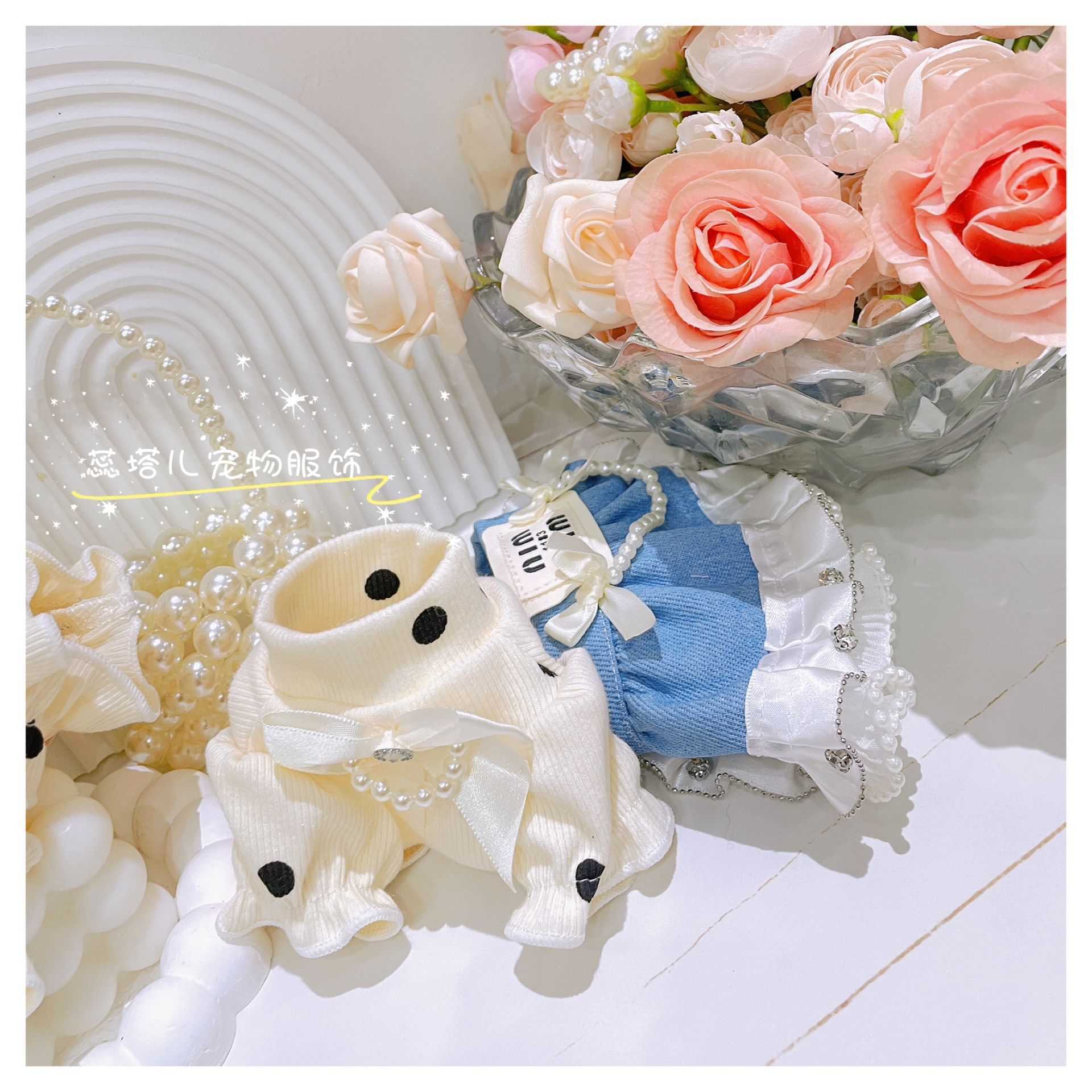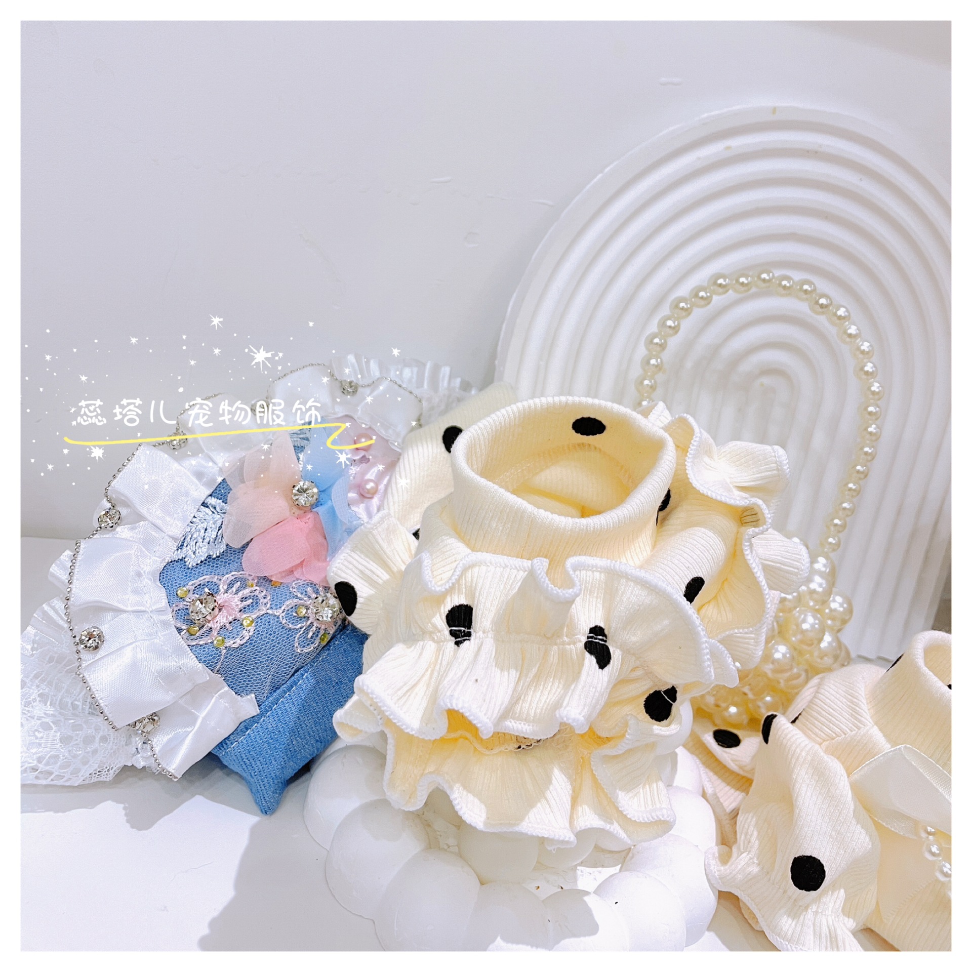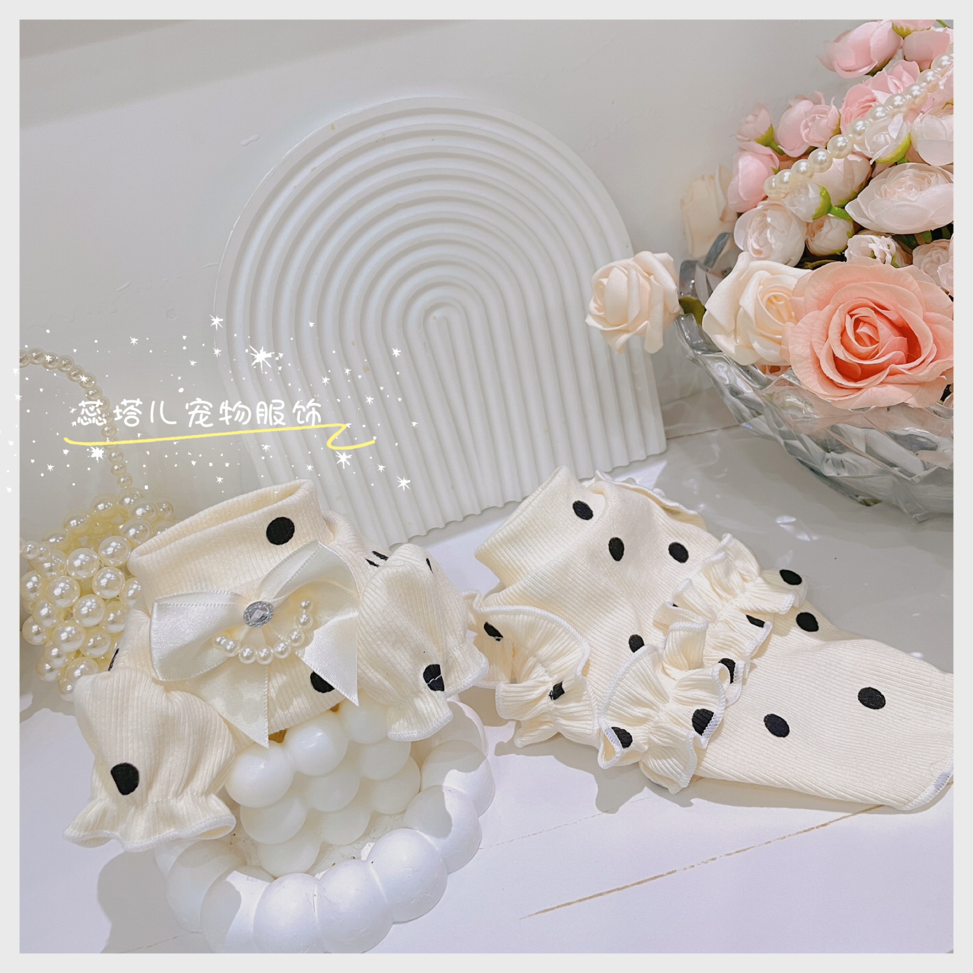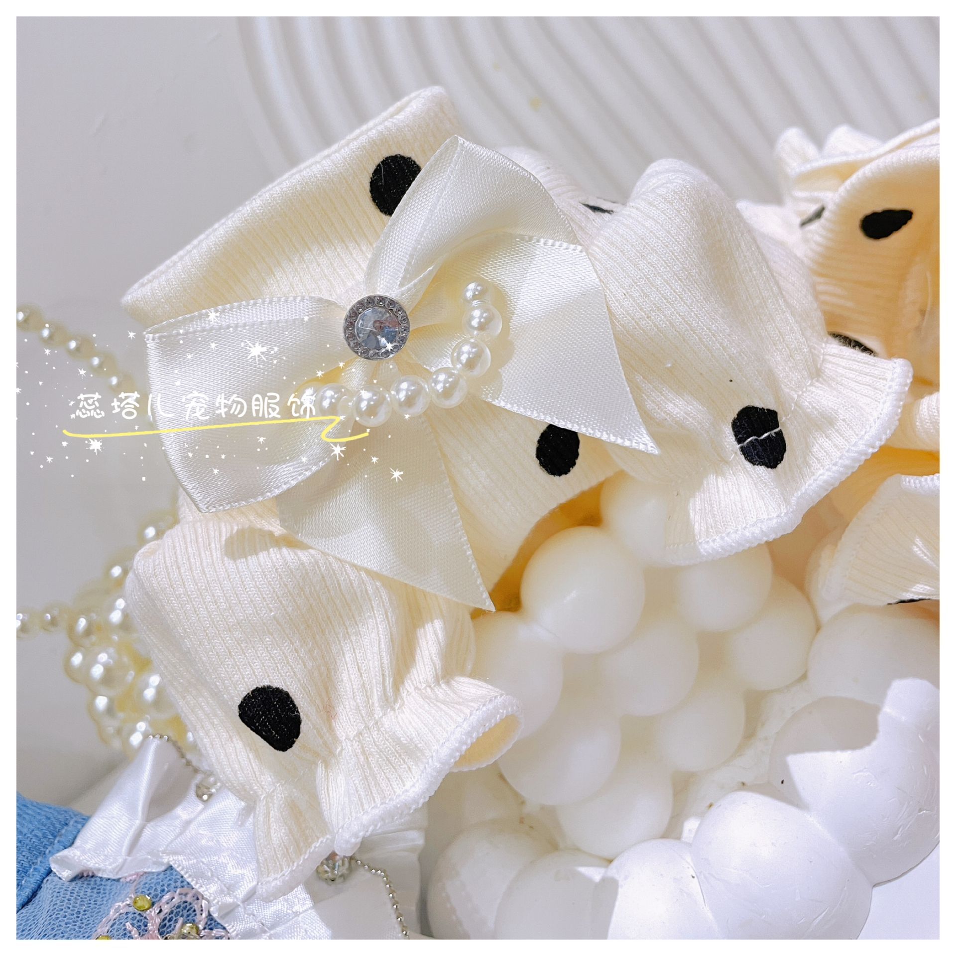 개베이스 셔츠 크림 달콤한 니트 높은 탄성 웨이브 도트 버블 슬리브 아기 면 작은 몸 애완 동물 옷스토어 가기