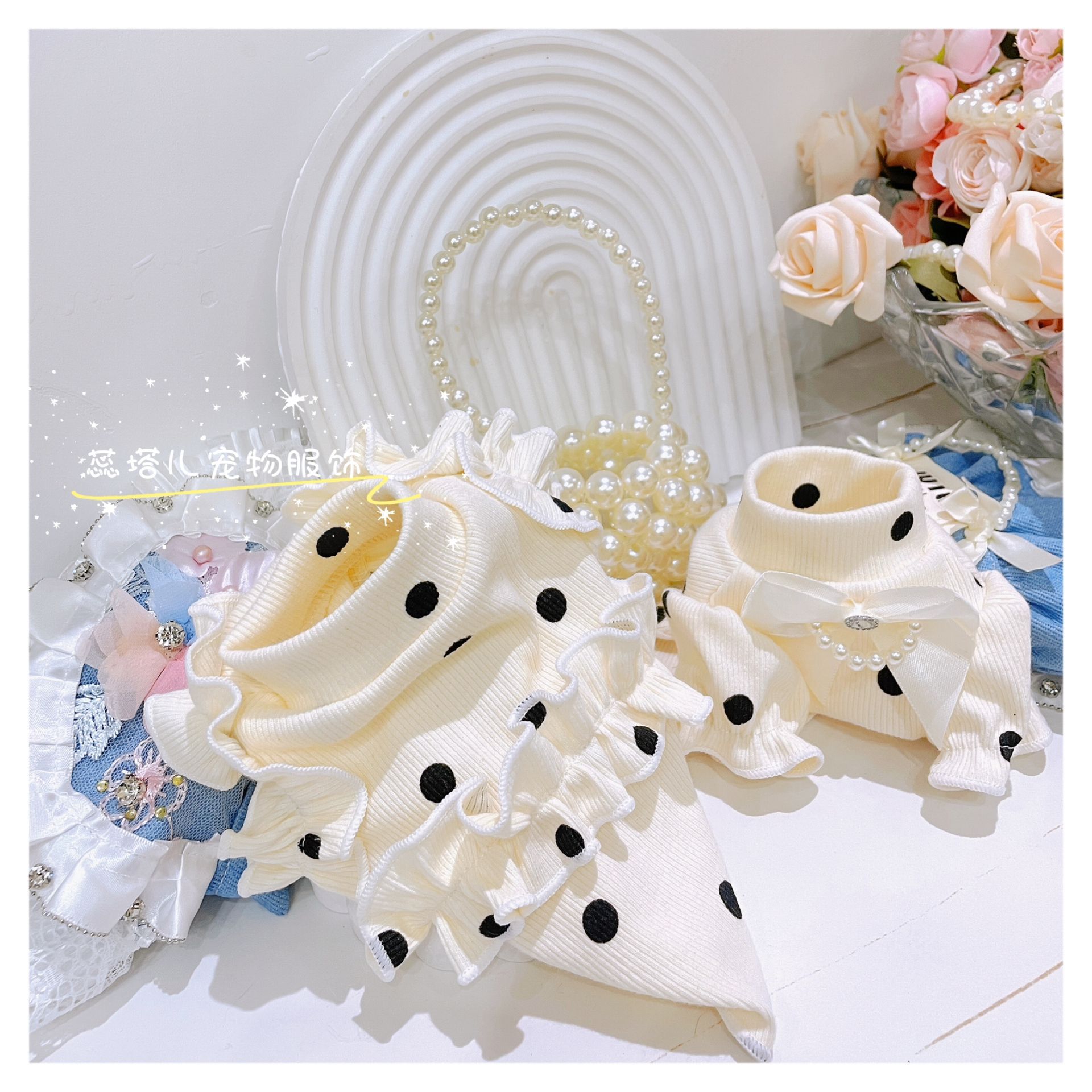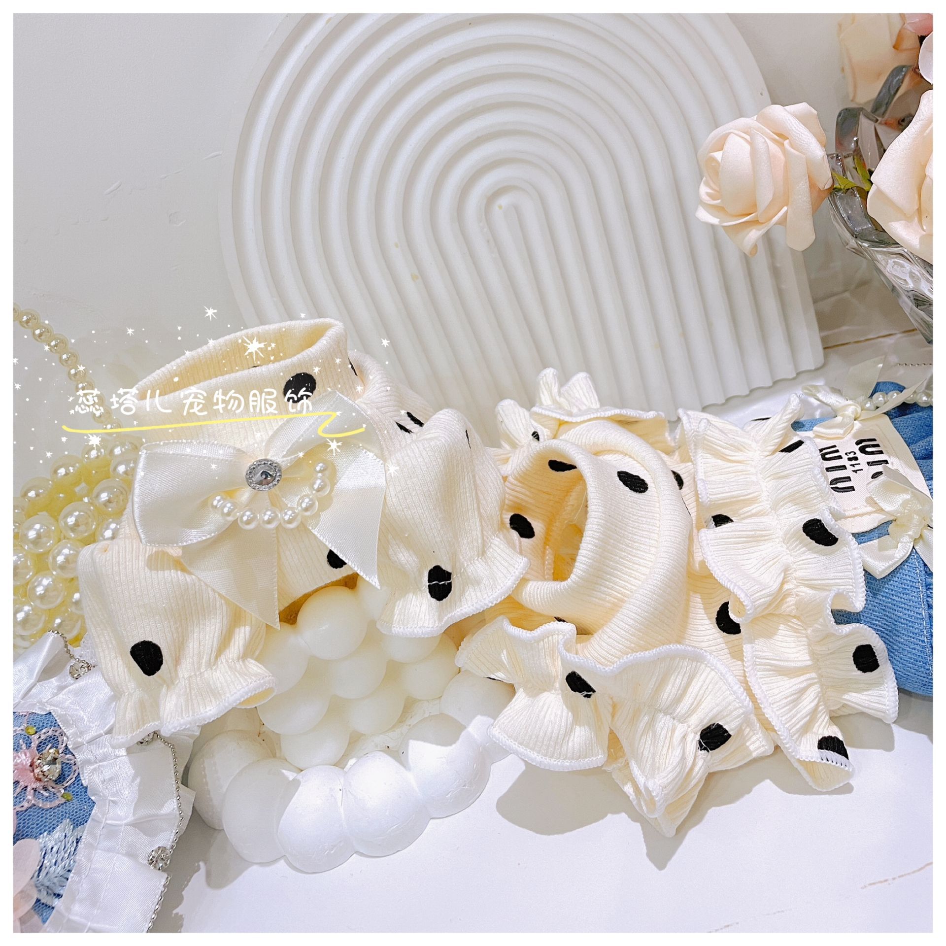 개베이스 셔츠 크림 달콤한 니트 높은 탄성 웨이브 도트 버블 슬리브 아기 면 작은 몸 애완 동물 옷