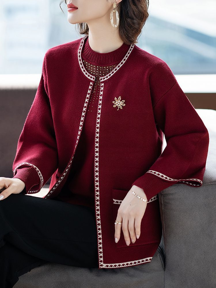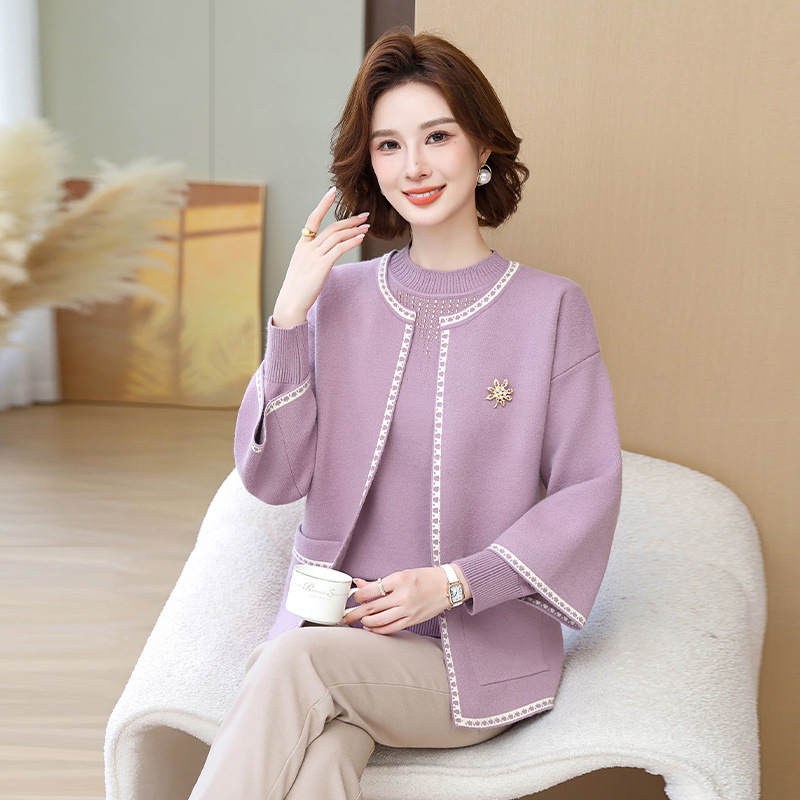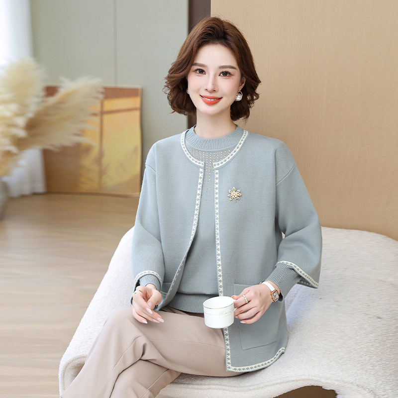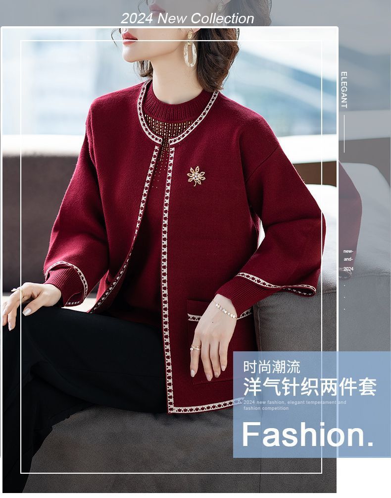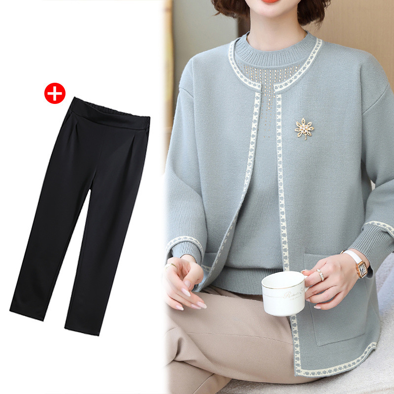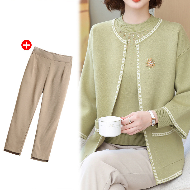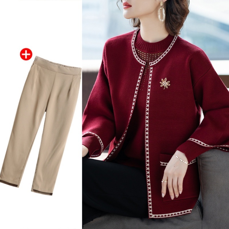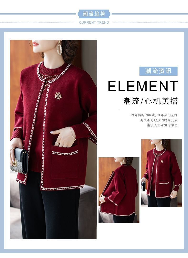 어머니의 가을 원피스 외국식 탑 투피스 세트 행복 한 시어머니 웨딩 세트 중년 및 노인 봄 및 가을 여성용 니트 카디건 재킷