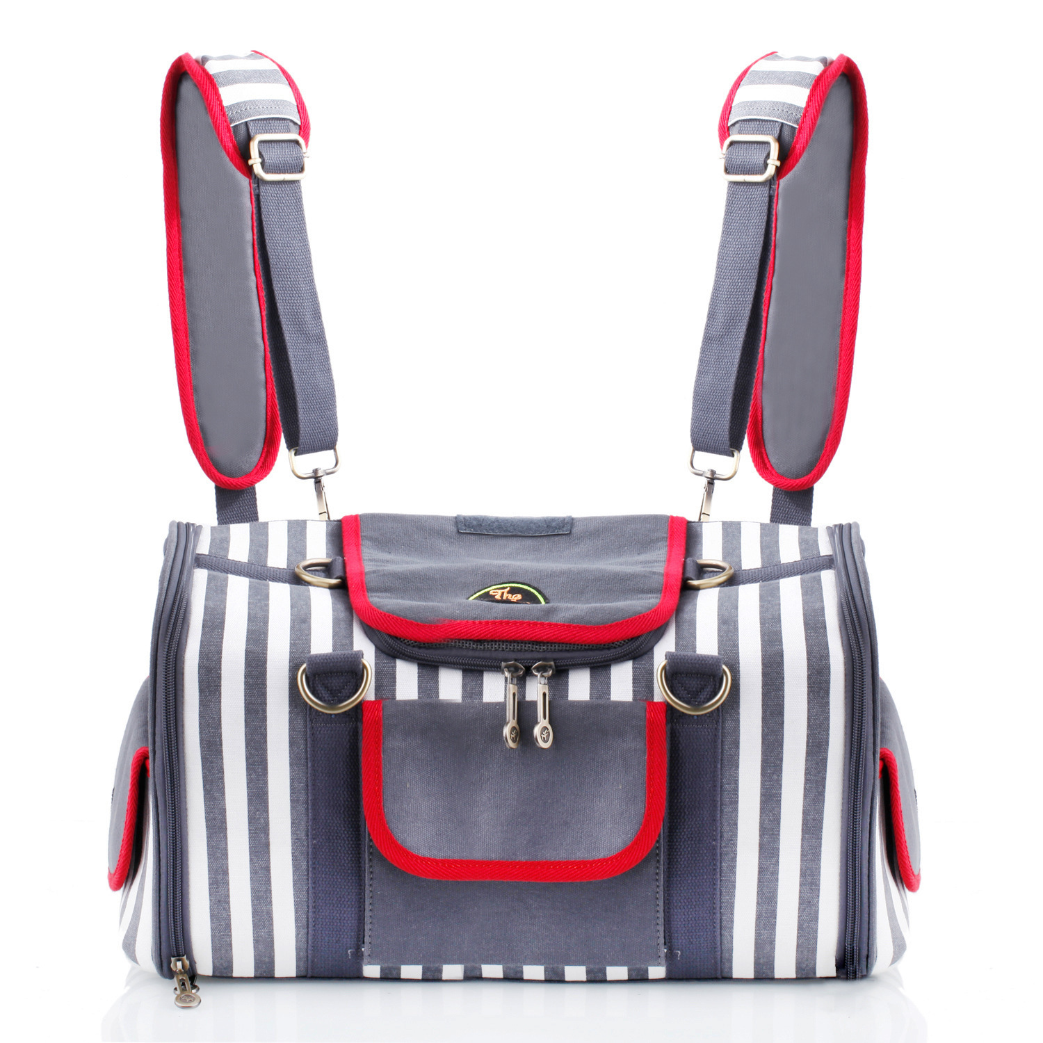 从左到右可以直接拉到头,宠物可以半拉式装进去就OK 了。两边是透气网布,这样狗狗在里面就不会闷到了。但是此透气网有一个好处外面是不容易看到狗狗在袋子里的,这样方便出行做公车,但狗狗可以轻松的观看外面的风景哦!袋子的侧部有小袋子方便装点其他的小东西。底内部有活动底板  可以拿出来清洗,即受力有耐脏!此款包可手提,可肩挎,喜欢的朋友欢迎前来