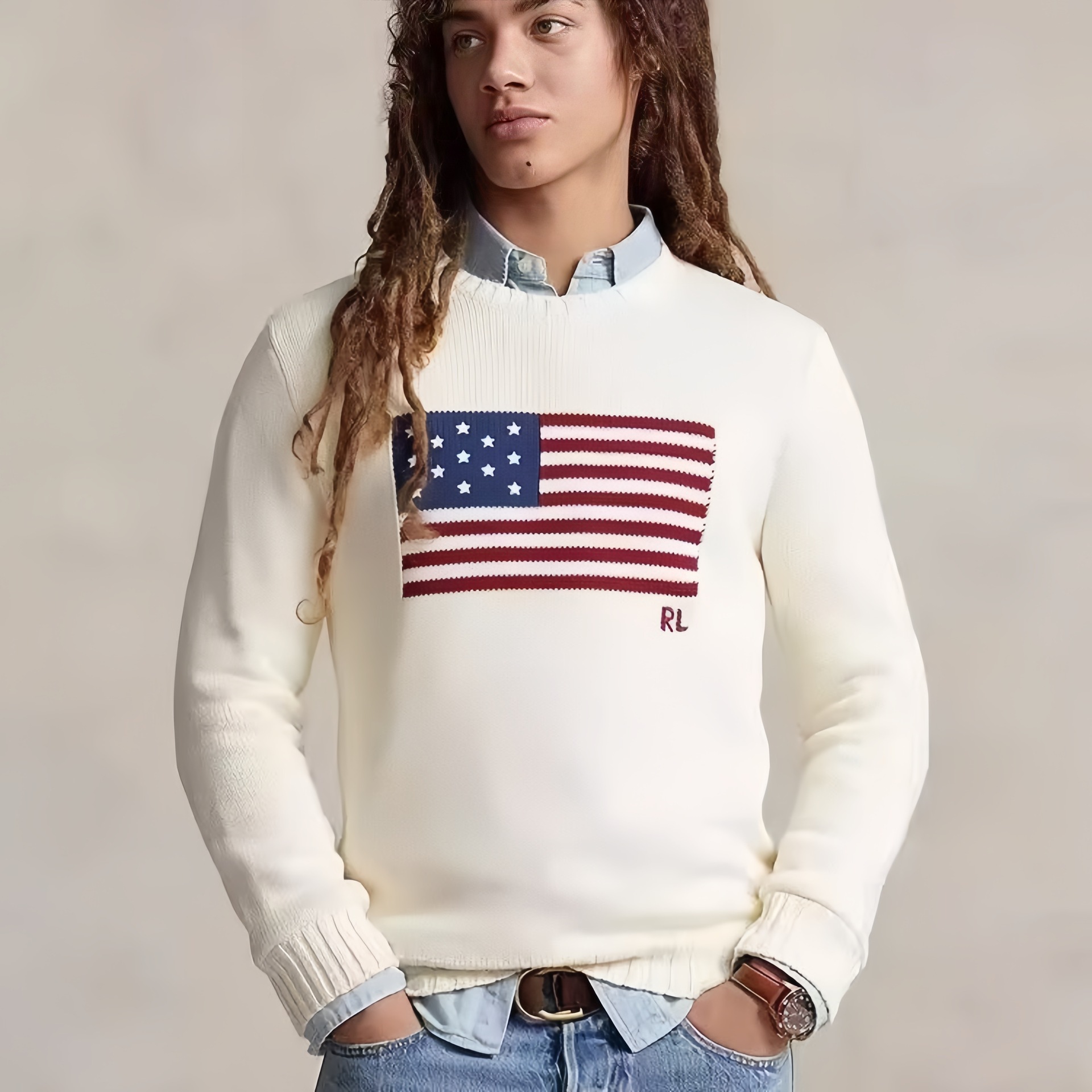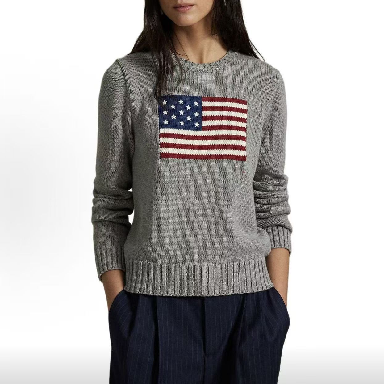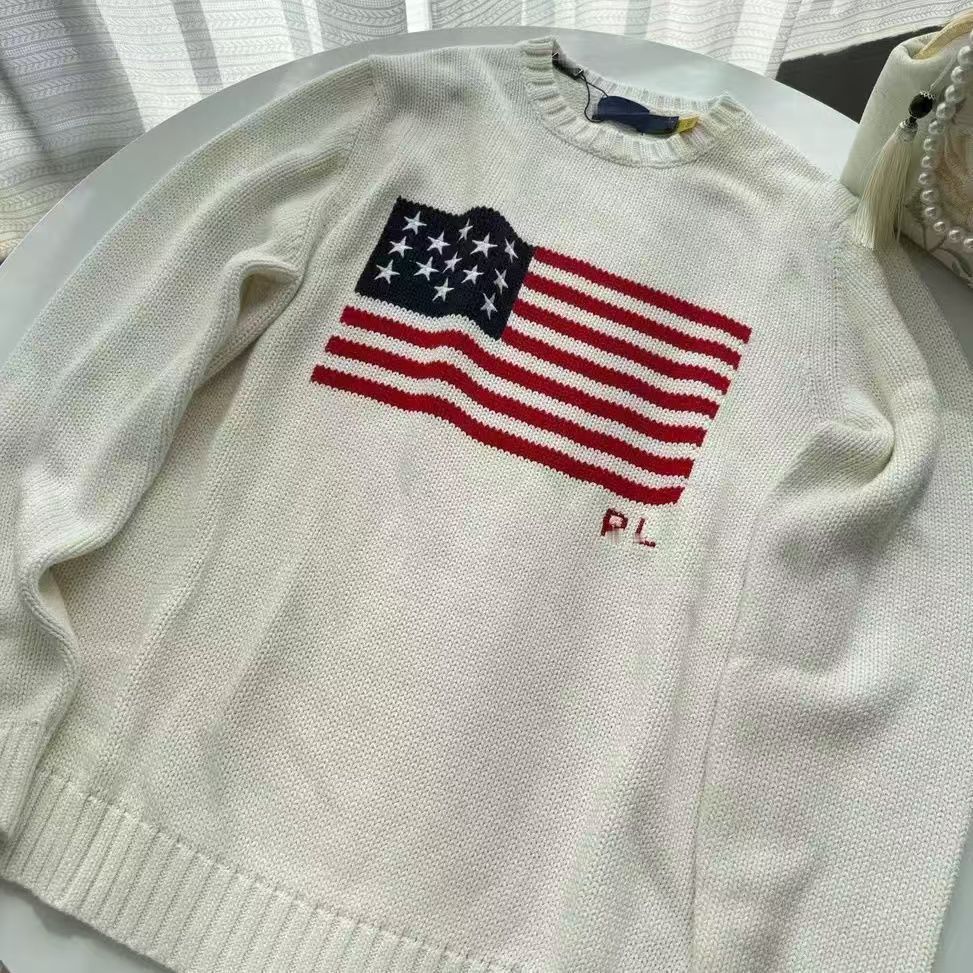 크로스보더 대형 사이즈 아메리칸 레트로 국기 자수 풀오버 라운드넥 스웨터 남녀공용 루즈핏 다용도 니트웨어 울스토어 가기