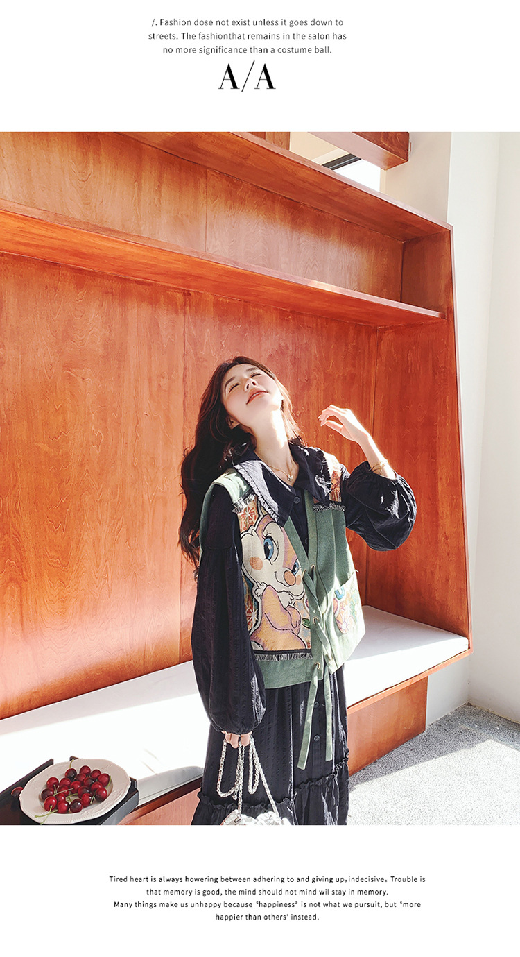 검은 프랑스 레트로 인형 칼라 원피스 세트 여성의 2025 년 초 봄 새 만화 인쇄 조끼 투피스 세트스토어 가기