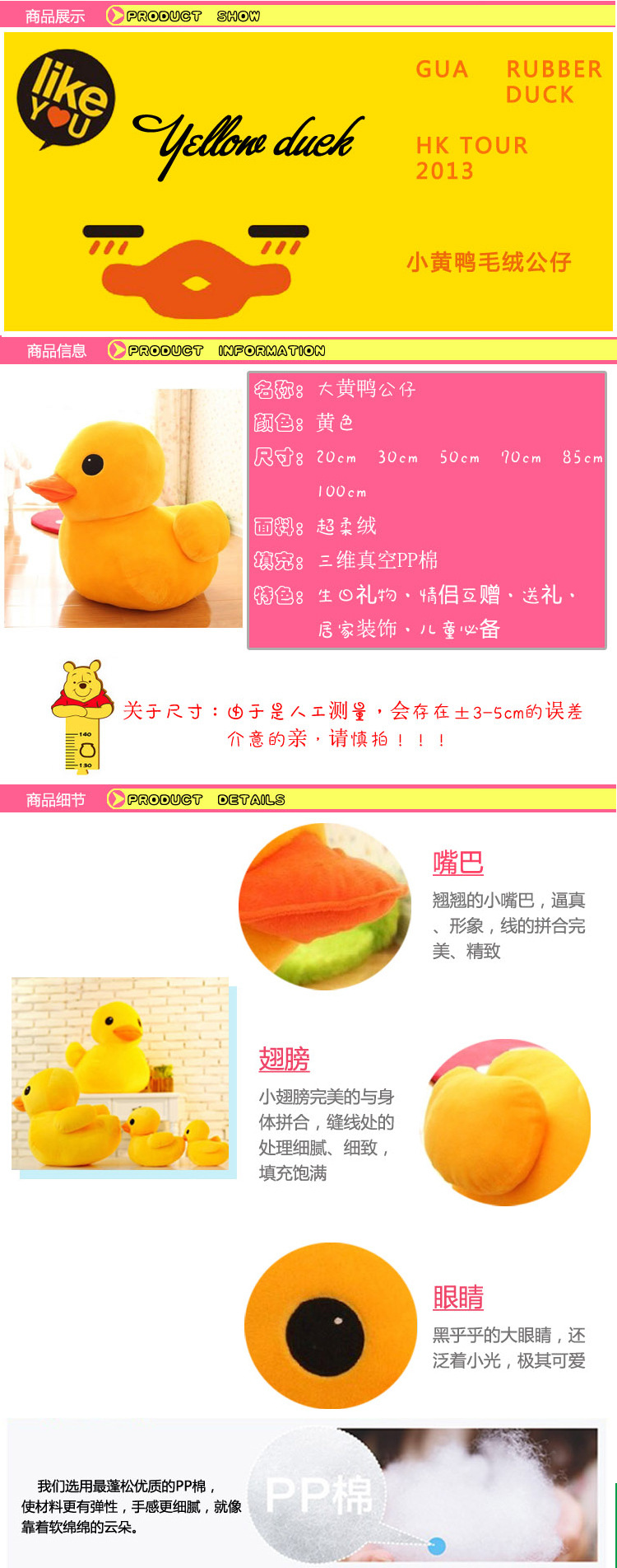 국경 간 노란 오리 장난감 큰 노란 오리 봉제 인형 오리 소녀 베개 어린이 인형 헝겊 인형 재고 머리