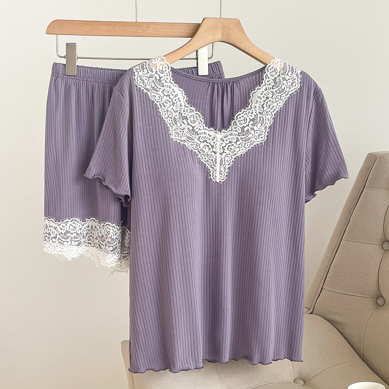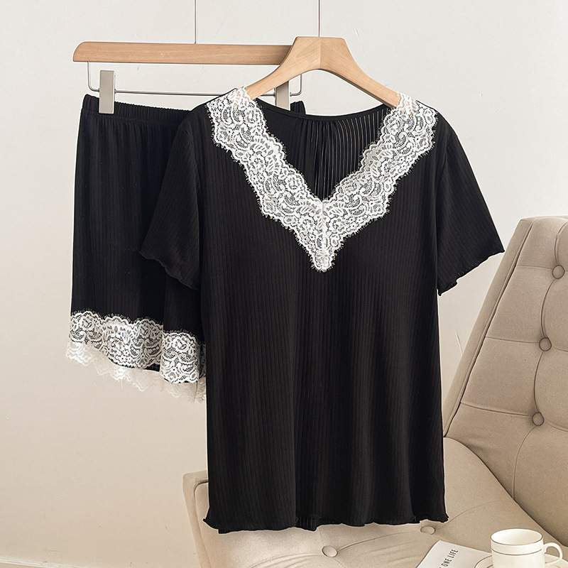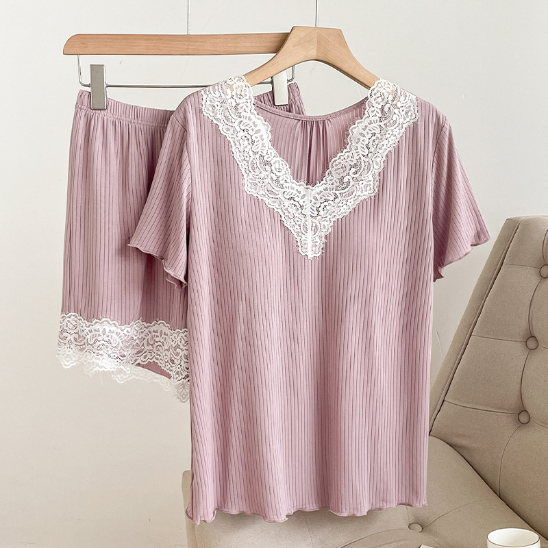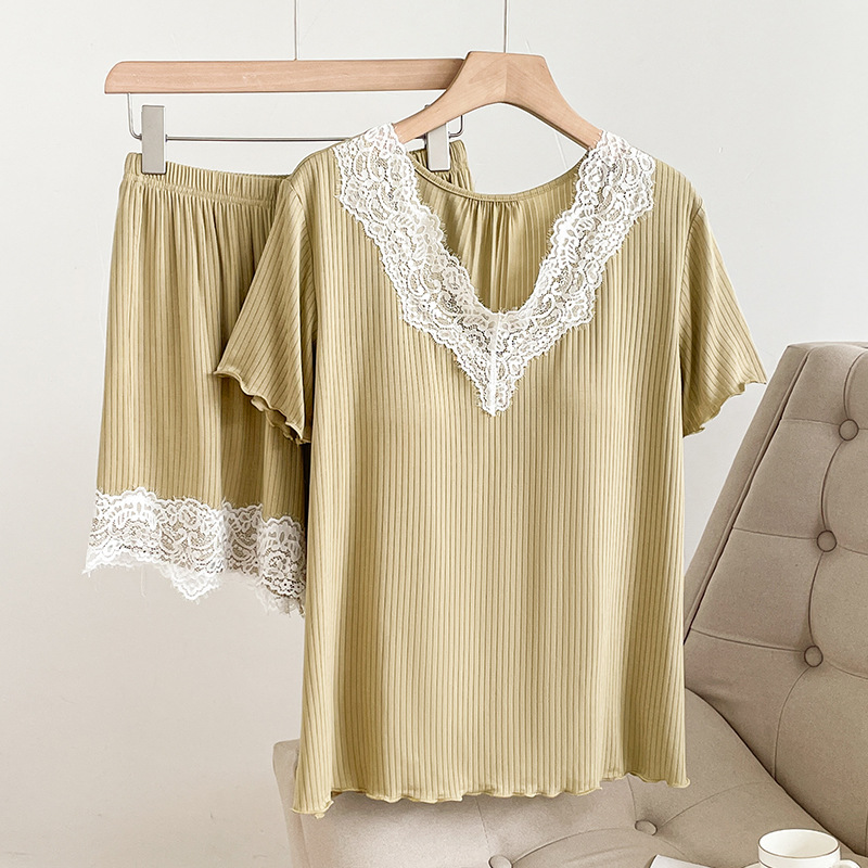 여름 잠옷 세트 여성 투피스 복장 레이스 홈 옷 반팔 반바지 홈 옷 캐주얼 한 가슴 패드