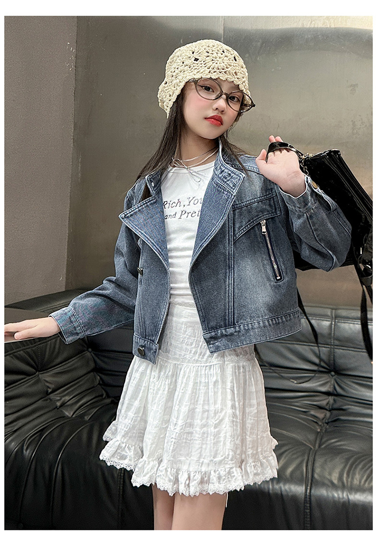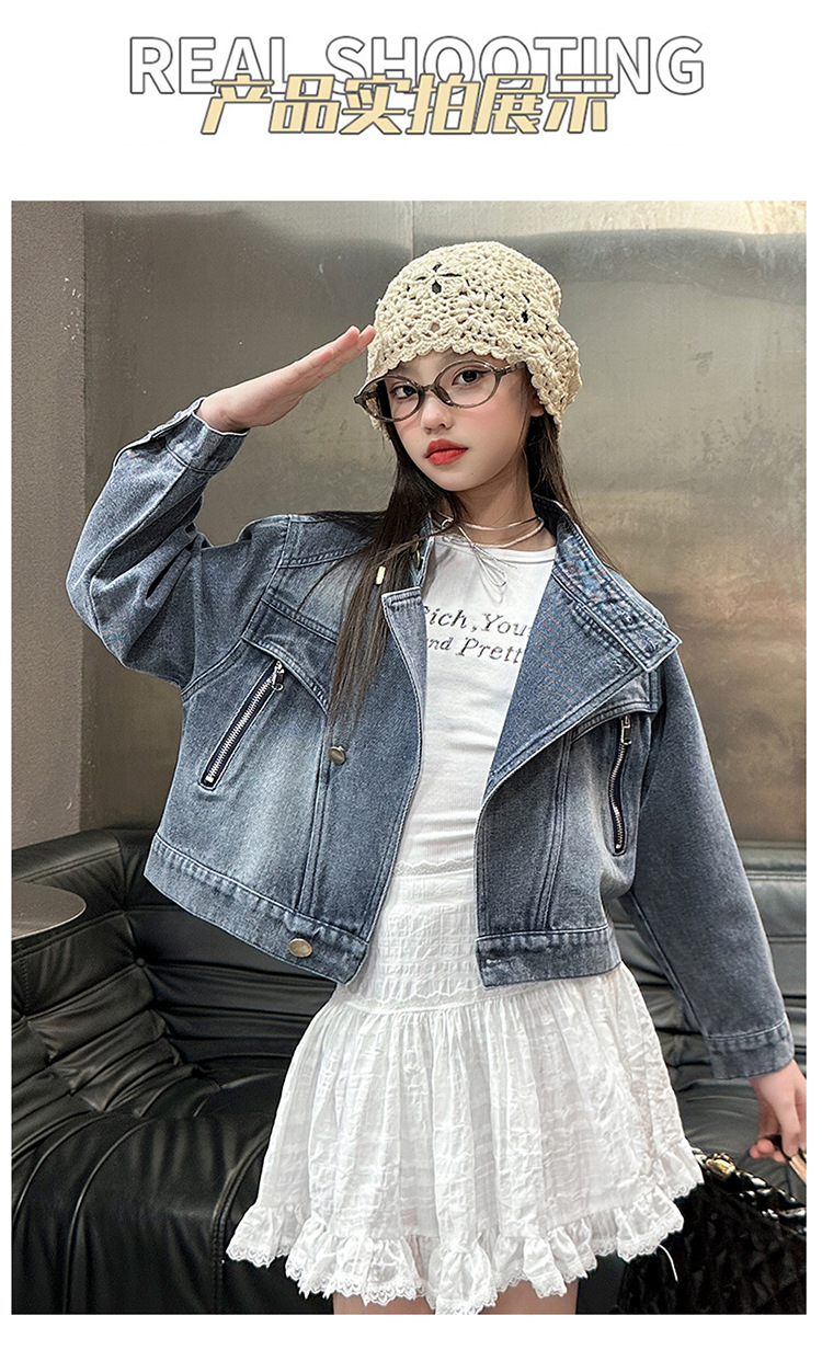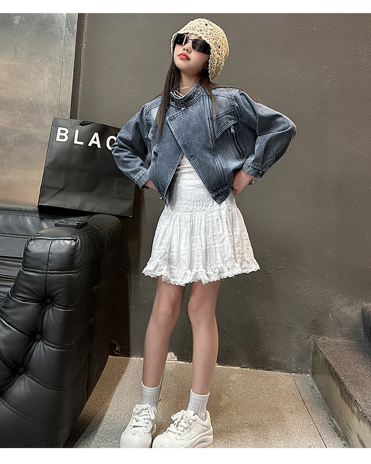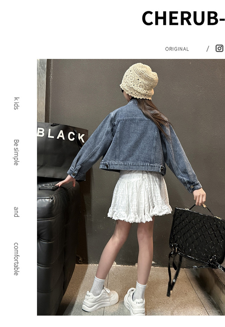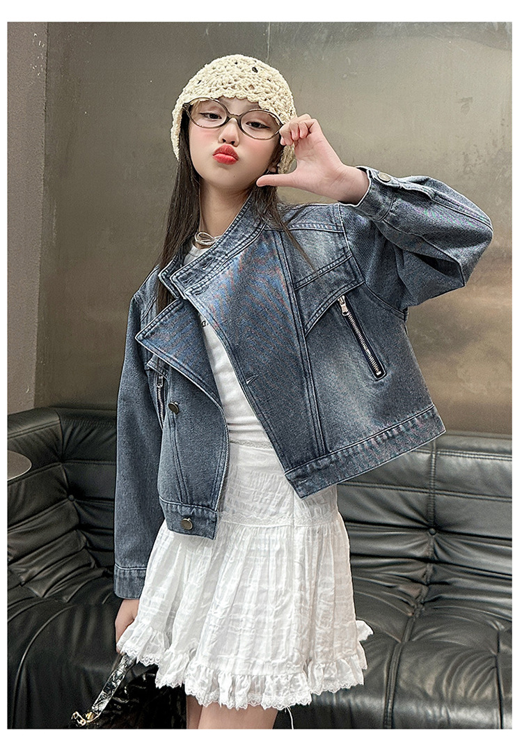 2025 년 봄과 가을에 칼라 데님 코트로 세트 된 소녀 로저 뉴 어린이 복고풍 튀김 거리 루즈 쇼트 탑스토어 가기