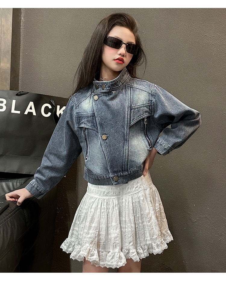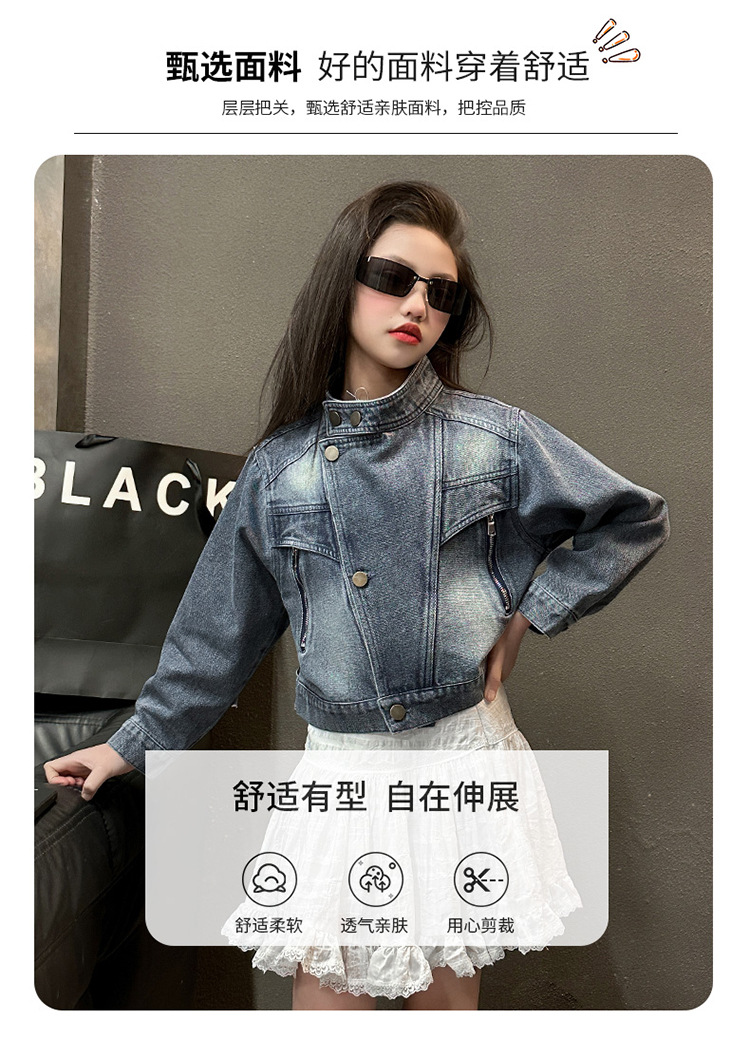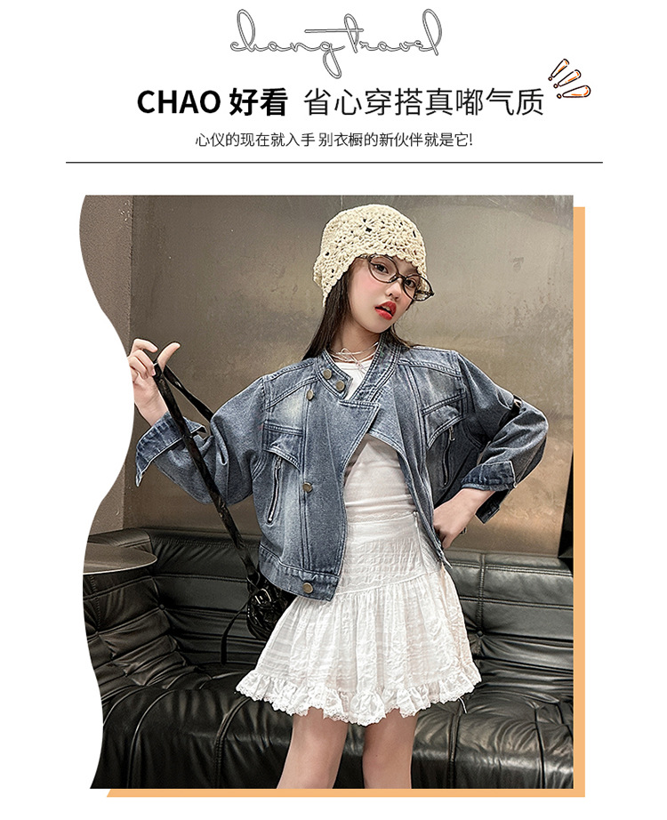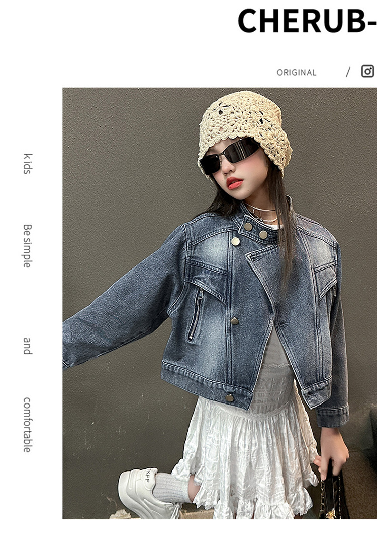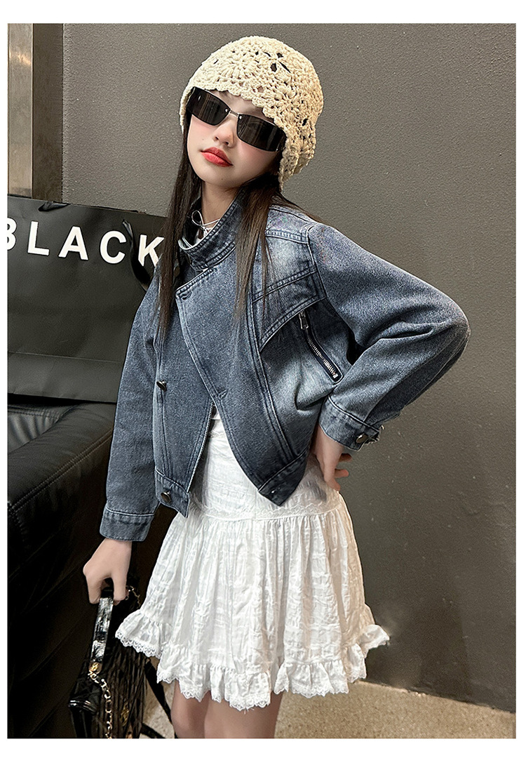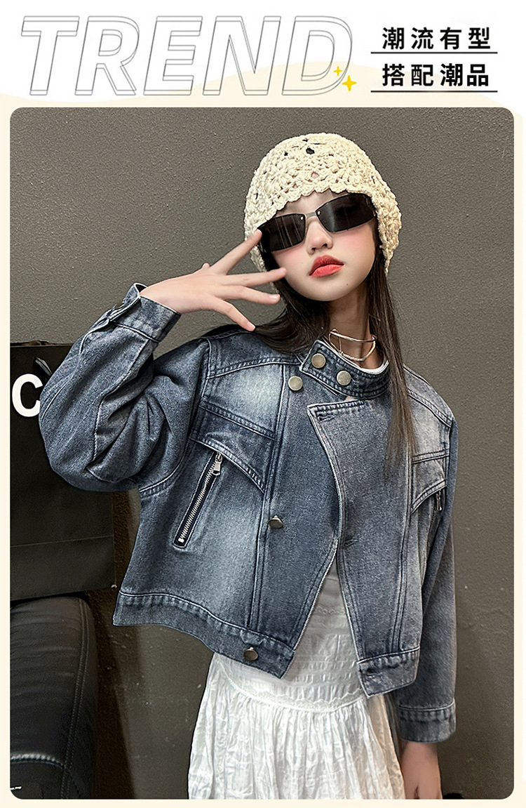 2025 년 봄과 가을에 칼라 데님 코트로 세트 된 소녀 로저 뉴 어린이 복고풍 튀김 거리 루즈 쇼트 탑스토어 가기