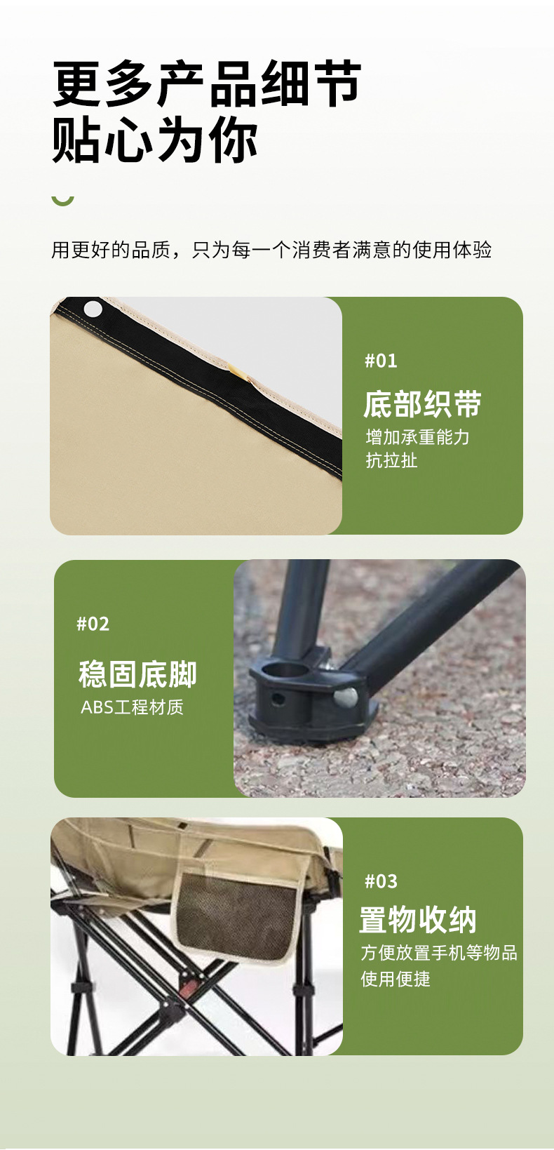 • 다리 지지대와 발 지지대가 있는 3단 조절 가능 카키색