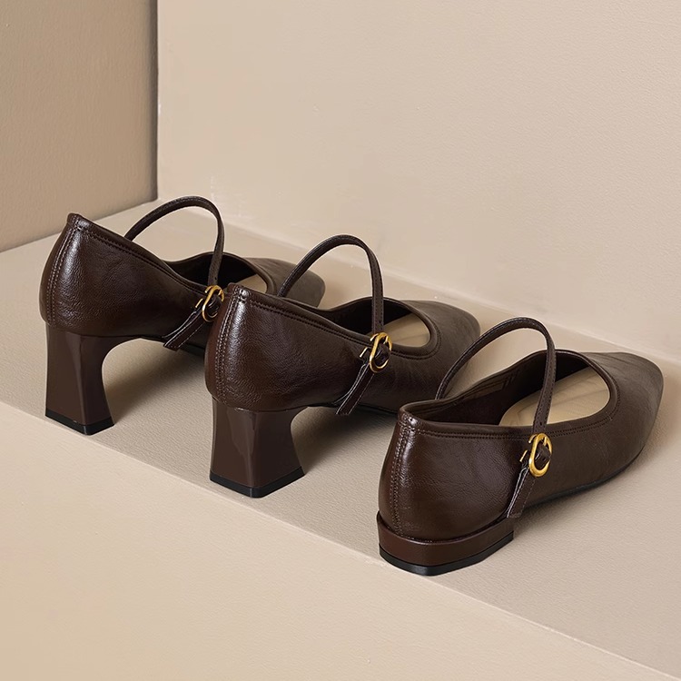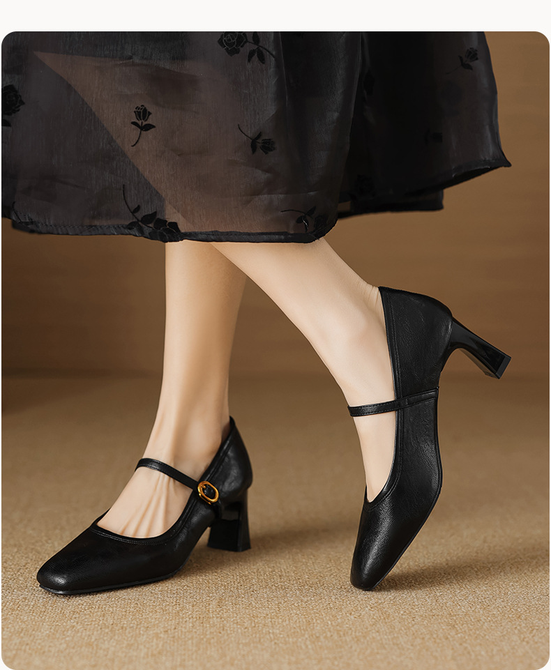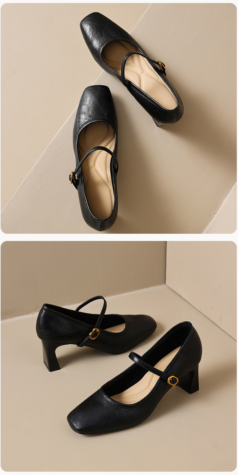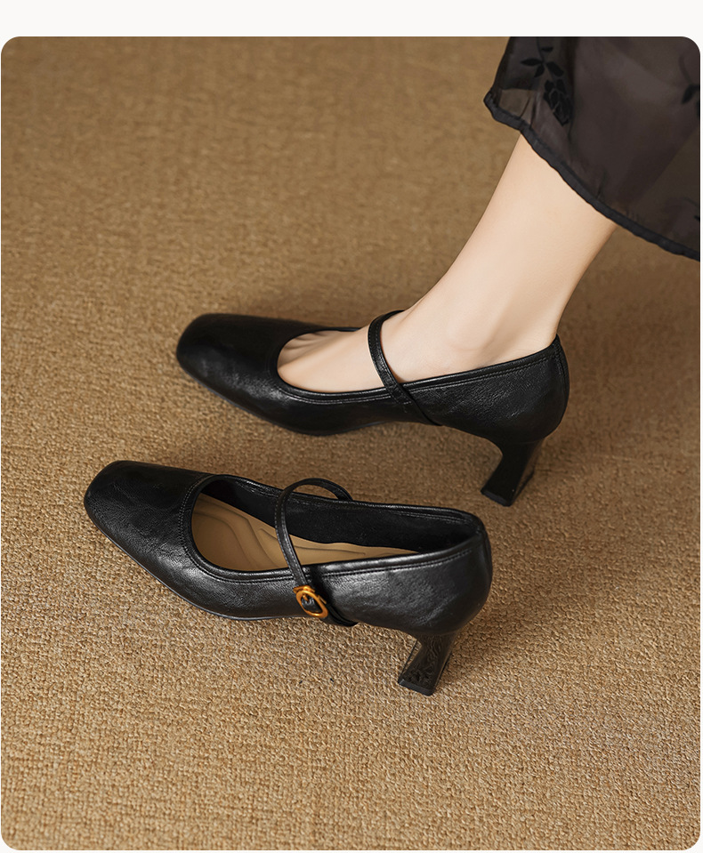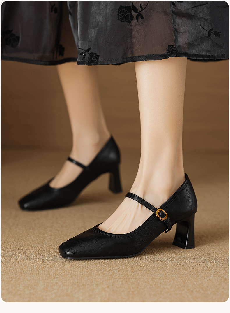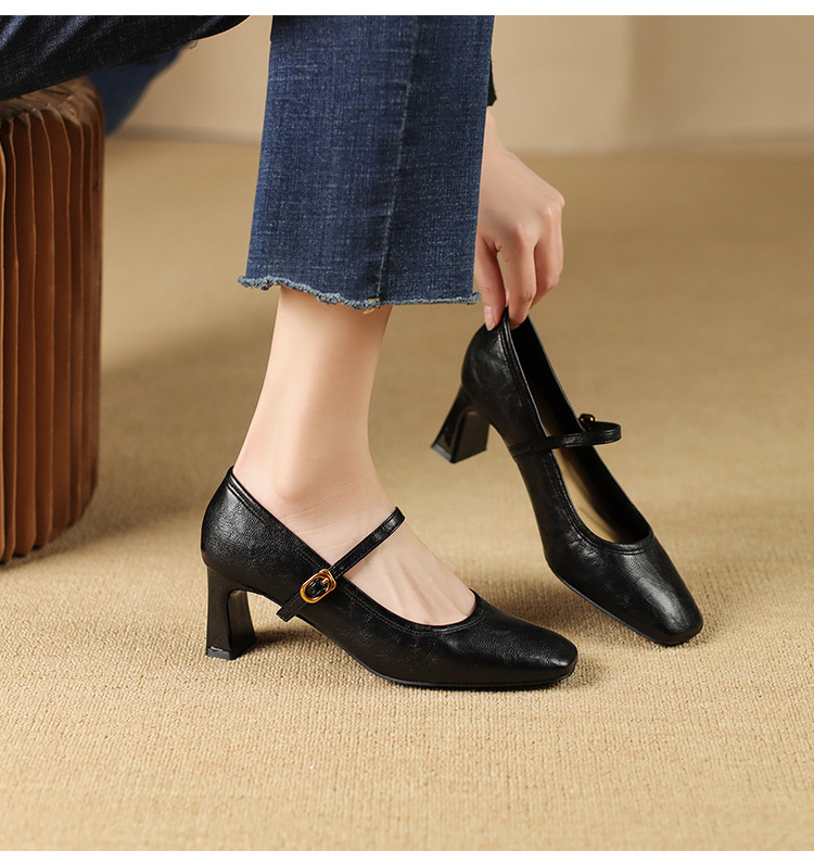 양가죽 ~ 프랑스 복고풍 블랙 하이힐 2025 봄 한 단어 통근 작업 두꺼운 힐 메리 제인 신발