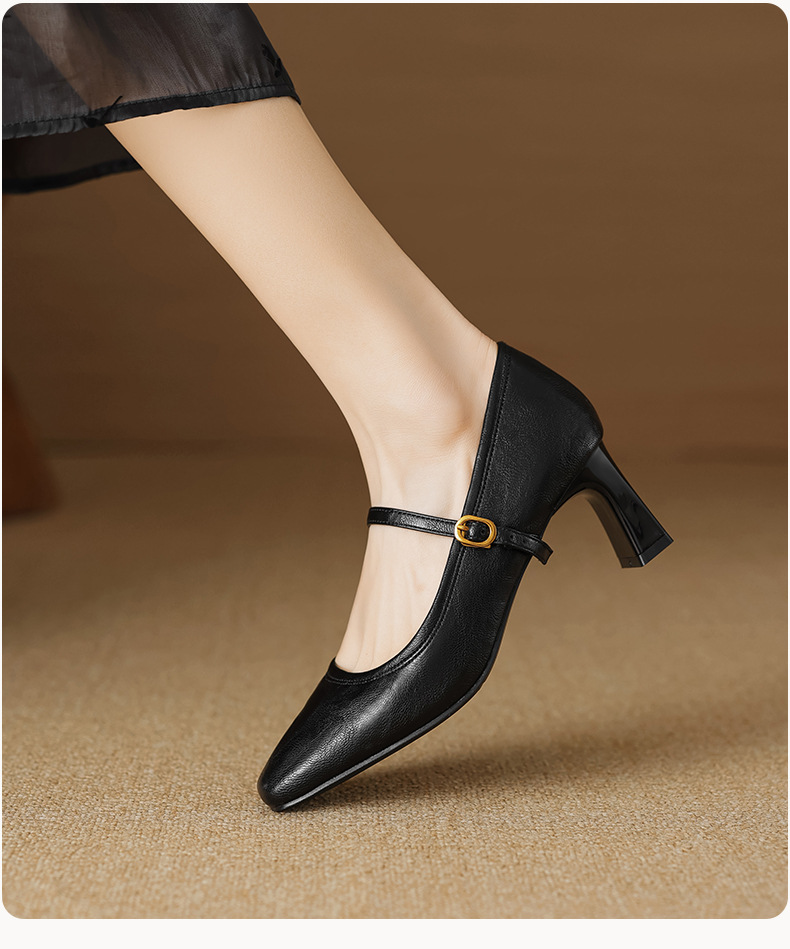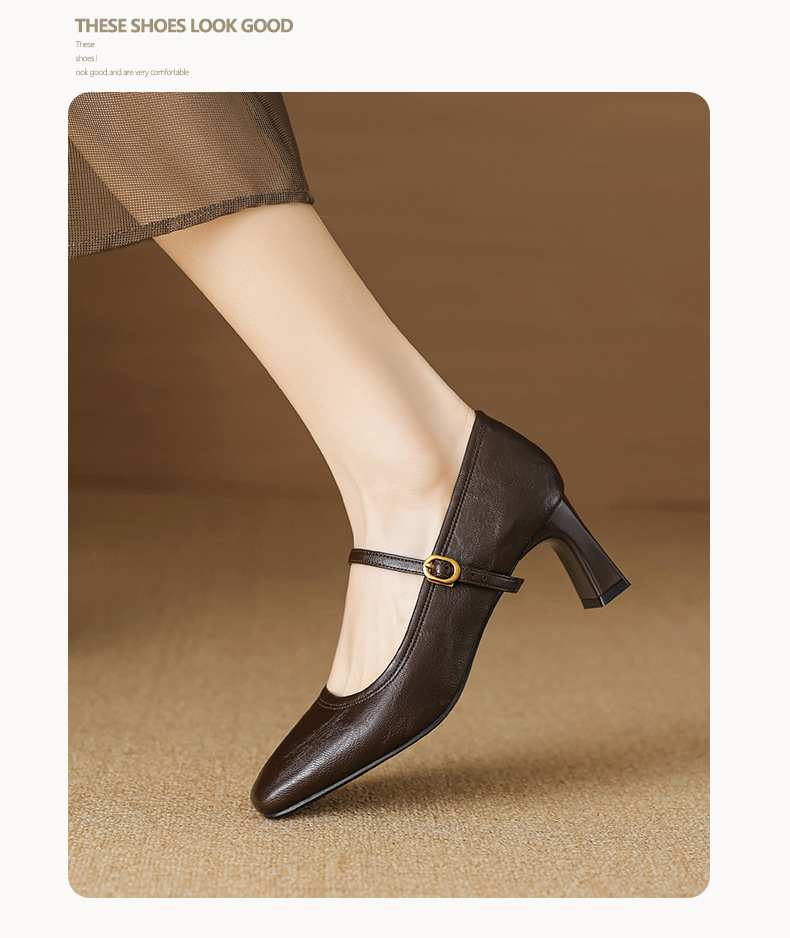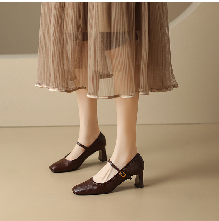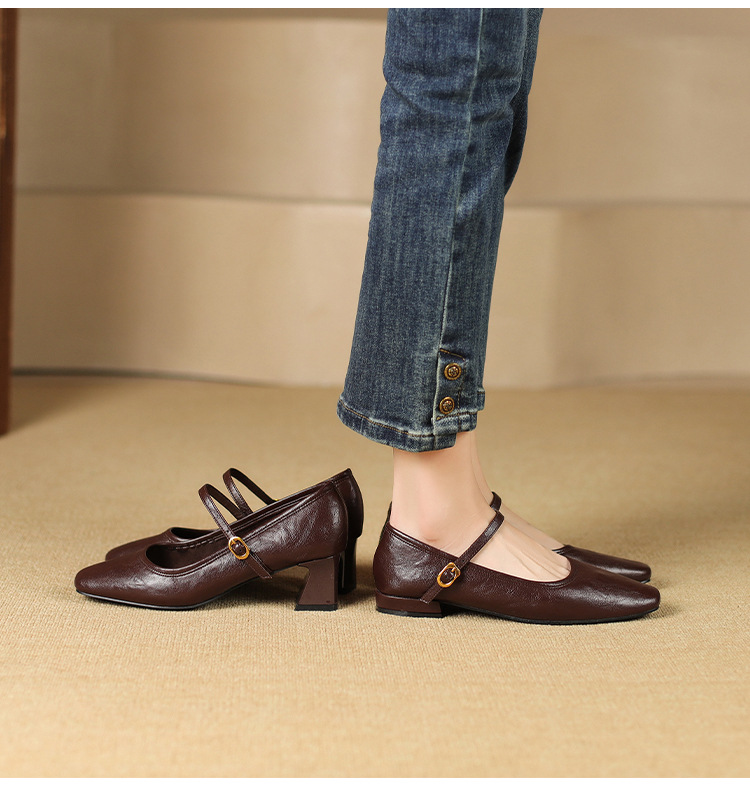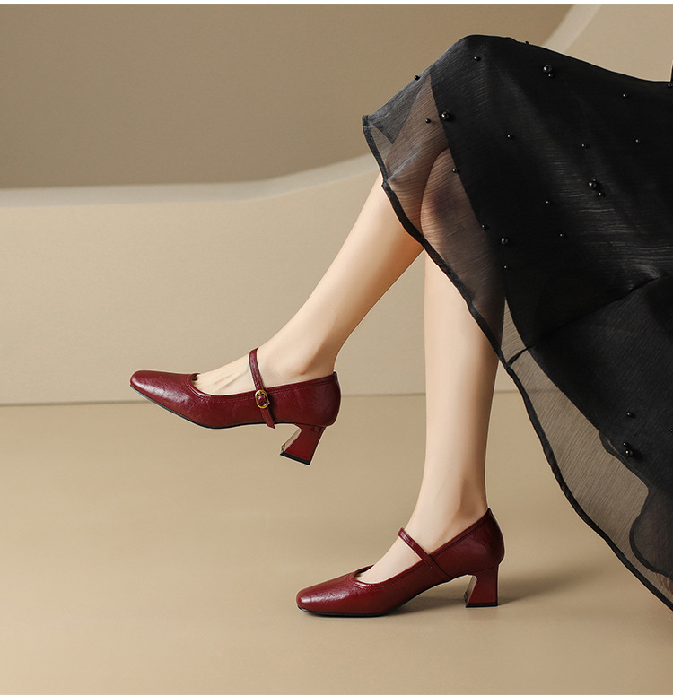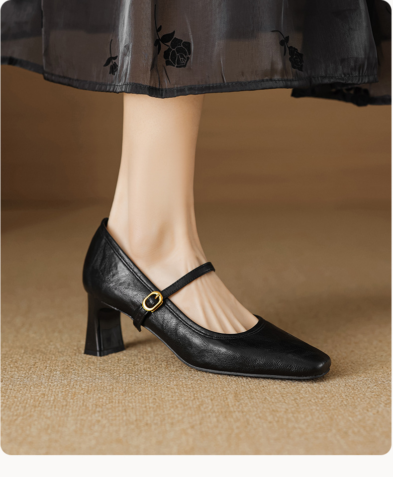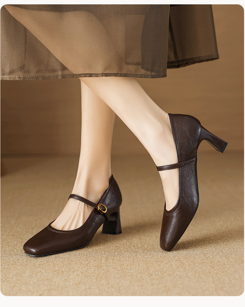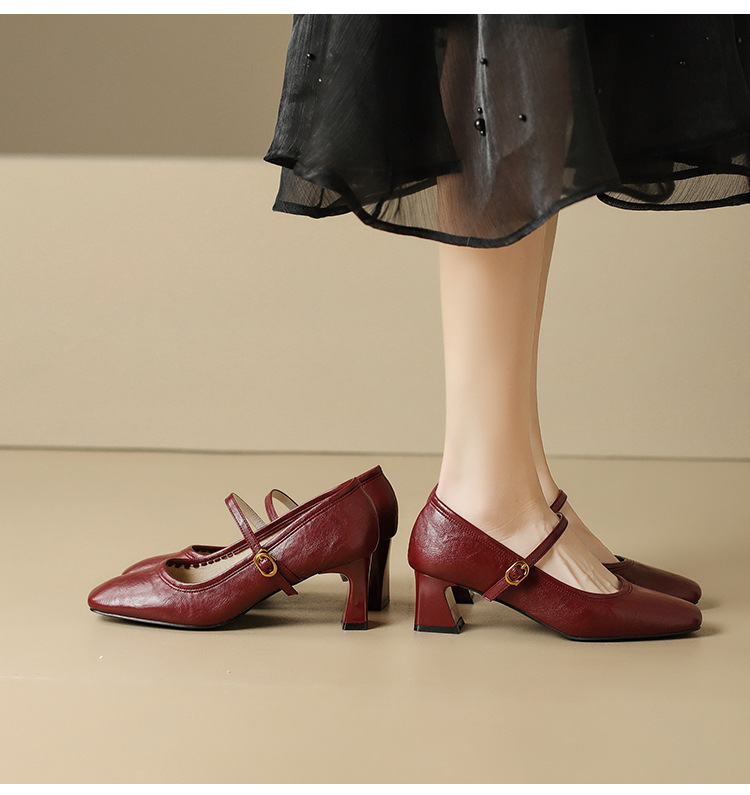 양가죽 ~ 프랑스 복고풍 블랙 하이힐 2025 봄 한 단어 통근 작업 두꺼운 힐 메리 제인 신발
