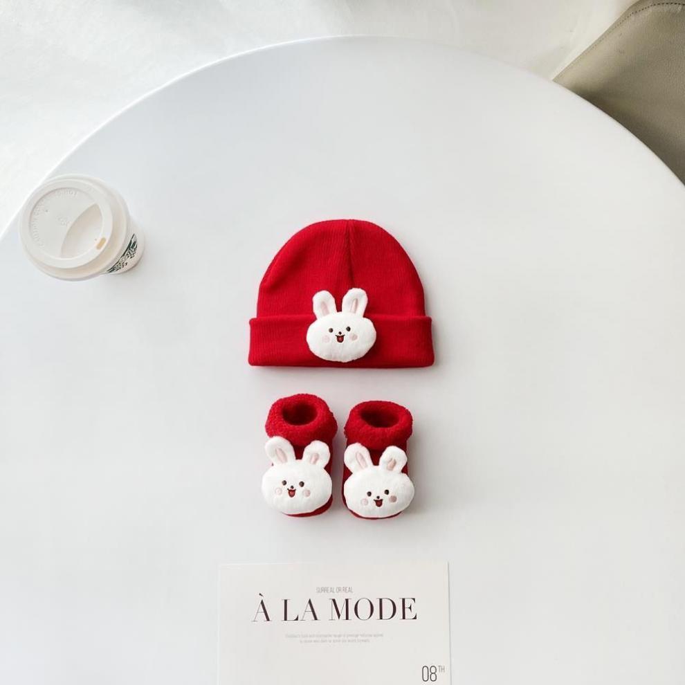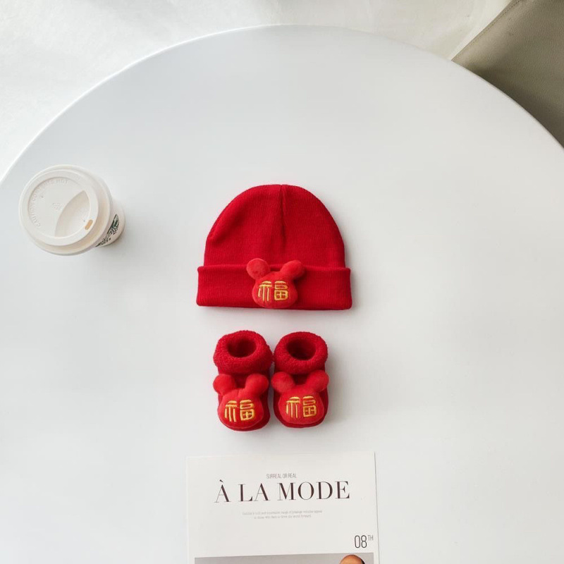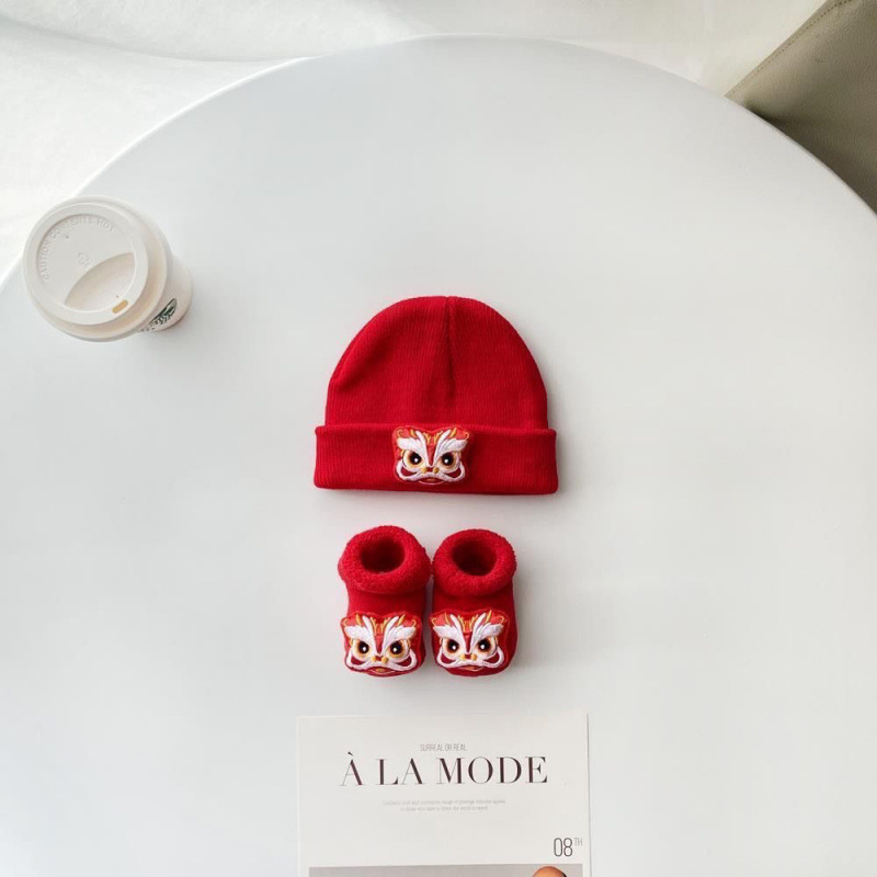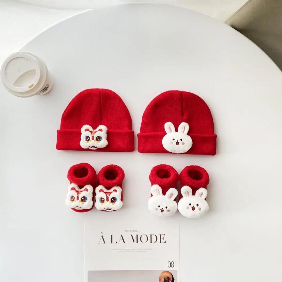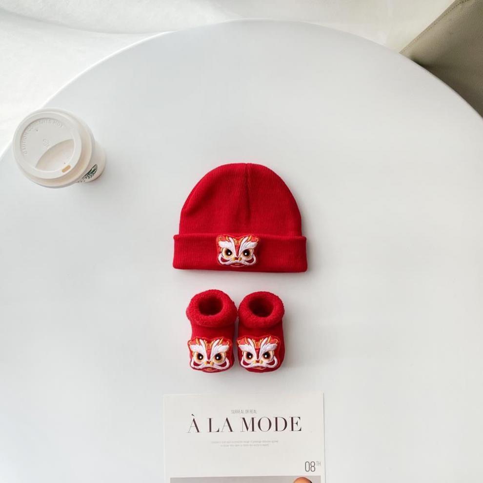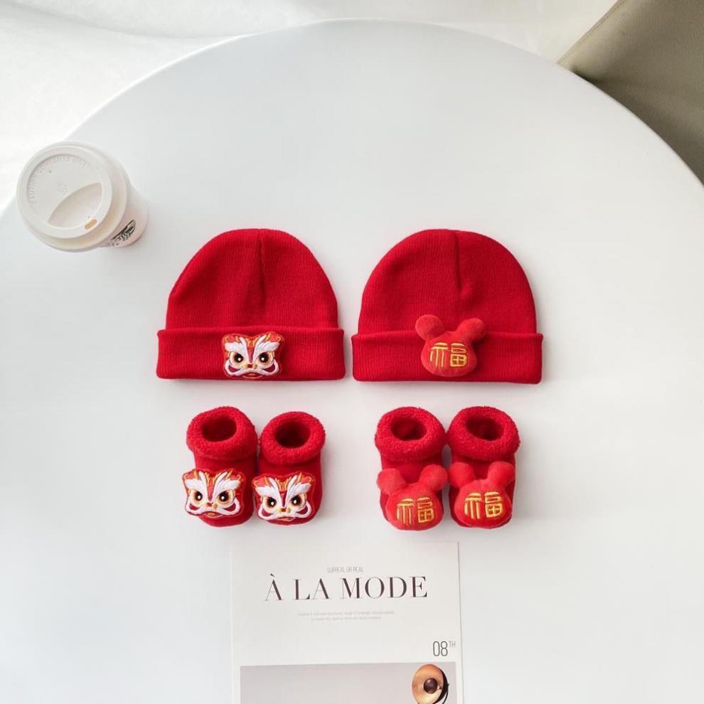 红色婴儿帽子秋冬款针织帽厚袜子男女童小月龄宝宝毛线帽满月百天