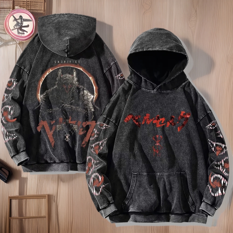 Anime Sword 스타일 전설 Hoodie Berserk Raging Print Harajuku Washed Hooded Sweatshirt 남성용스토어 가기