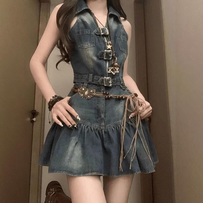 홍콩 스타일 빈티지 데님 민소매 조끼 셔츠 여성의 여름 새로운 달콤한 스파이스 소녀 짧은 슬림 핏 넥 조끼 탑