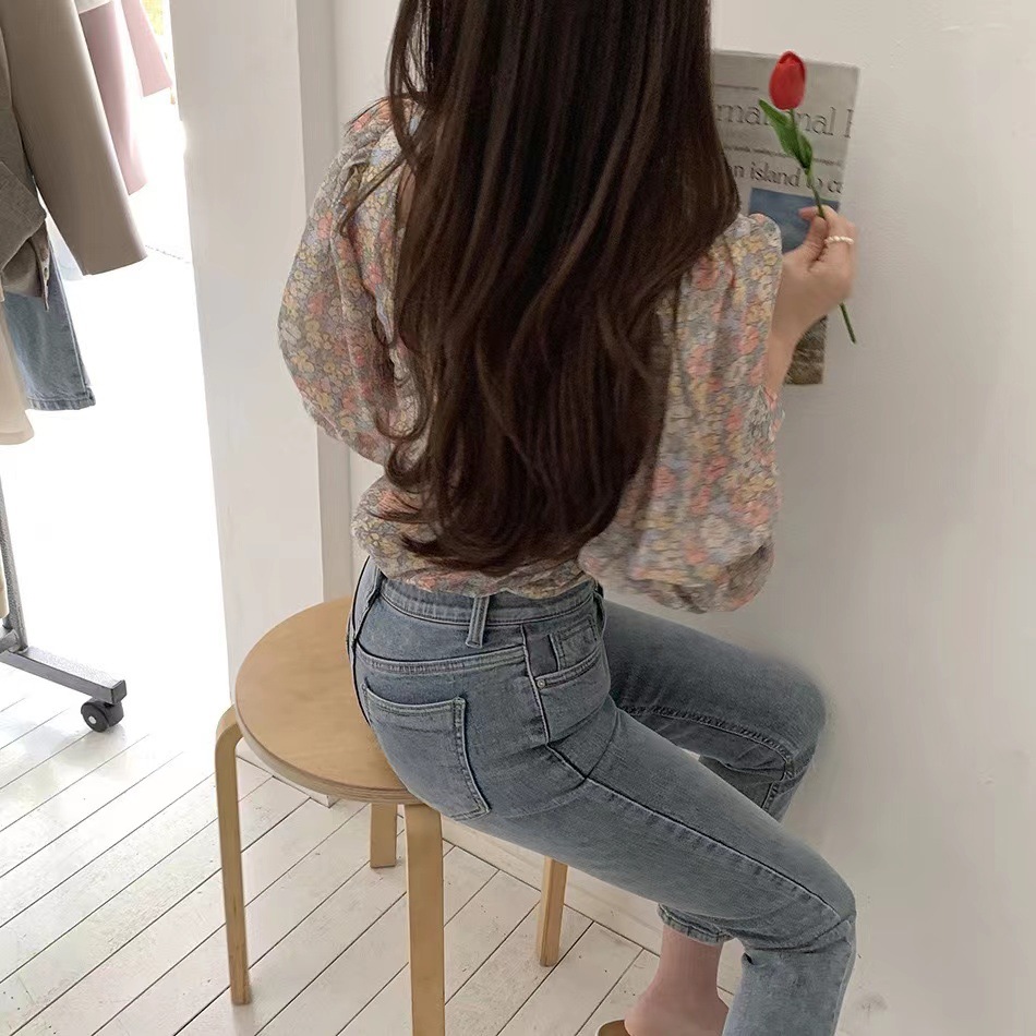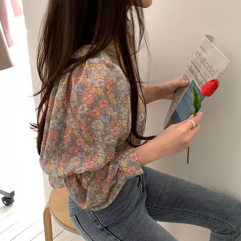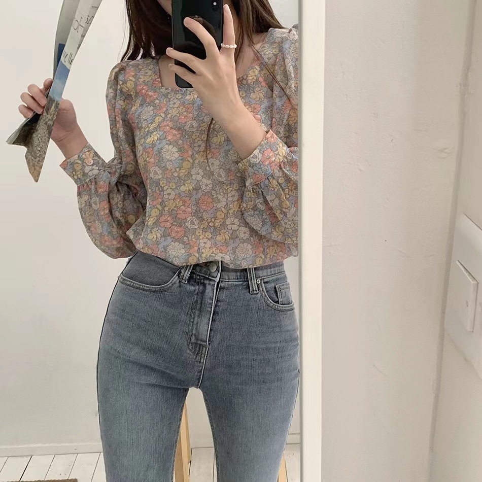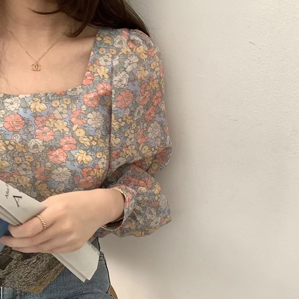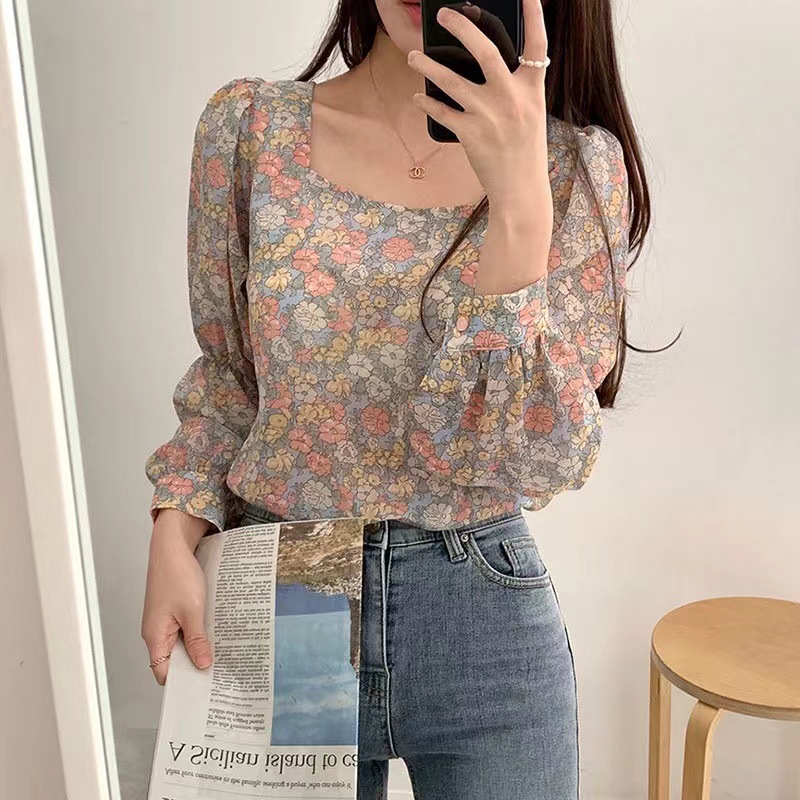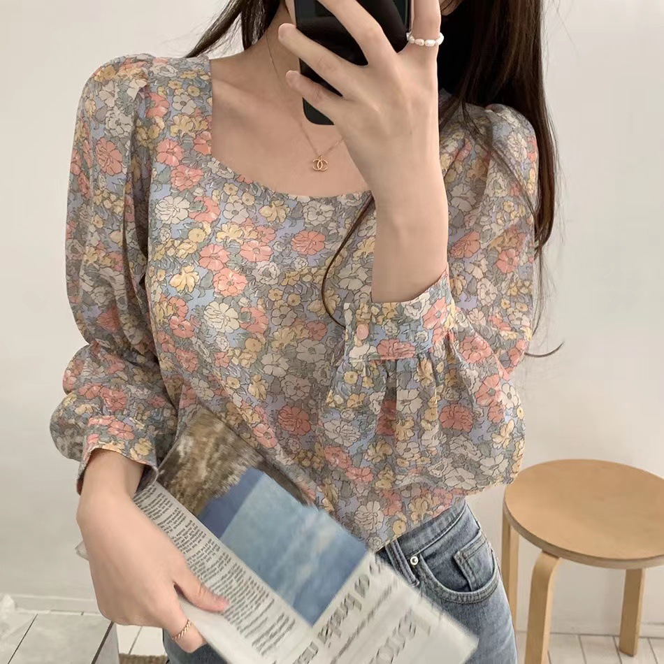 한국 세련된 Vit 소녀 가을 달콤한 나이를 줄이는 꽃 빈티지 스퀘어 칼라 긴팔 셔츠 루즈 쉬폰 탑스토어 가기
