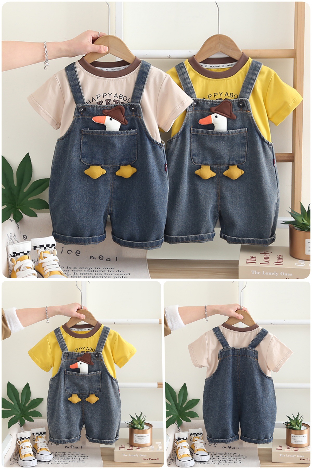 5 개의 작은 7 개의 아동복 2025 여름 새로운 0-4 세 소년 소녀 편지 오리 스트랩 데님 2 피스 세트